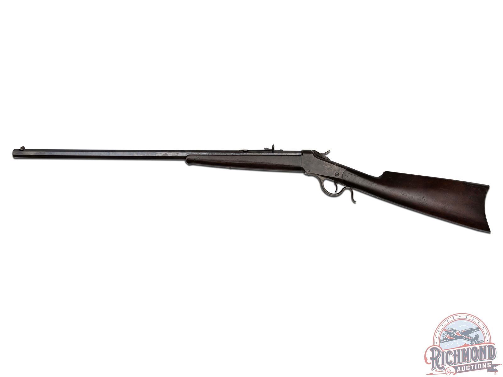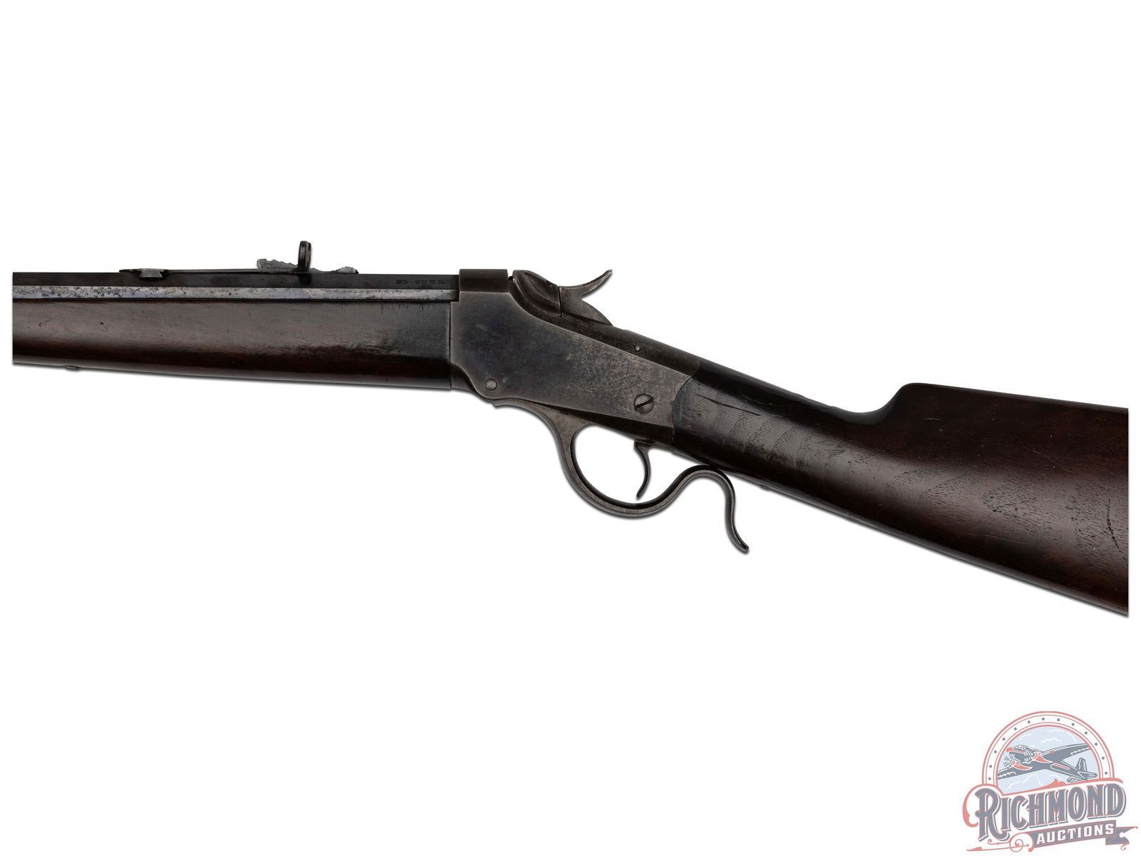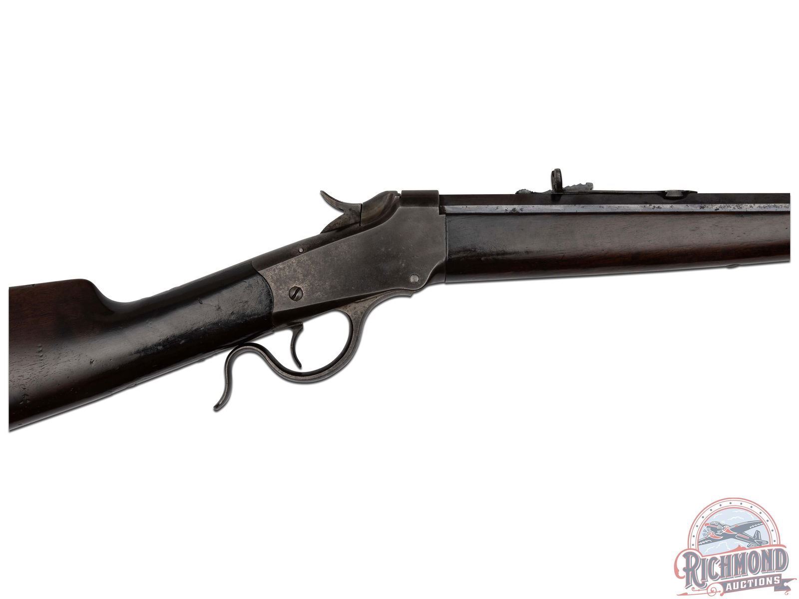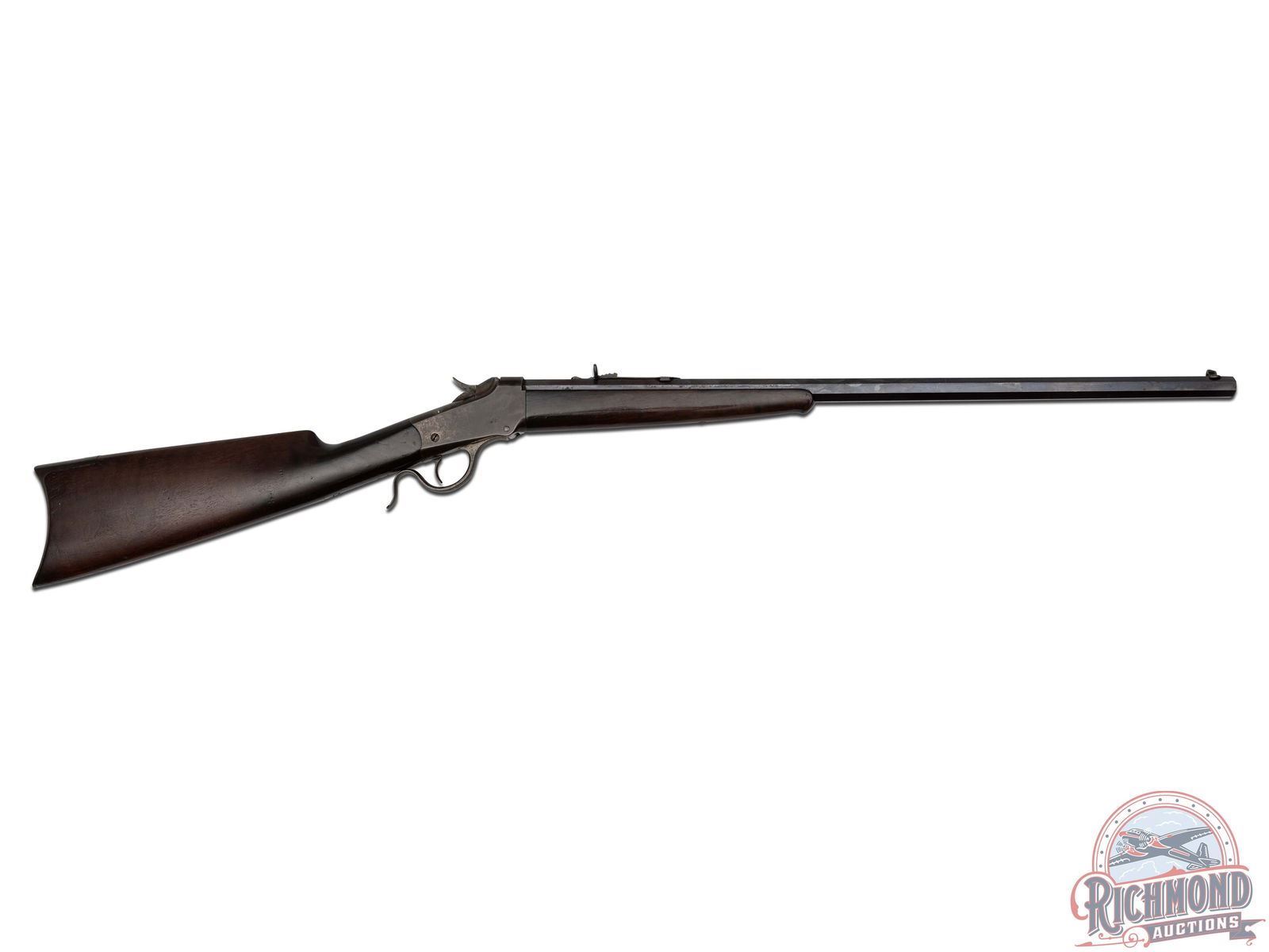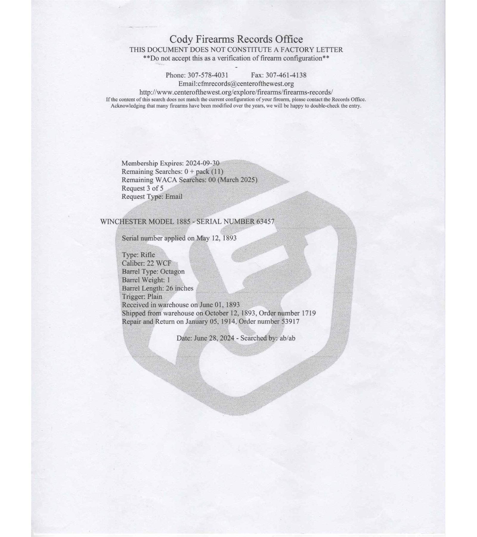 Manufactured in 1893. This antique low wall features a 26" blued octagon barrel chambered for the .25-20 Single Shot cartridge. Barrel weight No. 1, stamped on the bottom. Two-line Winchester address stamped on the left barrel flat and Winchester proof marks stamped on both the barrel and receiver. Rear adjustable semi-buckhorn sight and blade front sight. Straight walnut stock fitted with original crescent metal butt plate. Matching wood forearm with Schnabel tip. Cody Museum quick check letters as a 22 WCF caliber, but does show a return and repair dated January 5, 1914. It is factory stamped "REBORE" under the forearm with JPP inspection marks. LOP: 13". CALIBER: 25-20 SS. S/N: 63457. FFL STATUS: Antique.