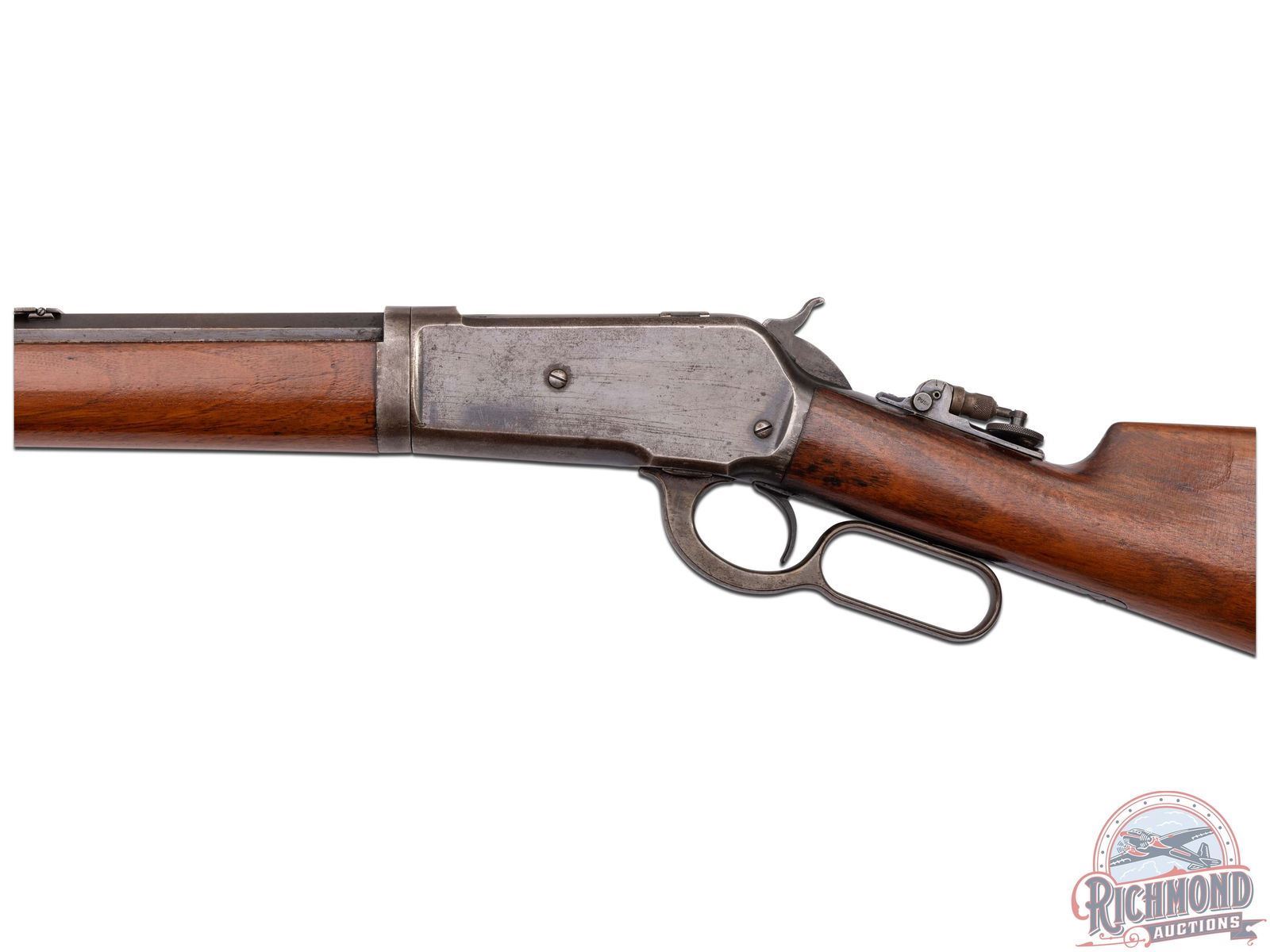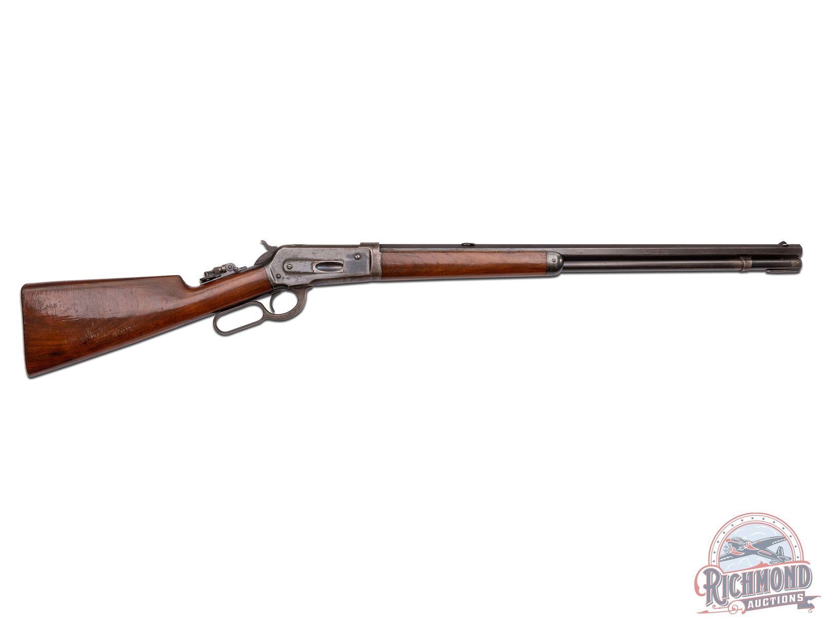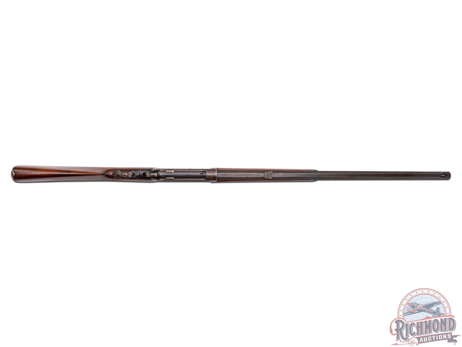 This take-down sporting rifle was Manufactured in 1895. Features a 26" blued octagon barrel with factory rear tang mounted Lyman peep sight, #6 leaf sight and front blade sight. Full length magazine tube. Top of the barrel is stamped " -MANUFACTURED BY THE- / -WINCHESTER REPEATING ARMS CO NEW HAVEN, CONN. U.S.A.-" and rear of the barrel is restamped "45-90 WCF". Blued receiver with side loading gate. Back of trigger guard is stamped "PAT. OCT. 4, 1894 / JAN. 20, 1885-" and serial number "101677" in script. Per factory quick check - custom ordered with shotgun butt stock. Walnut wood stock and forearm with cap. Includes factory quick check letter that gives provenance to this original factory rifle! LOP: 13". CALIBER: 45-90 WCF. S/N: 101677. FFL STATUS: Antique.