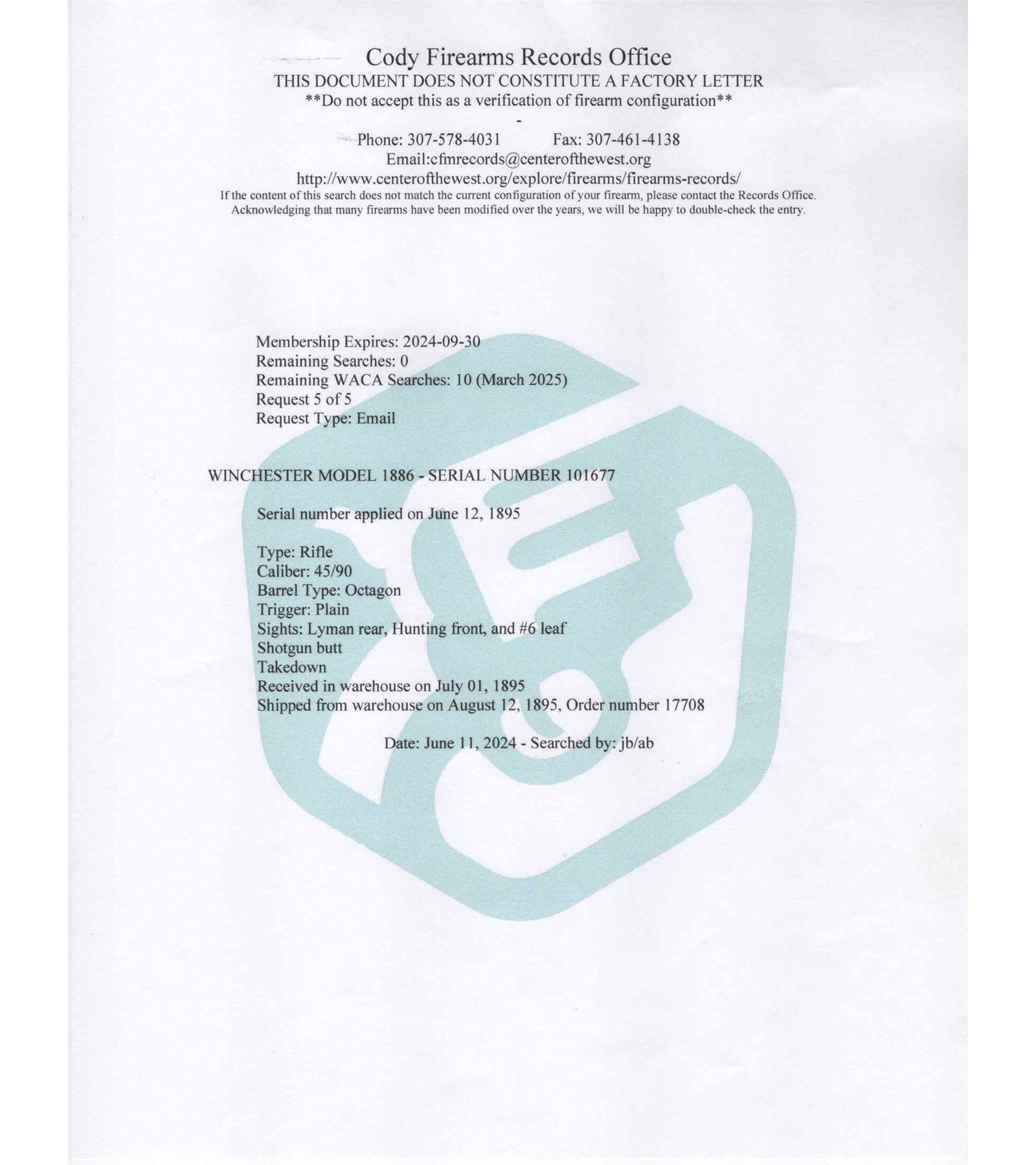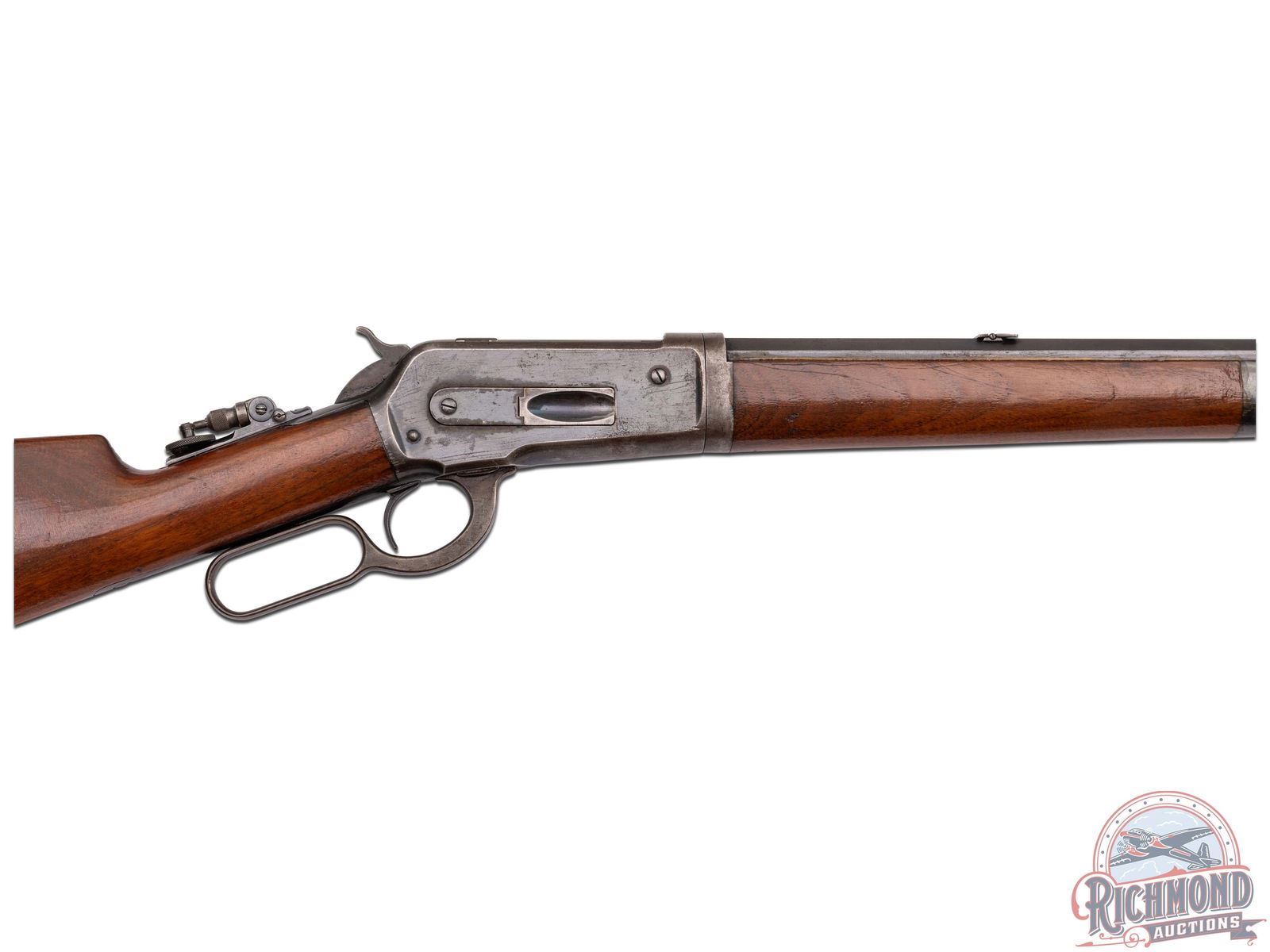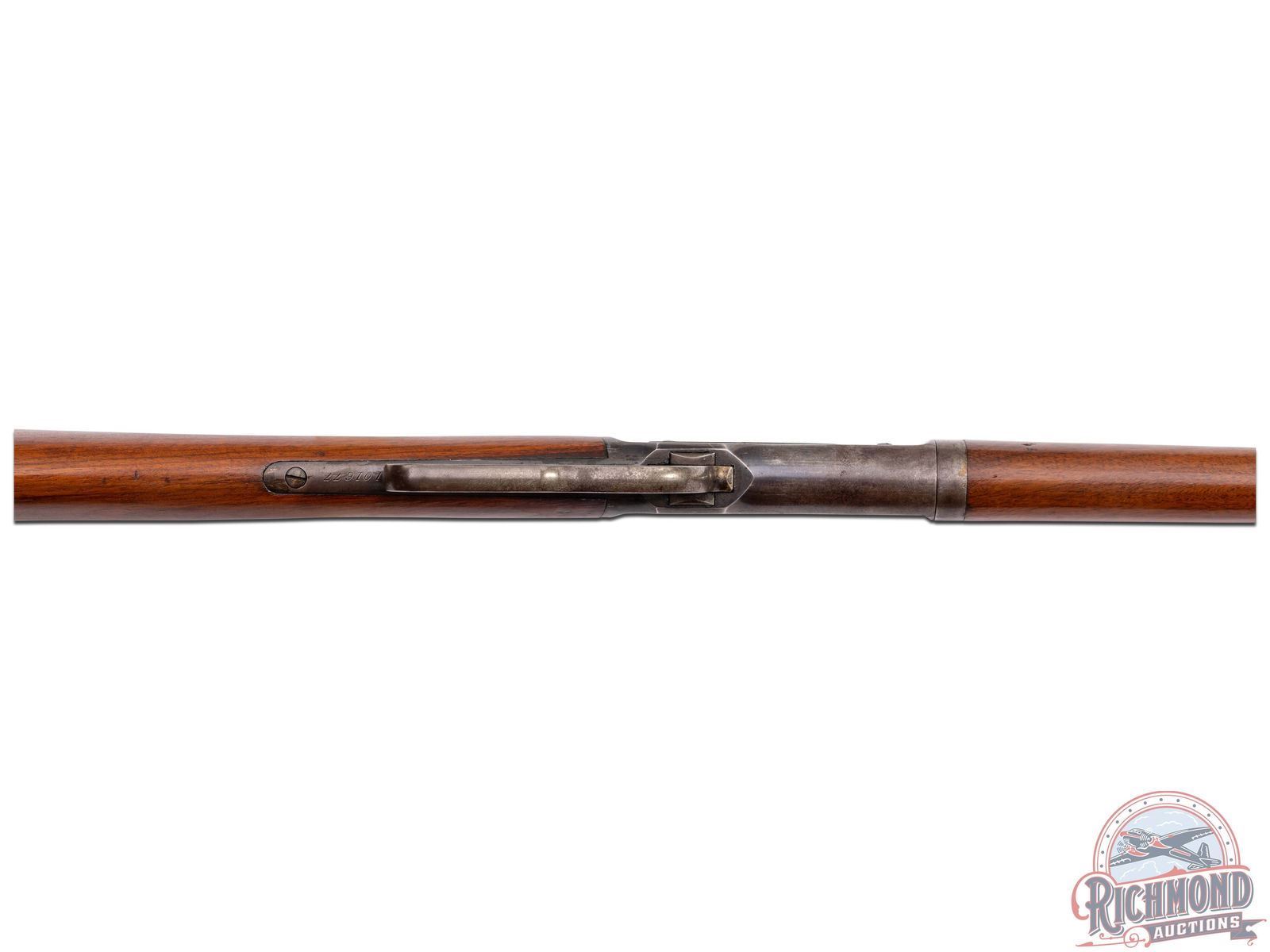This take-down sporting rifle was Manufactured in 1895. Features a 26" blued octagon barrel with factory rear tang mounted Lyman peep sight, #6 leaf sight and front blade sight. Full length magazine tube. Top of the barrel is stamped " -MANUFACTURED BY THE- / -WINCHESTER REPEATING ARMS CO NEW HAVEN, CONN. U.S.A.-" and rear of the barrel is restamped "45-90 WCF". Blued receiver with side loading gate. Back of trigger guard is stamped "PAT. OCT. 4, 1894 / JAN. 20, 1885-" and serial number "101677" in script. Per factory quick check - custom ordered with shotgun butt stock. Walnut wood stock and forearm with cap. Includes factory quick check letter that gives provenance to this original factory rifle! LOP: 13". CALIBER: 45-90 WCF. S/N: 101677. FFL STATUS: Antique.