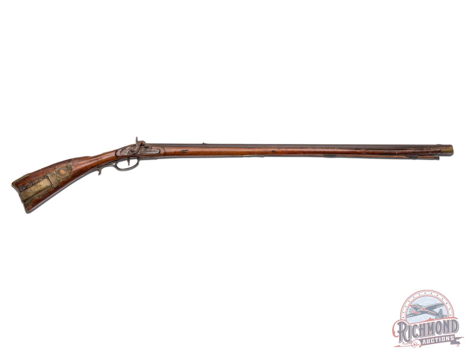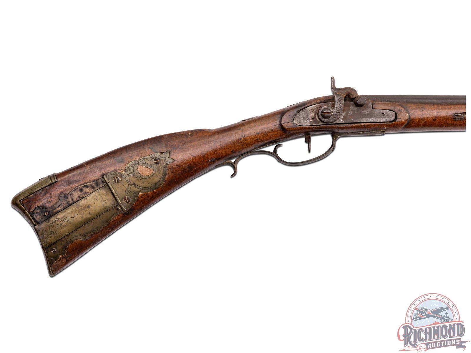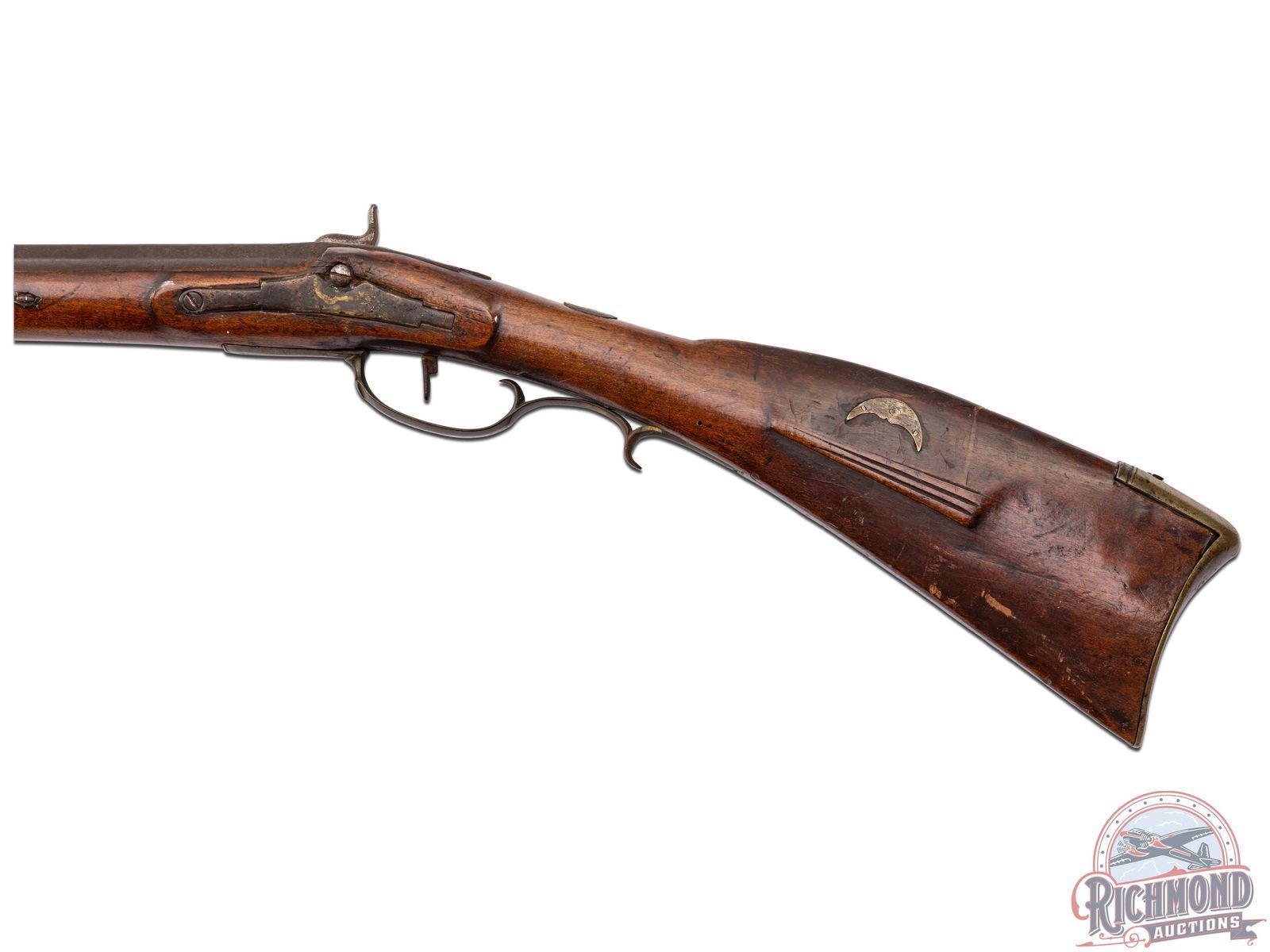 Percussion Kentucky attributed to Henry Albright measuring 54" overall with 39-1/2" octagon 60 caliber smoothbore barrel with hunting sights. Unmarked percussion lock with single trigger control. Full maple stock with brass hardware including a four piece patchbox with horse head finial often used by Albright. Stock has coin silver moon inlay on cheek and silver thumbpiece. Comes with hardwood ramrod. CALIBER: 60. FFL STATUS: Antique.
