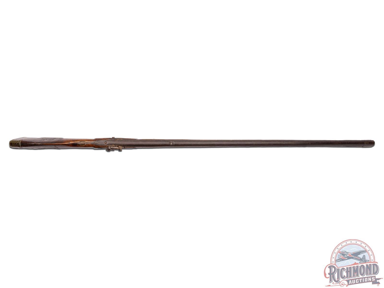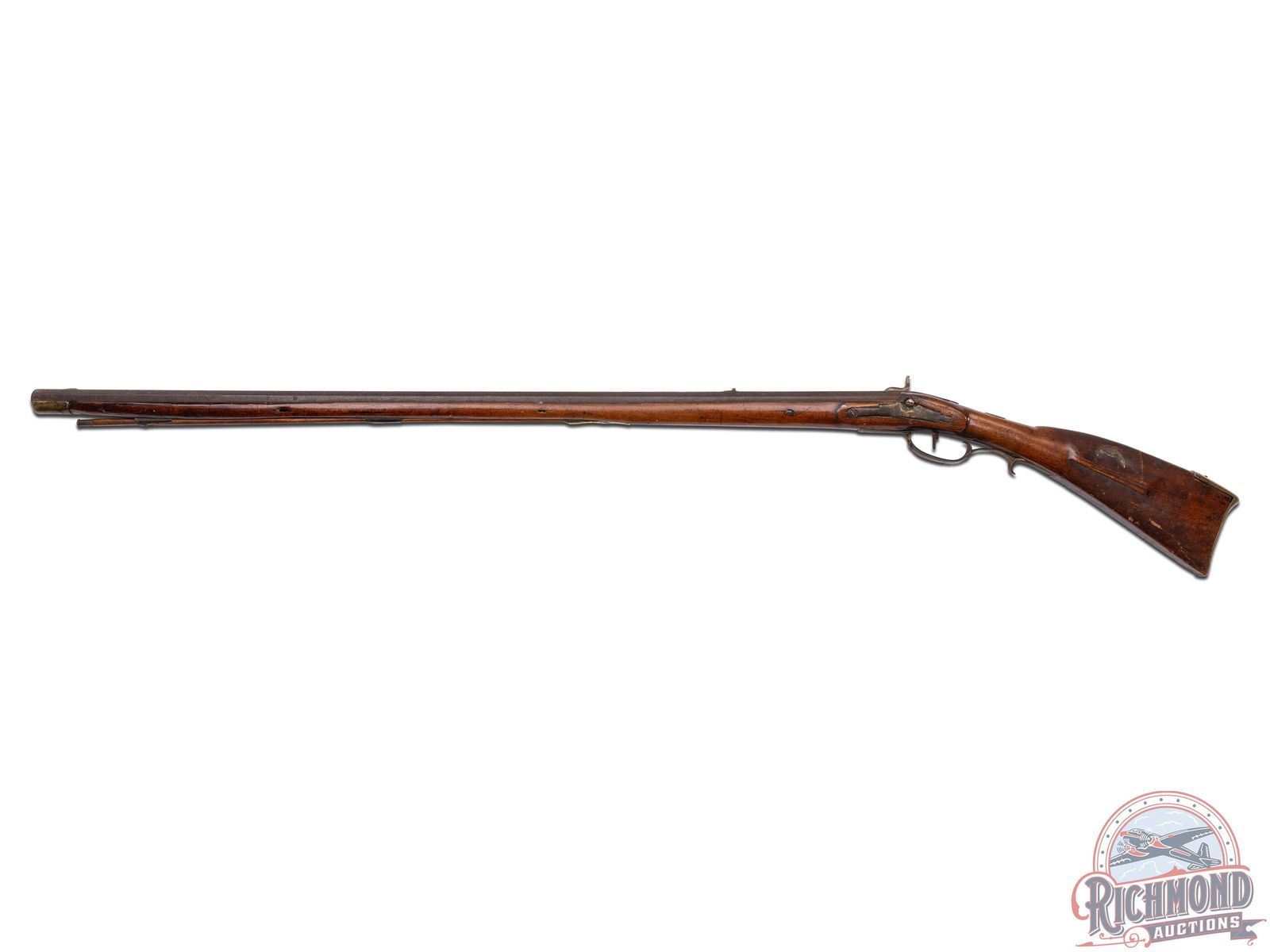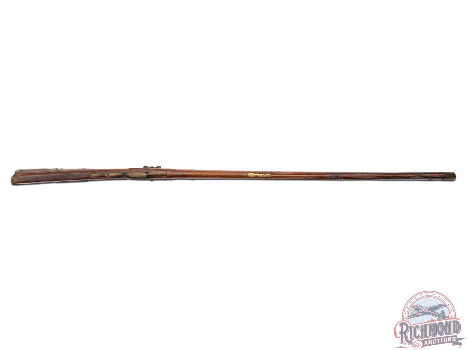 Percussion Kentucky attributed to Henry Albright measuring 54" overall with 39-1/2" octagon 60 caliber smoothbore barrel with hunting sights. Unmarked percussion lock with single trigger control. Full maple stock with brass hardware including a four piece patchbox with horse head finial often used by Albright. Stock has coin silver moon inlay on cheek and silver thumbpiece. Comes with hardwood ramrod. CALIBER: 60. FFL STATUS: Antique.