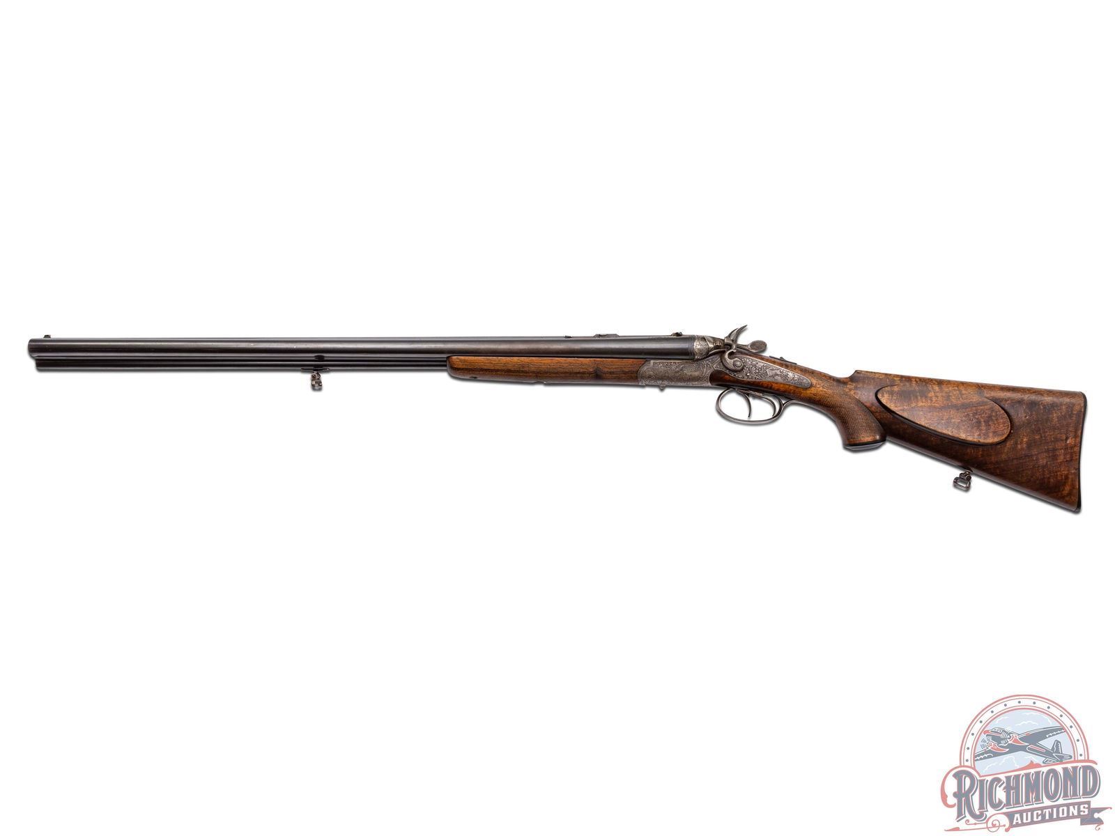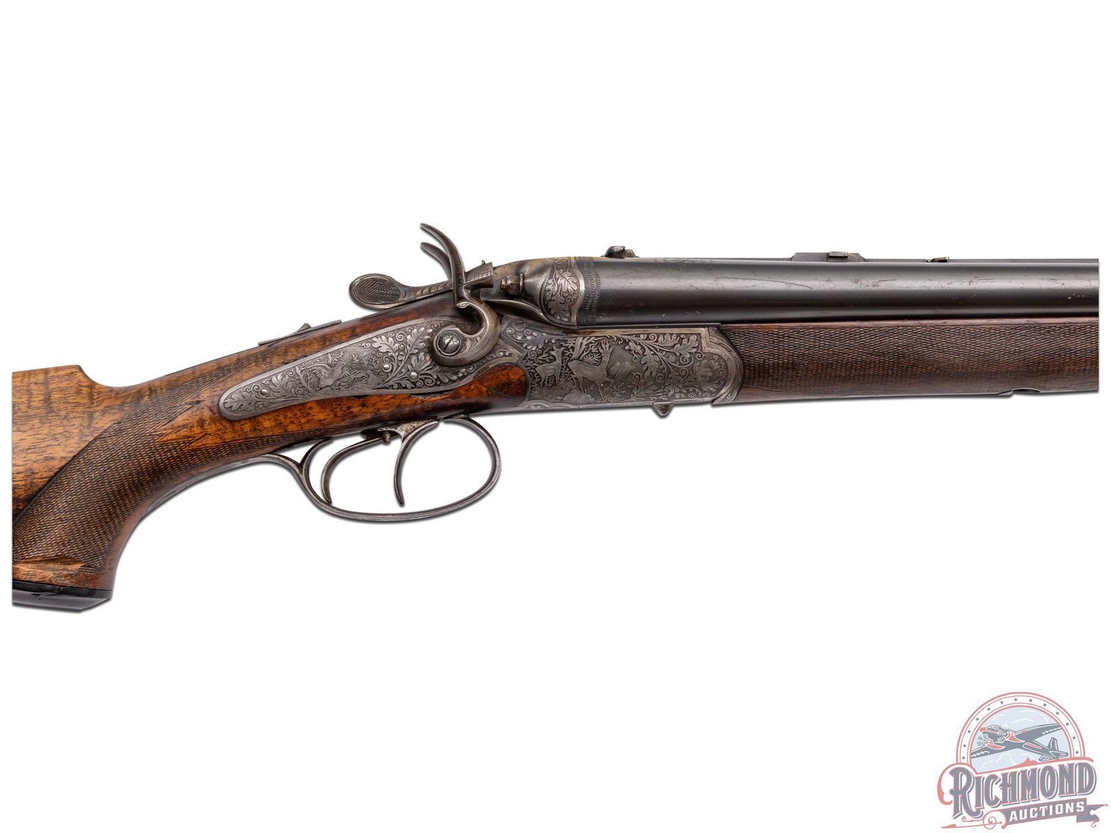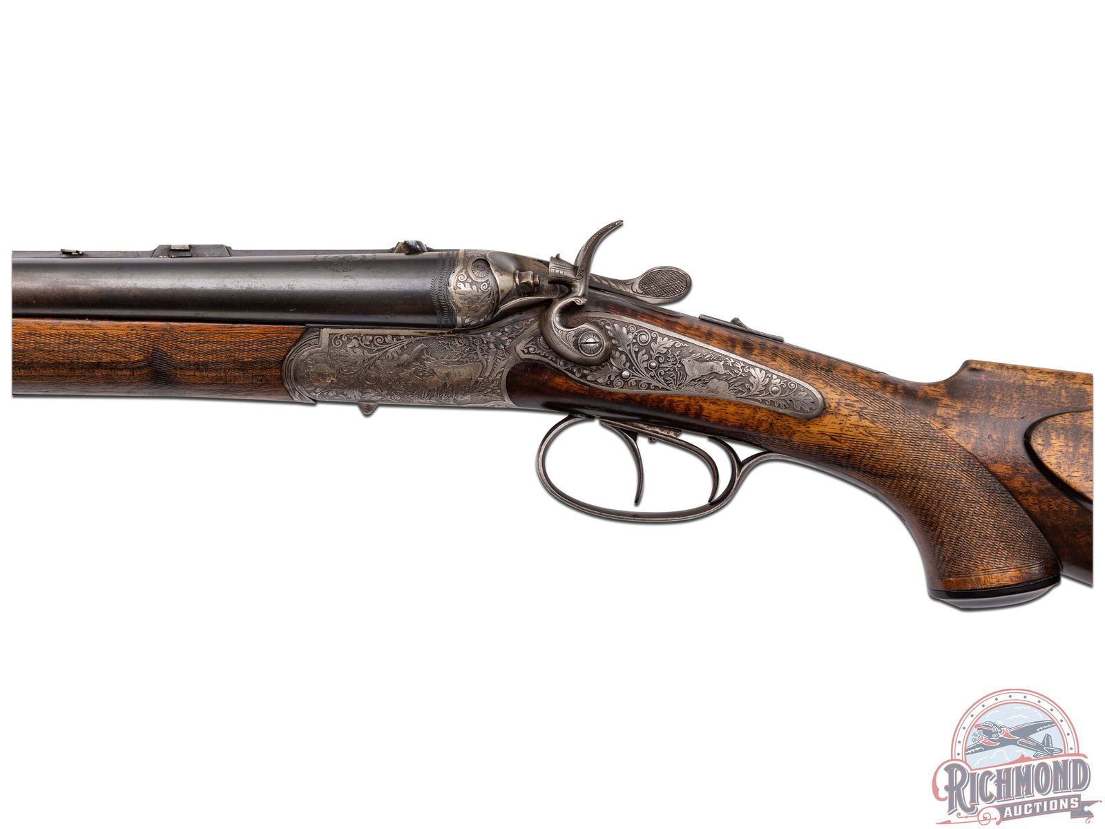 Made in Linz, Austria by an unknown gunsmith in 1930. Barrel has part of a name "-Rucksess-Linz UrFahr" covered by scope mount. Gun has blued 26-3/4" Bohler steel barrels with 16 by 16 gauge barrels over 8x57JR rifle. Barrels have matted rib, rifle sights, scope mounts, sling swivels, and extractors. Case-hardened round body external hammer action with heavy chiseled game scene engraving, side clips, double trigger (front is set), tang barrel selector, and steel Oak Leaf engraved trigger guard. Walnut checkered pistol grip stock with right hand cheekpiece, and plastic butt plate. Matching walnut checkered splinter forearm with latch release. LOP: 13-1/2". DAC: 1-1/4". DAH: 2-1/4". CALIBER: 16/8x57JR. S/N: 111431. FFL STATUS: Curio & Relic.