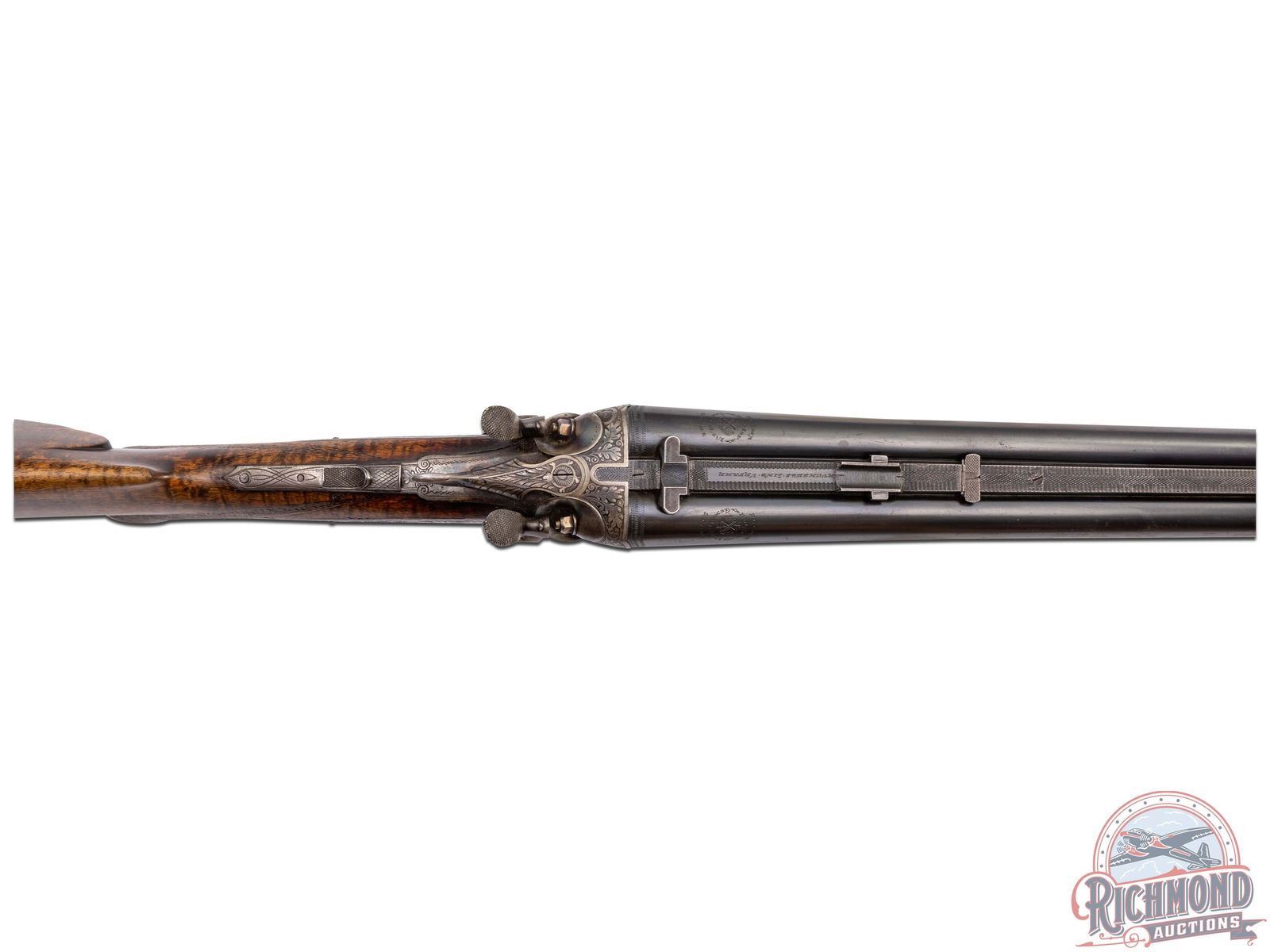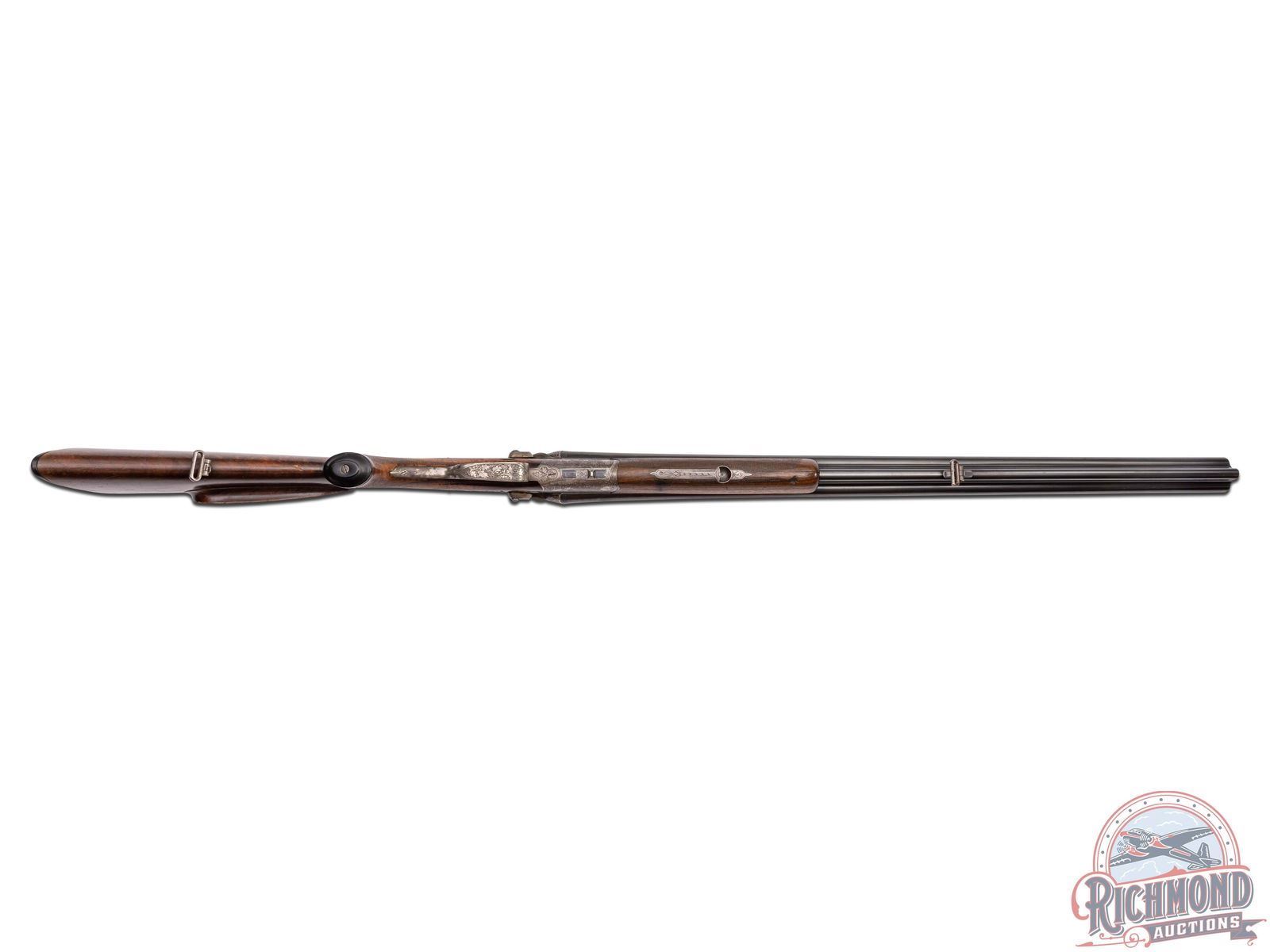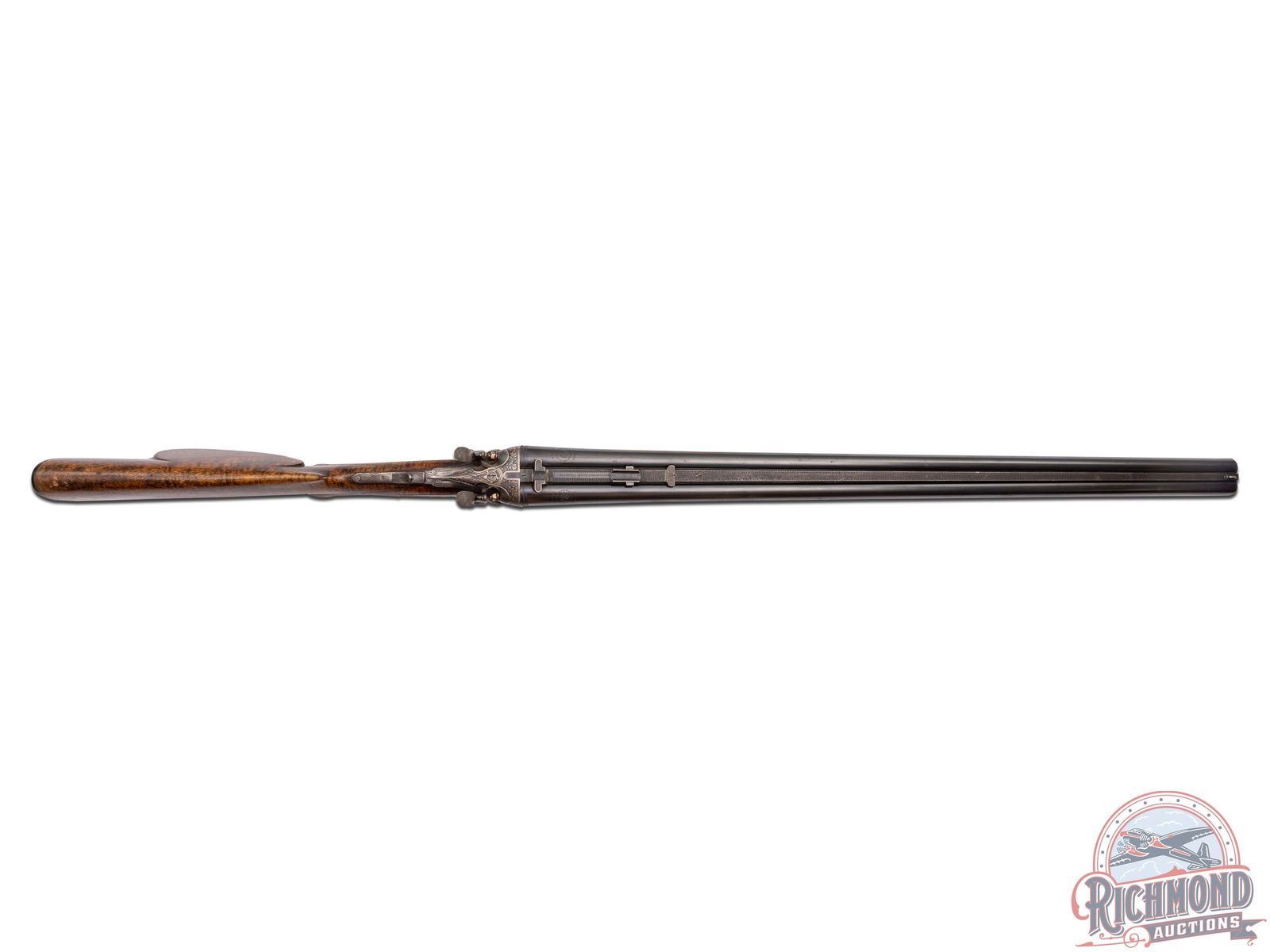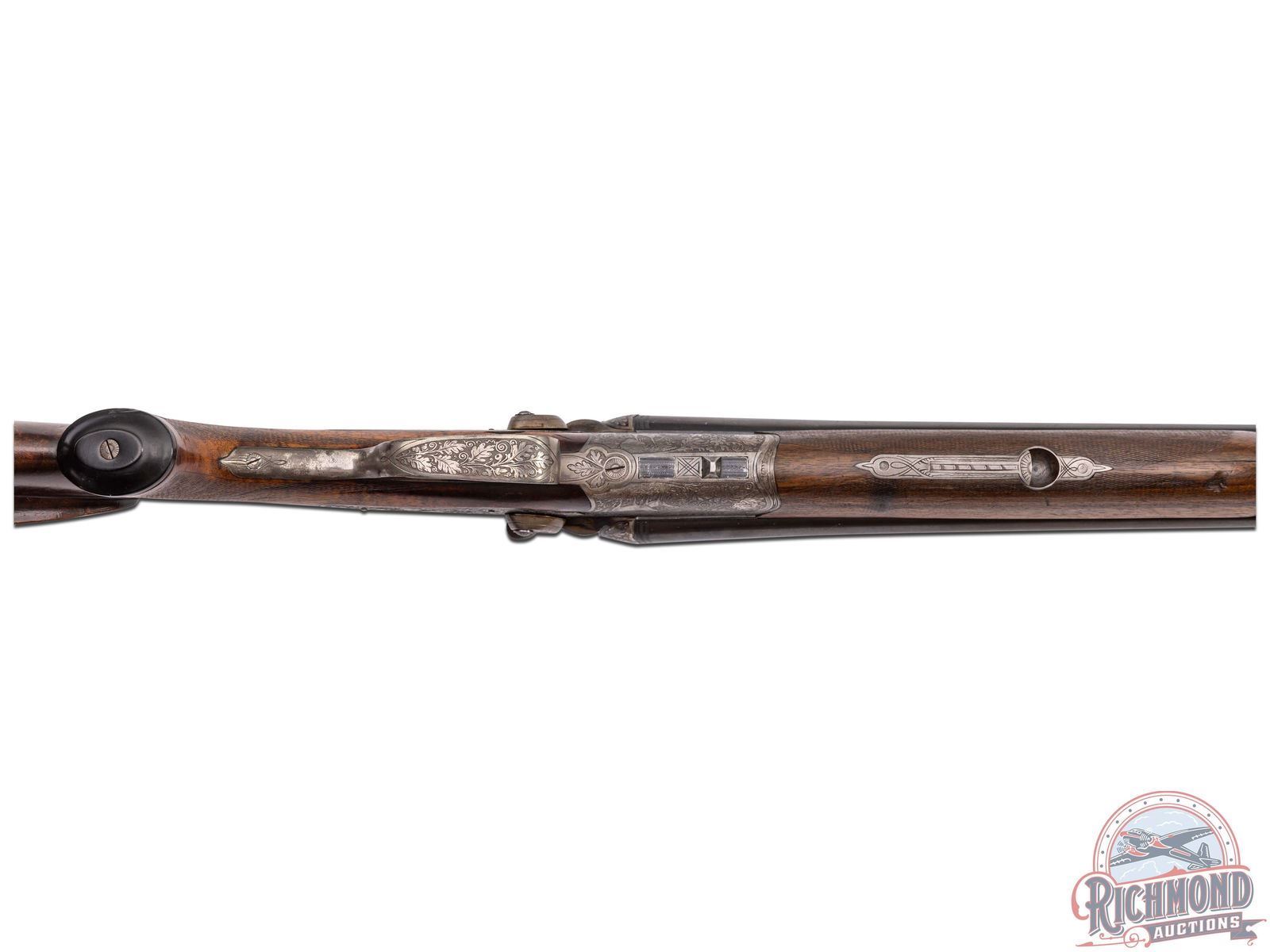 Made in Linz, Austria by an unknown gunsmith in 1930. Barrel has part of a name "-Rucksess-Linz UrFahr" covered by scope mount. Gun has blued 26-3/4" Bohler steel barrels with 16 by 16 gauge barrels over 8x57JR rifle. Barrels have matted rib, rifle sights, scope mounts, sling swivels, and extractors. Case-hardened round body external hammer action with heavy chiseled game scene engraving, side clips, double trigger (front is set), tang barrel selector, and steel Oak Leaf engraved trigger guard. Walnut checkered pistol grip stock with right hand cheekpiece, and plastic butt plate. Matching walnut checkered splinter forearm with latch release. LOP: 13-1/2". DAC: 1-1/4". DAH: 2-1/4". CALIBER: 16/8x57JR. S/N: 111431. FFL STATUS: Curio & Relic.