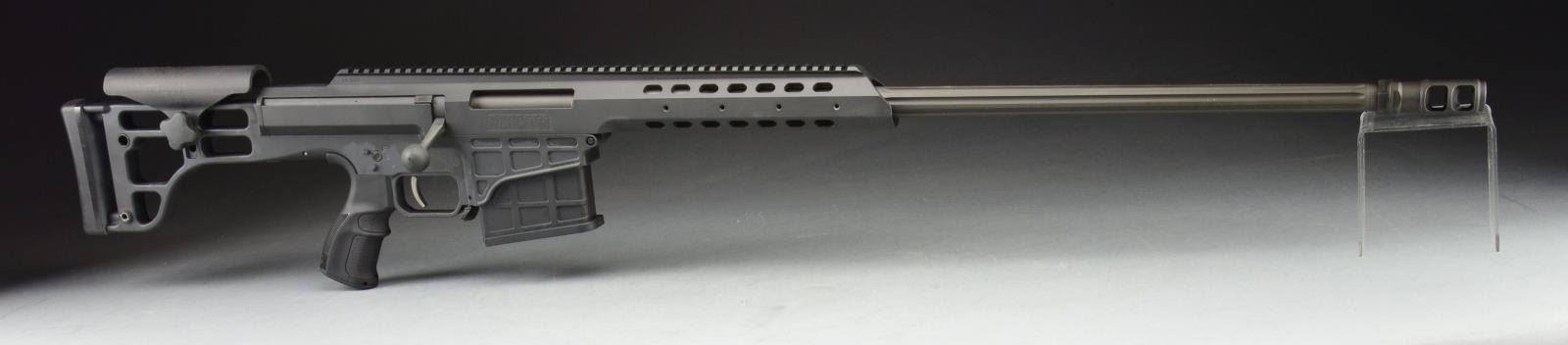 Cal. 338 Lapua Mag. S# 98B00004. Bbl. 27". Barrett Firearms is absolutely best known for their extremely high quality 50 BMG platforms however that is a long distance from where their innovation stops. W/ numerous other offerings, all tremendously well built, the focus of this particular exercise is to bridge the huge gap between an infantry-level load like the 5.56x45 MM or 7.62x51 NATO & the time honored & battle proven 50 BMG. While each have an area they excel in, the operational territory between the two is enormous. It would be extremely impractical & counter productive to issue a 50 BMG as a primary weapon & cal. but if a fair amount of longer-range work & at times fill an anti-material weapon role were possible w/ something that had a comparable weight & physical footprint w/ the current issued battle rifle then it may make sense. This is the role the Barrett M98B, chambered in .338 Lapua Mag was designed to fill. Weighing in at approximately 16 lbs. w/ its 1:10 rifled, fluted 27” bbl. & w/ a plethora of available ammunition options the 98B does just that. Utilizing an effective muzzle break design & well thought out stock this can be accomplished while keeping the recoil impulse to that of a 20 ga. shotgun. Feeding from a detachable box magazine allows mission specific ammunition to be called upon in an instant. The monolithic receiver assembly incorporates over 18" of picatinny rail to accommodate even the most technological load out. The distance capability of the system is immediately acknowledged w/ a 40 MOA adjustment built into the rail itself. Heat dissipation is addressed via 28 oval shaped cooling ports in the receiver over the breech area. Accessory rails may be added at 3/6/9:00 to suit any accessory necessity. The factory trigger is fully adj. & the owner’s manual details each adjustment making the procedure safe & easy. The shoulder stock w/ its soft rubber recoil pad utilizes a height adj. cheek piece to perfectly match shooter to the optics of choice. The pistol grip is checkered on the rear while inlet at the front w/ a stippled texture. The entire system is finished in a matching matte black color. Right side operated bolt action w/ manual reversible controls currently located on left side. Mag. release located at front of trigger guard. MAGS: 1 factory 10 rd. UNATTACHED ACCESSORIES: fitted Pelican transport case & factory owners manual. CONDITION: all aspects indicate extremely low usage if any any all. Exterior finish is complete & free of any noticeable blemishing. Telltale areas of normal usage such as debris buildup in muzzle brake chambers are absent. Finish wear on areas of mechanical intervention is also absent. Trigger is extremely light & crisp. Bore is shiny & strong rifling. (21-1589/JZ). MODERN. $3,000-4,000.