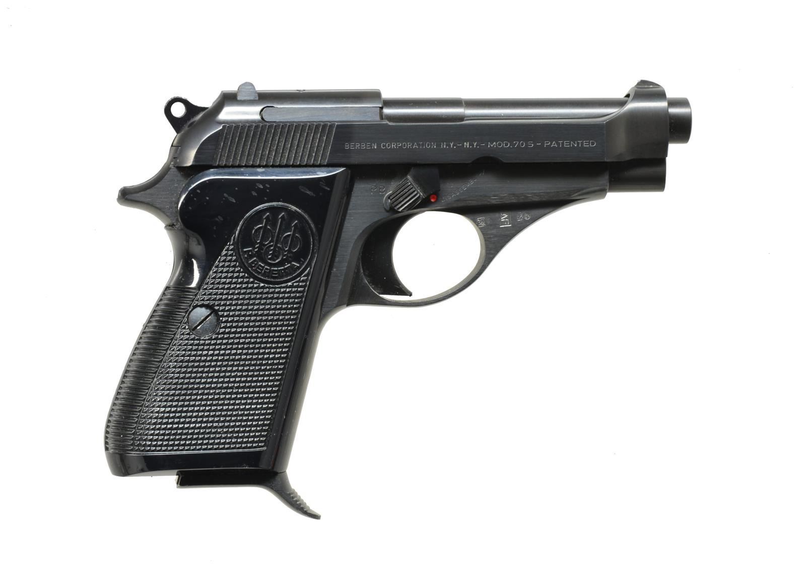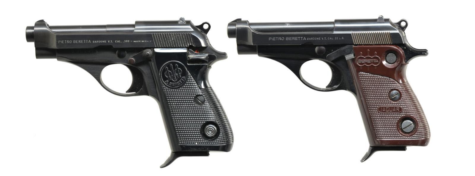 1) MODEL 70S. Cal. 380 ACP. S# A35397Y. Bbl. 3 1/2". Blade front sight & square notch rear sight. Blue steel frame & slide. 2 Piece checkered black plastic grips. MAGS: 1 detachable 9 rd. UNATTACHED ACCESSORIES: Beretta box w/ matching numbered label. Box contains paperwork & bore cleaning brush. CONDITION: 98% blue showing sm. marks on left side of rear sight & some distortion on grip screws. Grips show sm. spots of right panel. Bright near excellent bore. (21-1110/DS). 2) MODEL JAGUAR. Cal. 22 LR. S# F23712. Bbl. 3 1/2". Blade front sight w/ square notch rear sight. Blued steel slide w/ black finished alloy frame. 2 Piece brown checkered plastic grips. MAGS: 1 detachable 8 rd. CONDITION: 97% metal finish showing sm. marks & edge wear. Grips show sm. handling marks. Bright near excellent bore. (21-1117/DS). BOTH MODERN. $600-800.