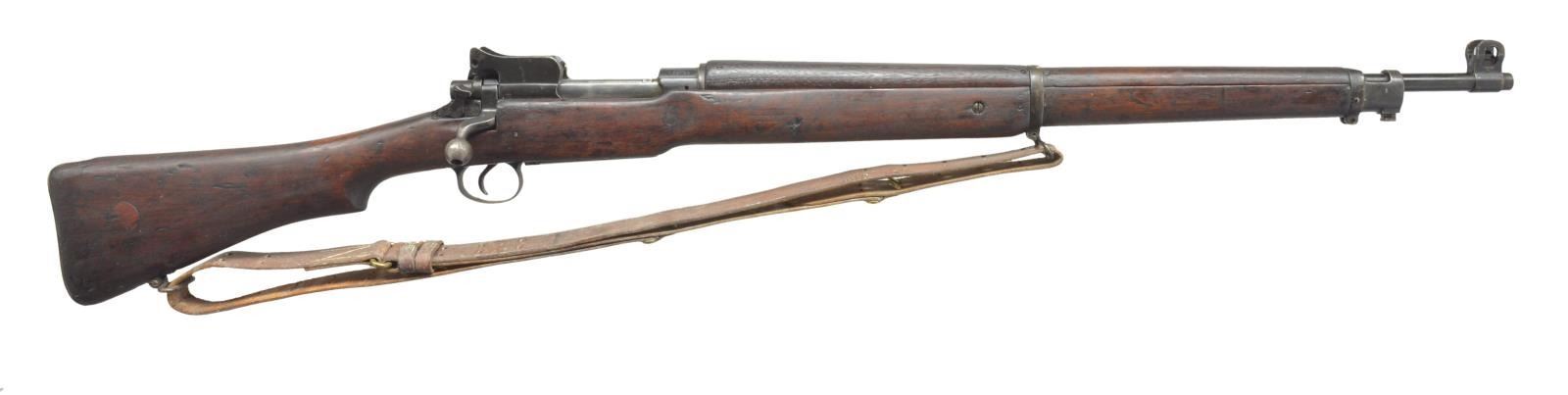 RIFLE. Cal. .303 British. S# 156128. S# matches on bolt & receiver. Bbl. 26". Receiver marked on left rail w/ broad arrow & "view" marks. Receiver ring marked on left side w/ "(crown) / BN" & "NOT ENGLISH MAKE". Receiver ring marked on right side "ERA. Ladder aperture rear sight marked to 1650yds. Blade front sight w/ protective ears. Cocking piece marked "W". Rear sight & bolt stock marked "E". Walnut stock set. Volley sight has been removed leaving mounting plate. Military type leather sling. Smooth trap buttplate. CONDITION: stock set has moderate wear, staining, dents & scratches commensurate w/ long service. Marking disk has been replaced by inletted wood. Metal has 50% original finish w/ light wear & scattered oxidation. Rear sight pivot screw has been replaced w/ pin. Good shiny bore w/ sharp lands. (21-652/RW). CURIO. $300-500.