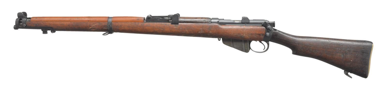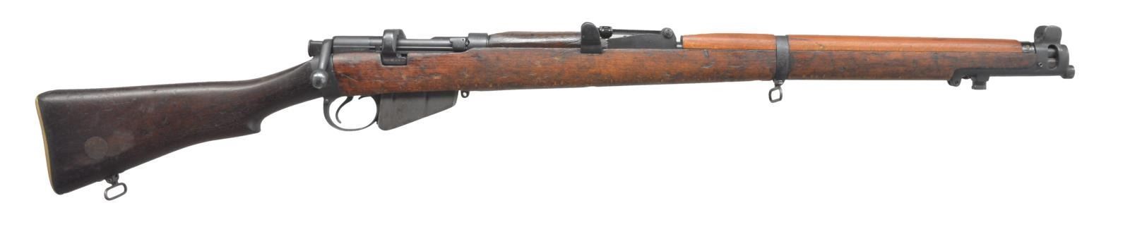 Cal. 303 Brit. S# 49532. Bbl. 25". Import marked on right side of receiver. Tangent rear sight graduated to 2000 yds. Blade front sight nose cap has protective ears & bayonet lug. Stacking swivel is not present. Receiver is marked on right side of butt socket w/ “(crown)” & “G.R.”. “B.S.A. Co.” “1917” “SHT. L.E.” “III”. Round cocking knob. Hardwood stock set w/ brass trap buttplate. Marking disk on right side of butt has wood plug. MAGS: 1 detachable 10 rd. UNATTACHED ACCESSORIES: full box of 20, Winchester Super X 180 grain power point ammunition. CONDITION: stock set has moderate wear, dents, staining & scratches throughout. Rear handguard has inletted repairs & two brass rivets. Metal has 75% dark arsenal rework finish. Fair, heavily worn bore turning dark. (21-447/RW). CURIO. $250-400.