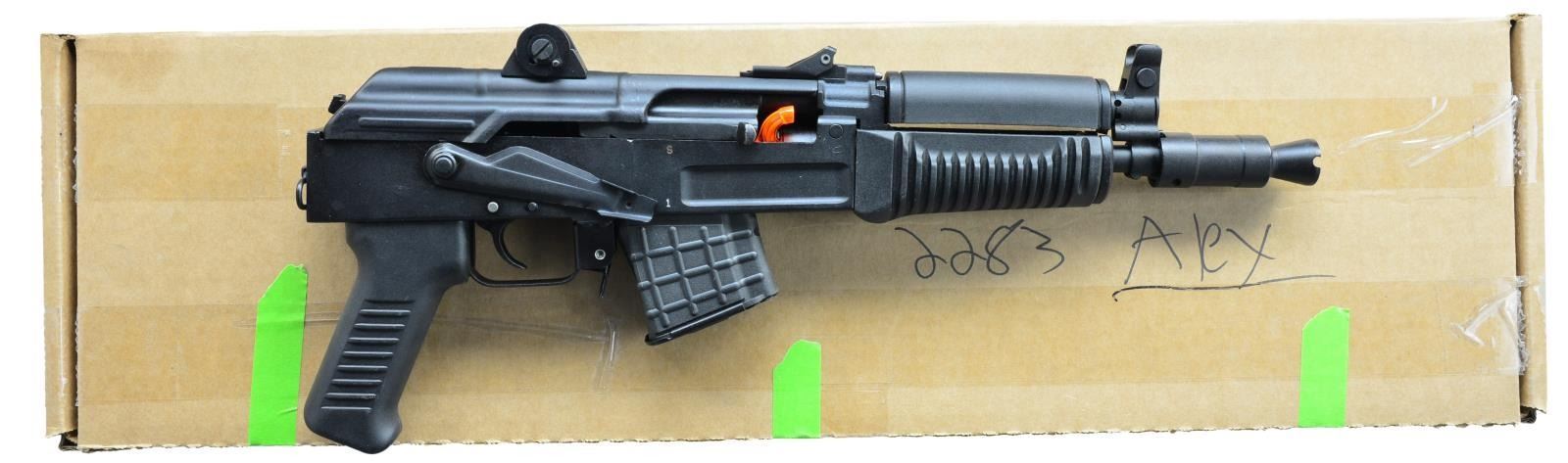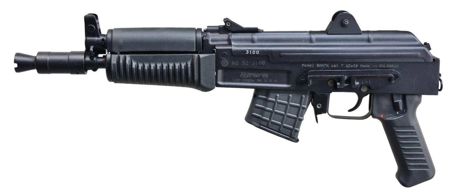 Cal. 7.62x39. S# KO523100. Bbl. 10 1/2". One of the highest regarded AK designs to ever visit the commercial United States market is the Bulgarian Arsenal from Las Vegas, NV. The amount of mfg. accuracy is second only to the company pride. Regardless of model, there is no expense spared in order to be accurate & correct w/ every detail taken into consideration. The SAM7 is the milled receiver family, this particular model representing the SAM7K. It is essentially a 7.62x39 milled Krinkov variant. Muzzle brake has the appearance of the traditional Bulgarian 24mm brake & has been pinned. Protected post front sight & dual aperture rear sight w/ a radius of over 11". Hinged top cover & scope mount on left side of receiver. Ambidextrous controls w/ traditional AK style on right side & thumb control on left. Flat back of receiver incorporates a sling attachment point, perfect for a single point mechanism. Bulgarian style dark black paint finish. Black plastic furniture. Pistol grip marked “S-30-1”. MAGS: 1-5 rd. original Bulgarian waffle pattern polymer. UNATTACHED ACCESSORIES: plastic chamber flag, factory cardboard styrofoam lined shipping box. CONDITION: all outward appearances indicate extremely low use if any at all. Finish coverage is complete & consistent w/ no outwardly noticeable blemishing. Bore is shiny w/ strong rifling & fire control mechanism appears to function correctly when cycled by hand. (21-719/JZ). MODERN. $500-800.