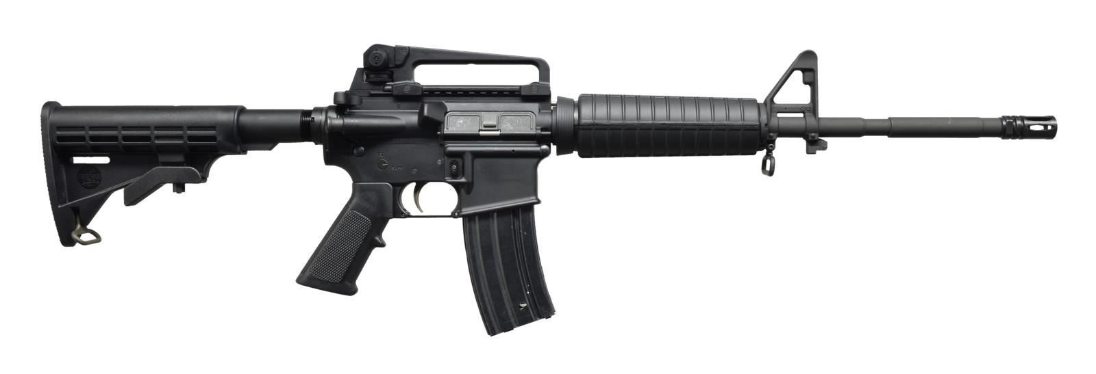 Cal. 5.56x45. S# ARB00782. Bbl. 16". B.F.I., New York mfg. XM15 E2S. Heavily influenced by the commando style AR-15. M4 Style bbl. marked “B MP 5.56 NATO 1/9” w/ A2 style flash hider. Exposed metal surfaces enjoy Bushmaster’s dark black finish. Detachable carry handle on flat top upper receiver w/ E2 sights adj. for windage & elevation to coincide w/ standard front sight incorporated into gas block w/ bayonet lug. Rnd. forward assist w/ brass deflector. 6 Position collapsible rear stock. Sling swivels front & rear. A2 Carbine handguards. MAGS: 1 aluminum 30 rd. CONDITION: Coverage on all exposed metal surfaces is complete, devoid of any noticeable blemishing. Outwardly, this firearm appears to have had very little range use, if any. Shiny bore w/ well pronounced rifling. Fire control mechanism appears to function correctly when cycled by hand. (21-336/JZ). MODERN. $600-800.