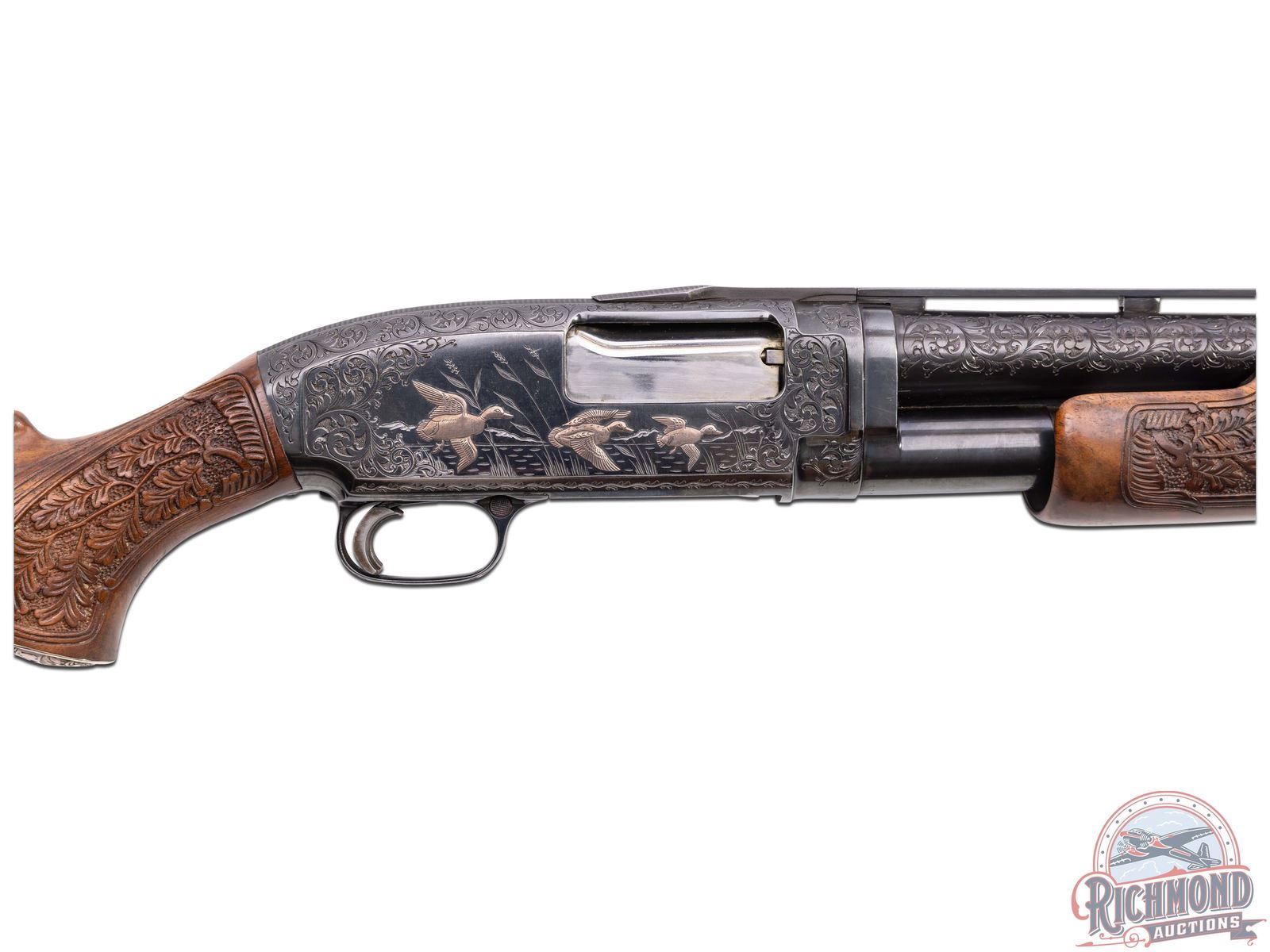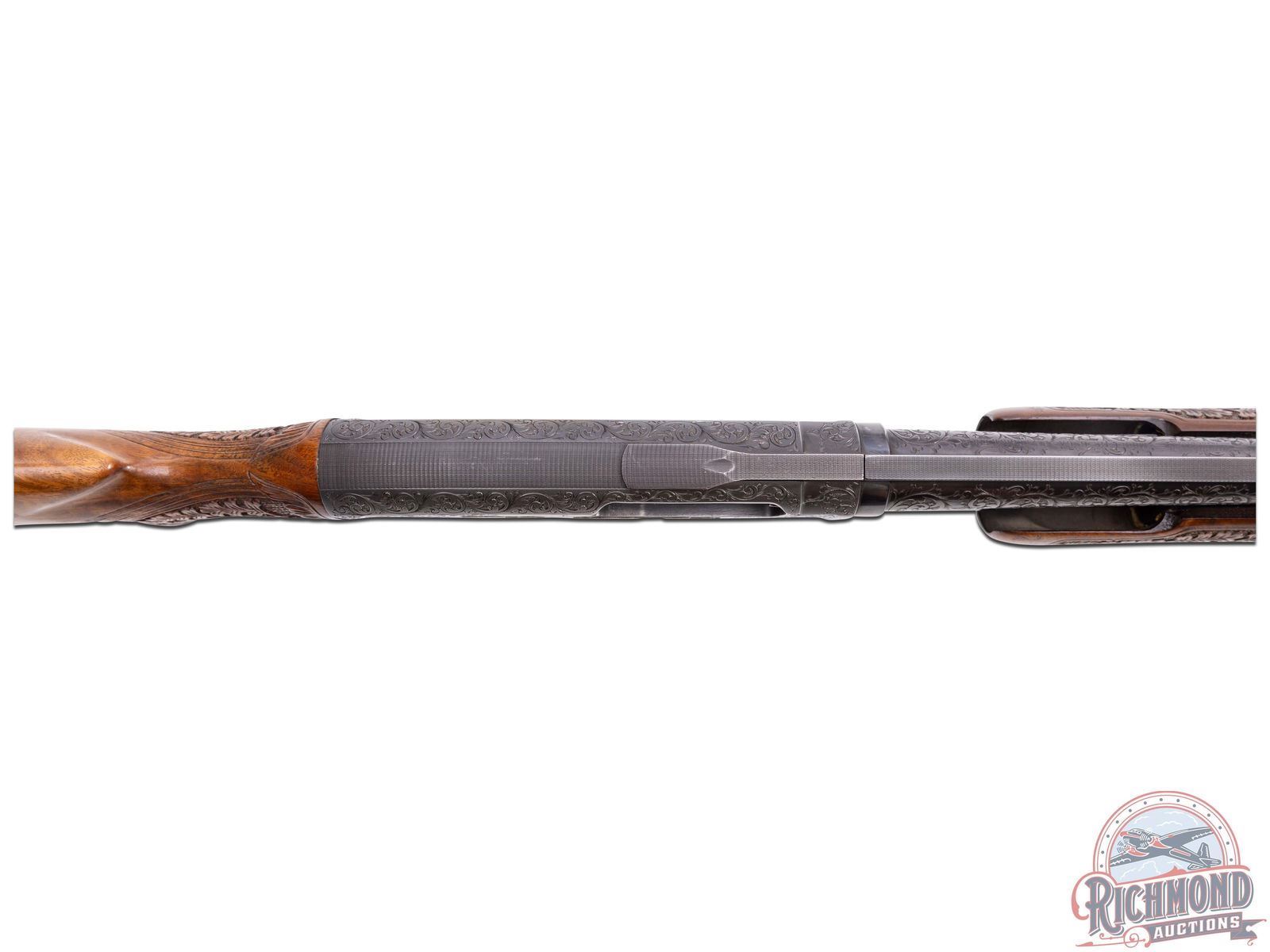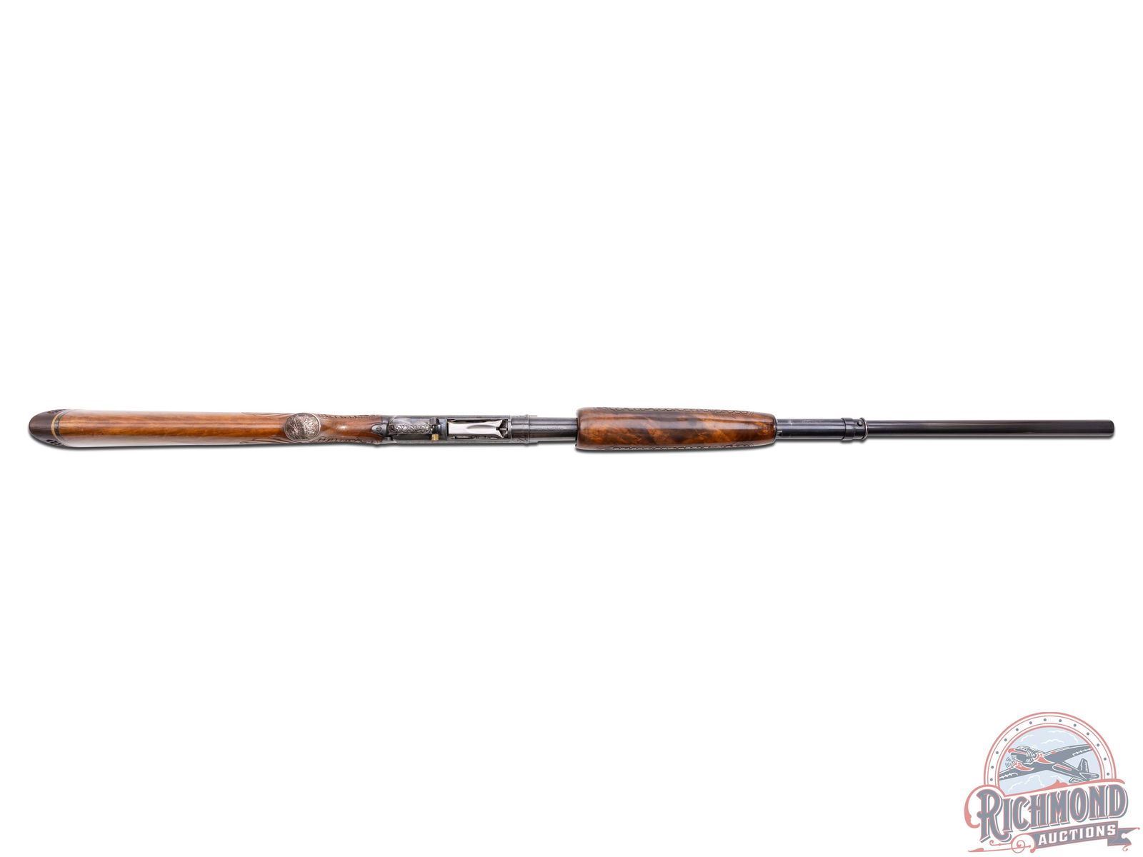 This luxury pump action Trap shotgun was manufactured in 1917. Features a 30" ventilated rib barrel chambered for 2-3/4" shells with Full choke. Mid-length nickel bead sight and orange bead front sight. Elegant floral scroll engraving extends from the receiver 6-1/2" up the barrel on both sides. Blued receiver features 85% engraved coverage, nickel plated bolt, brass safety stop and saddle shoe on trigger. Left side of the receiver features two gold inlaid dogs and four silver inlaid doves in flight in a grassland scene, surrounded by floral scroll design. Bottom edge of both sides of the receiver features an engraved vine design. Right side features three silver inlaid ducks in flight over lake scene surround by floral scroll design. Bottom of the trigger guard features a floral scroll design. Bottom front of the receiver is stamped with matching serial number to the barrel, which is stamped on the bottom "MODEL-12-TRAP". Feather crotch walnut stock and forearm. Hand-carved forearm and pistol grip features oak leaf branches with punch-dot background and an elegant double lined border. Each side of the butt stock features a bone inlaid elongated diamond. Silver tone pistol grip cap with floral scroll engraving and banner inscribed "CA Wilson". Fitted with a brown Pachmayr ventilated rubber recoil pad. LOP: 14". DAC: 1-1/2". DAH: 2-1/4". CALIBER: 12 GA. S/N: 148617. FFL STATUS: Curio & Relic.