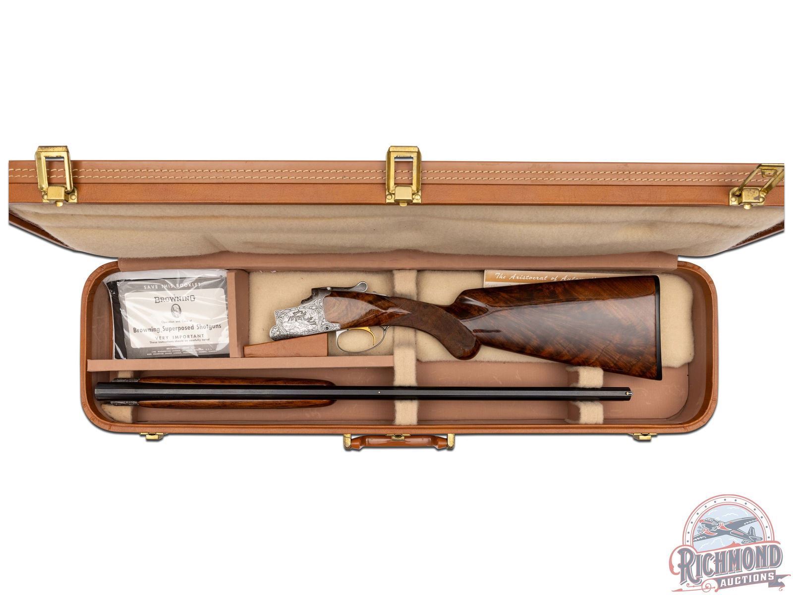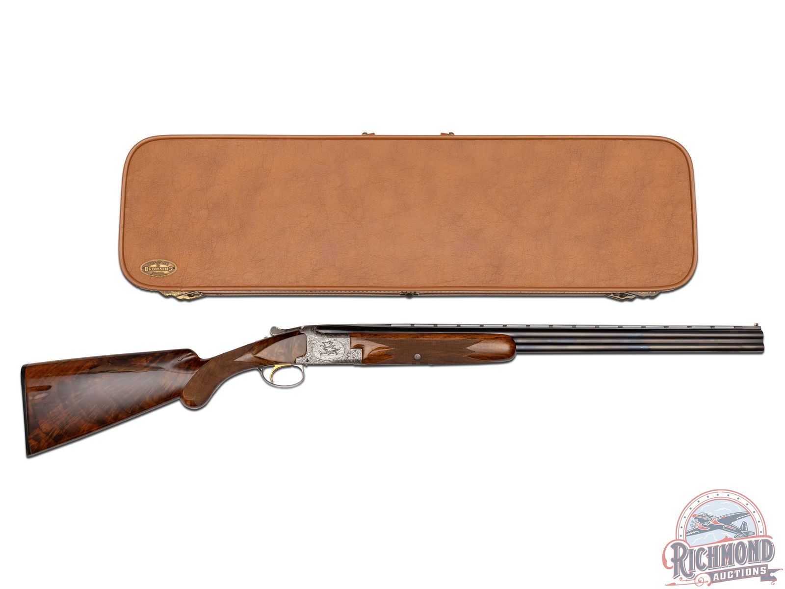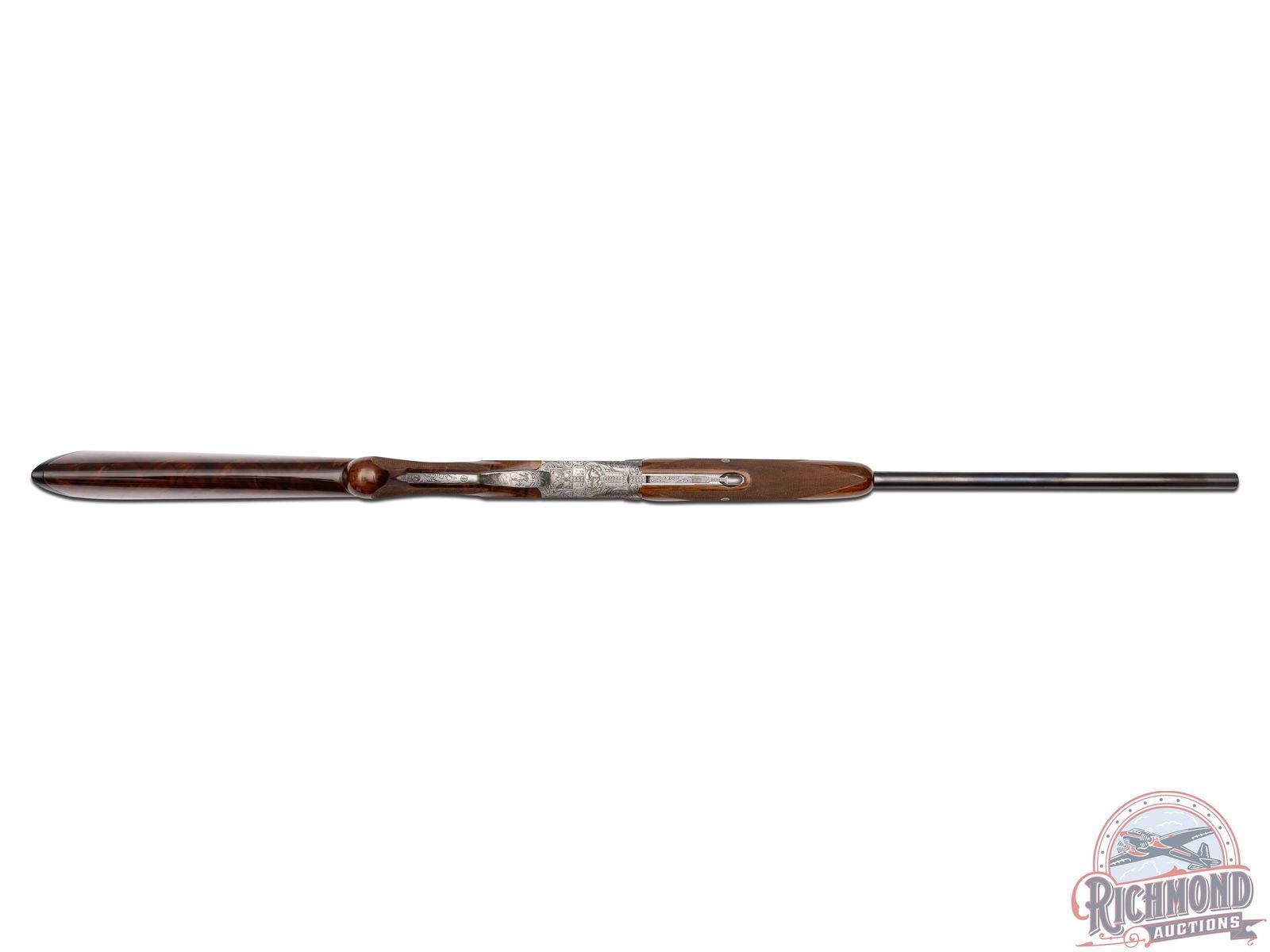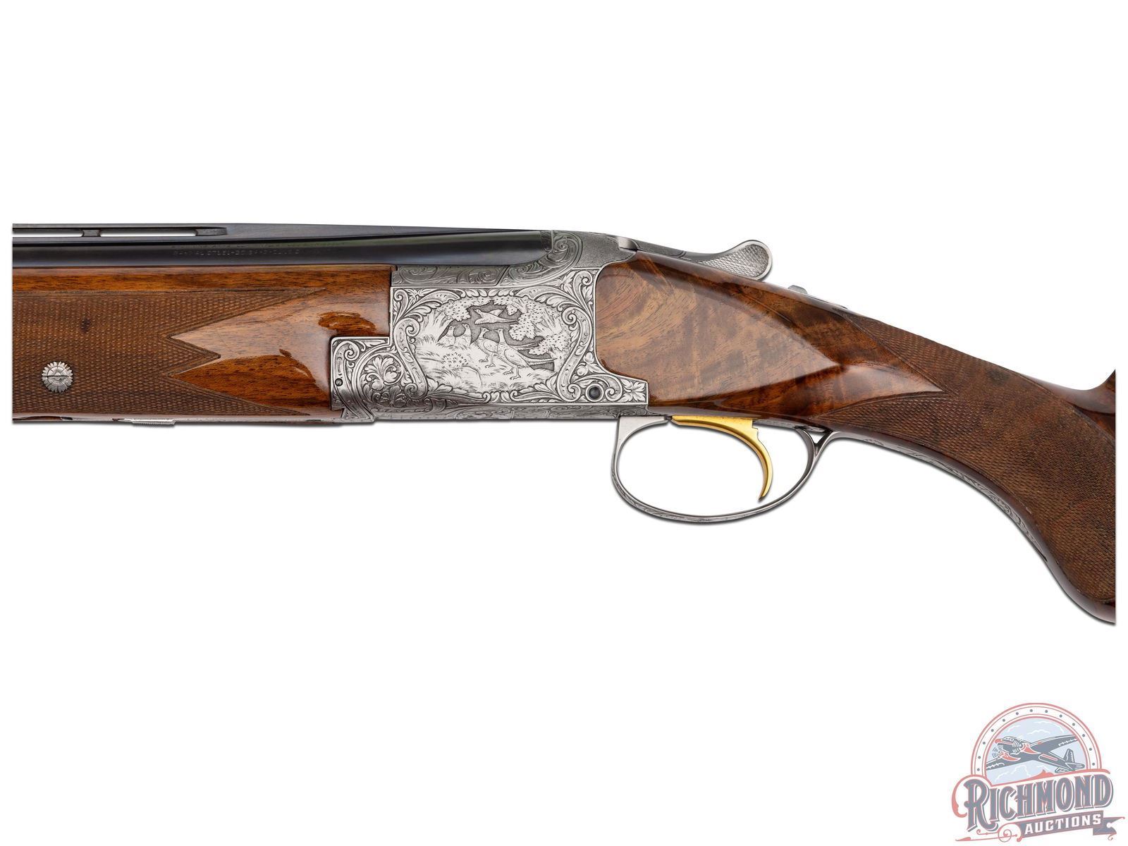Made in 1959, this 20 gauge shotgun features 26-1/2" barrels with narrow ventilated rib with double beads. The top barrel is choked improved cylinder and bottom barrel is choked modified. Barrels are marked 2-3/4" and 3". Both barrels are equipped with automatic ejectors. The coin finished action is fully engraved by master engraver, Felix Funken, featuring floral designs and game scenes in deep relief. The left side of the receiver shows five pheasants in a woodland setting; the right side features four ducks in a woodland pond. The underside shows a pair of grouse in flight and a hare engraved on the trigger guard. Both the right and left sides of the receiver are signed Felix Funken. Double signed receivers are exceptionally rare. Receiver features a gold-plated single selective trigger and non-automatic safety. Forearm and butt stock feature 3X walnut; both with fine factory checkering with 22 lines per inch. The semi pistol grip butt stock has a round knob long tang. butt stock is finished with factory Browning hard black plastic butt plate. The shotgun is housed in a factory Browning hard case with owner's manual, instruction booklet, and envelope with keys to the case. LOP: 14-1/2". DAC: 1". DAH: 2". CALIBER: 20 GA. S/N: 14582. FFL STATUS: Curio & Relic.
