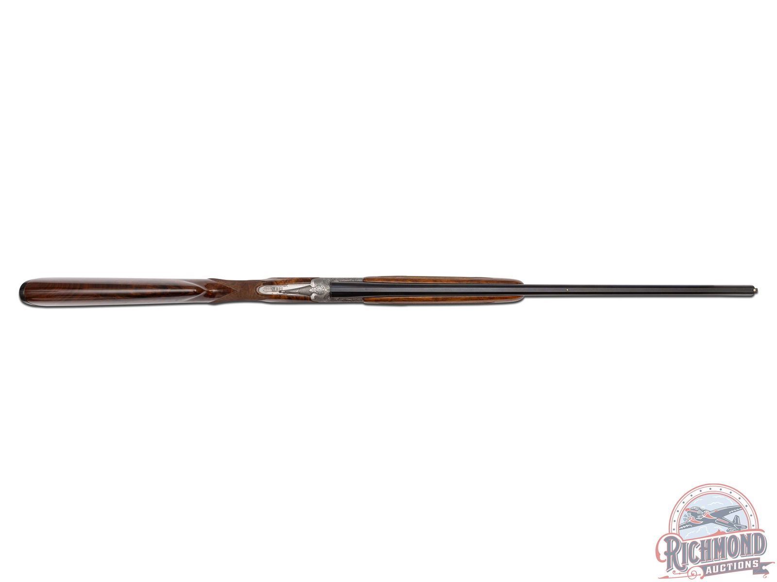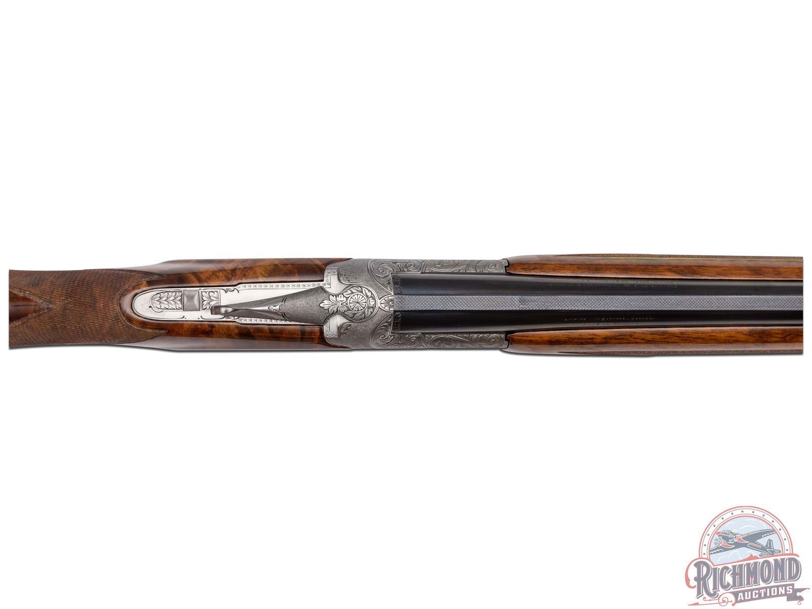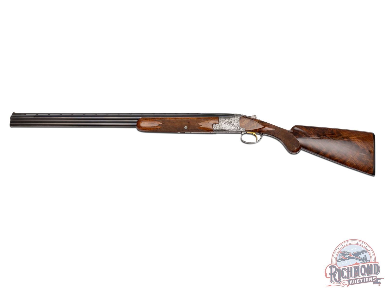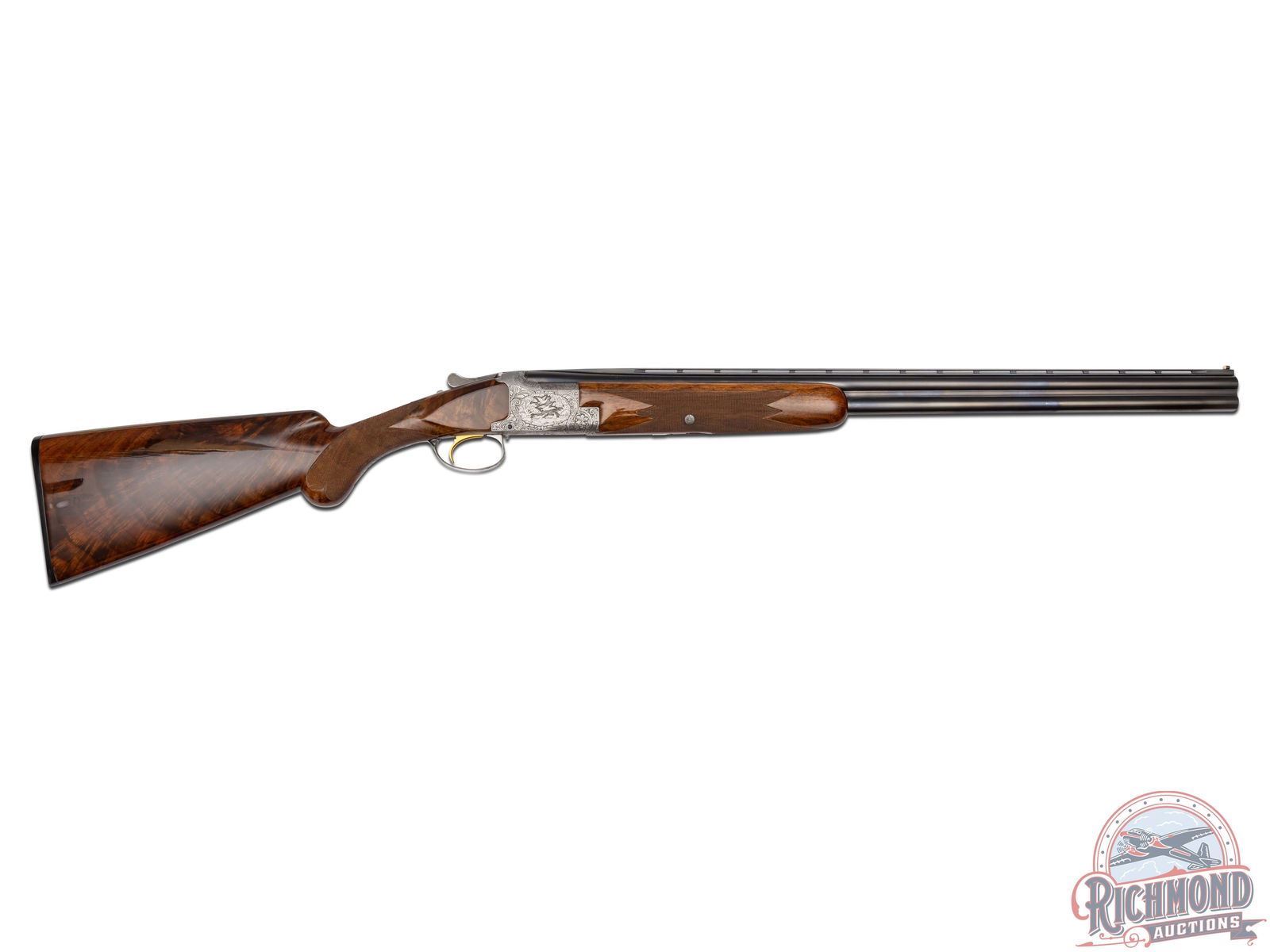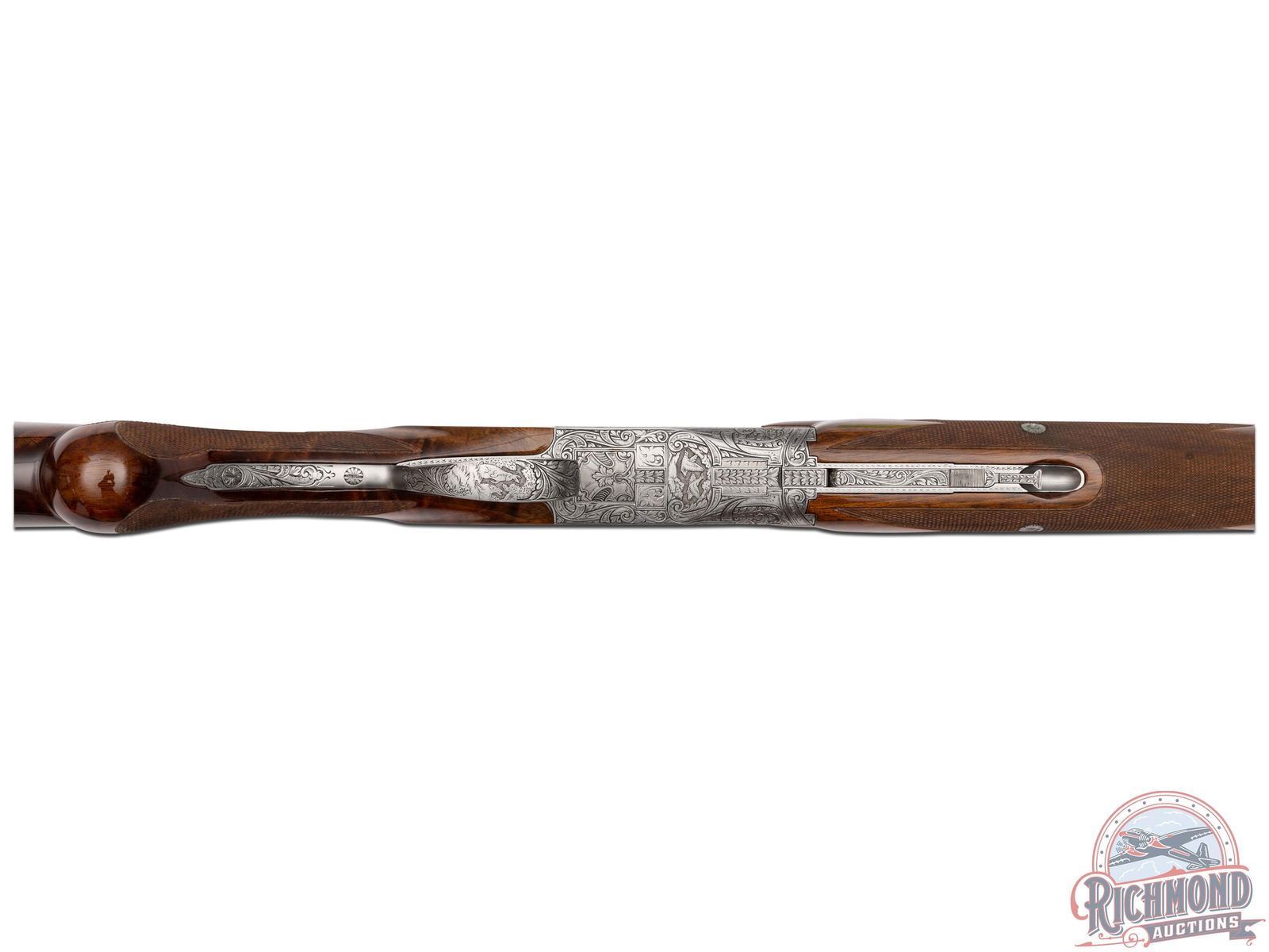 Made in 1959, this 20 gauge shotgun features 26-1/2" barrels with narrow ventilated rib with double beads. The top barrel is choked improved cylinder and bottom barrel is choked modified. Barrels are marked 2-3/4" and 3". Both barrels are equipped with automatic ejectors. The coin finished action is fully engraved by master engraver, Felix Funken, featuring floral designs and game scenes in deep relief. The left side of the receiver shows five pheasants in a woodland setting; the right side features four ducks in a woodland pond. The underside shows a pair of grouse in flight and a hare engraved on the trigger guard. Both the right and left sides of the receiver are signed Felix Funken. Double signed receivers are exceptionally rare. Receiver features a gold-plated single selective trigger and non-automatic safety. Forearm and butt stock feature 3X walnut; both with fine factory checkering with 22 lines per inch. The semi pistol grip butt stock has a round knob long tang. butt stock is finished with factory Browning hard black plastic butt plate. The shotgun is housed in a factory Browning hard case with owner's manual, instruction booklet, and envelope with keys to the case. LOP: 14-1/2". DAC: 1". DAH: 2". CALIBER: 20 GA. S/N: 14582. FFL STATUS: Curio & Relic.