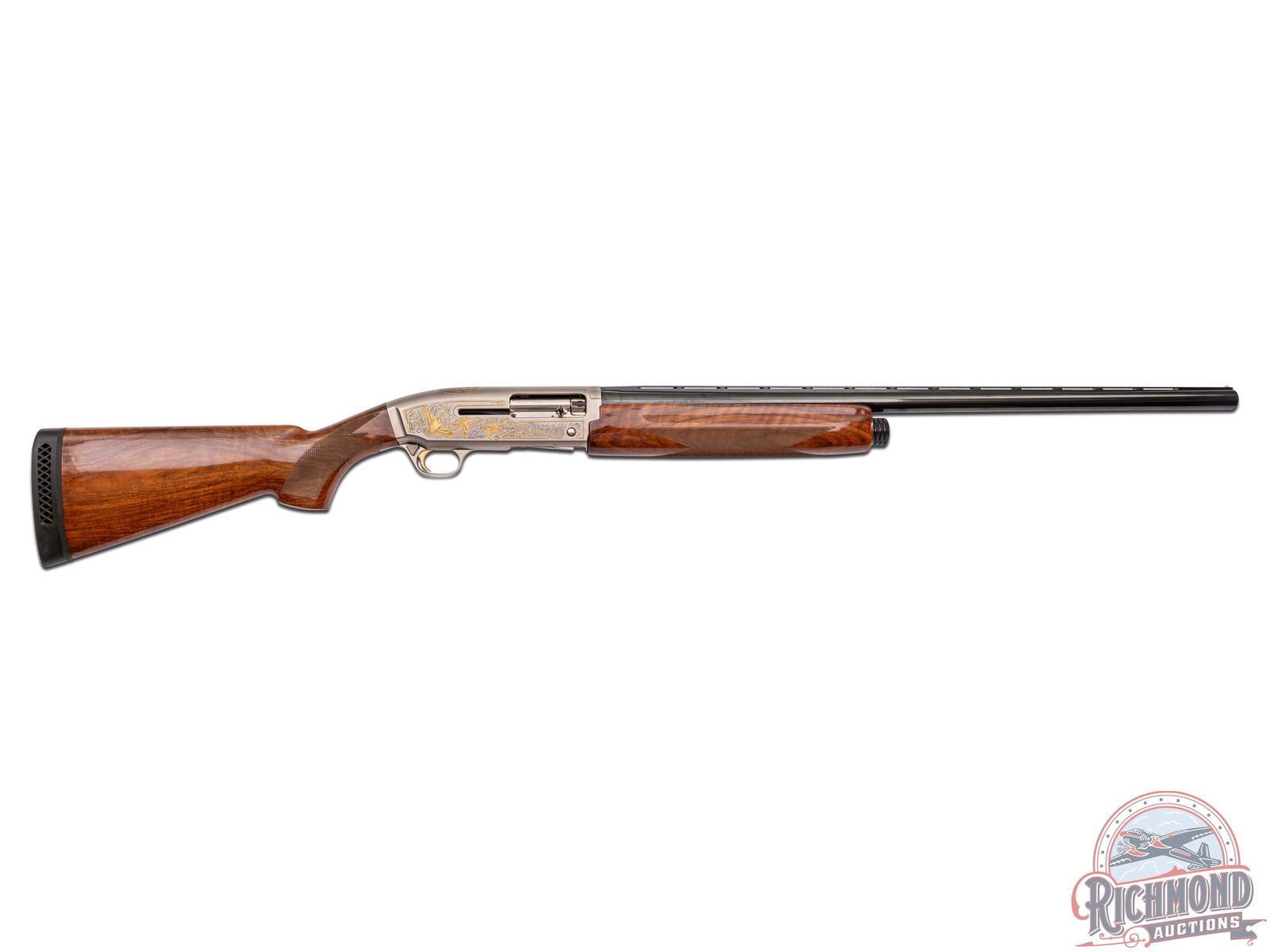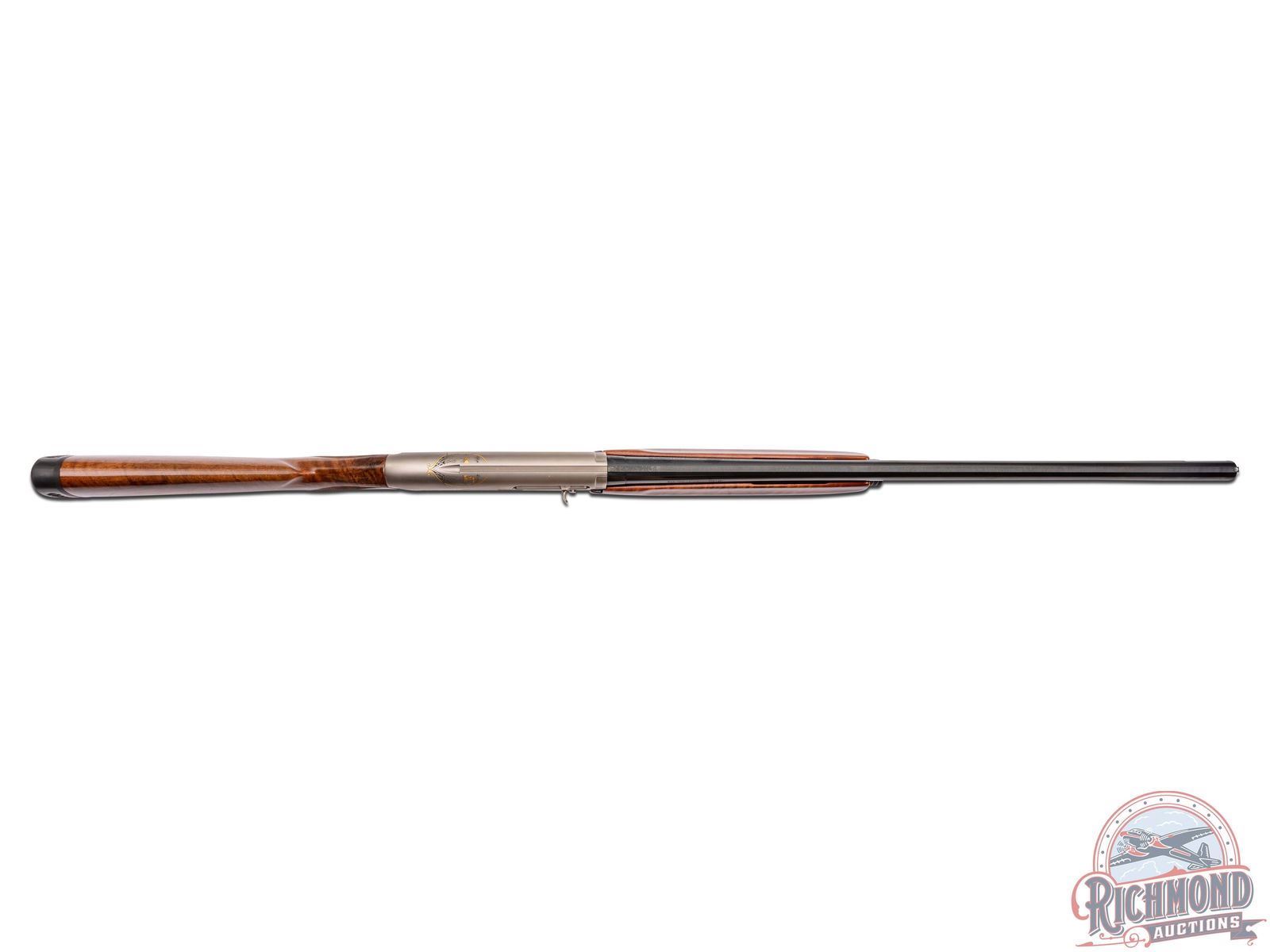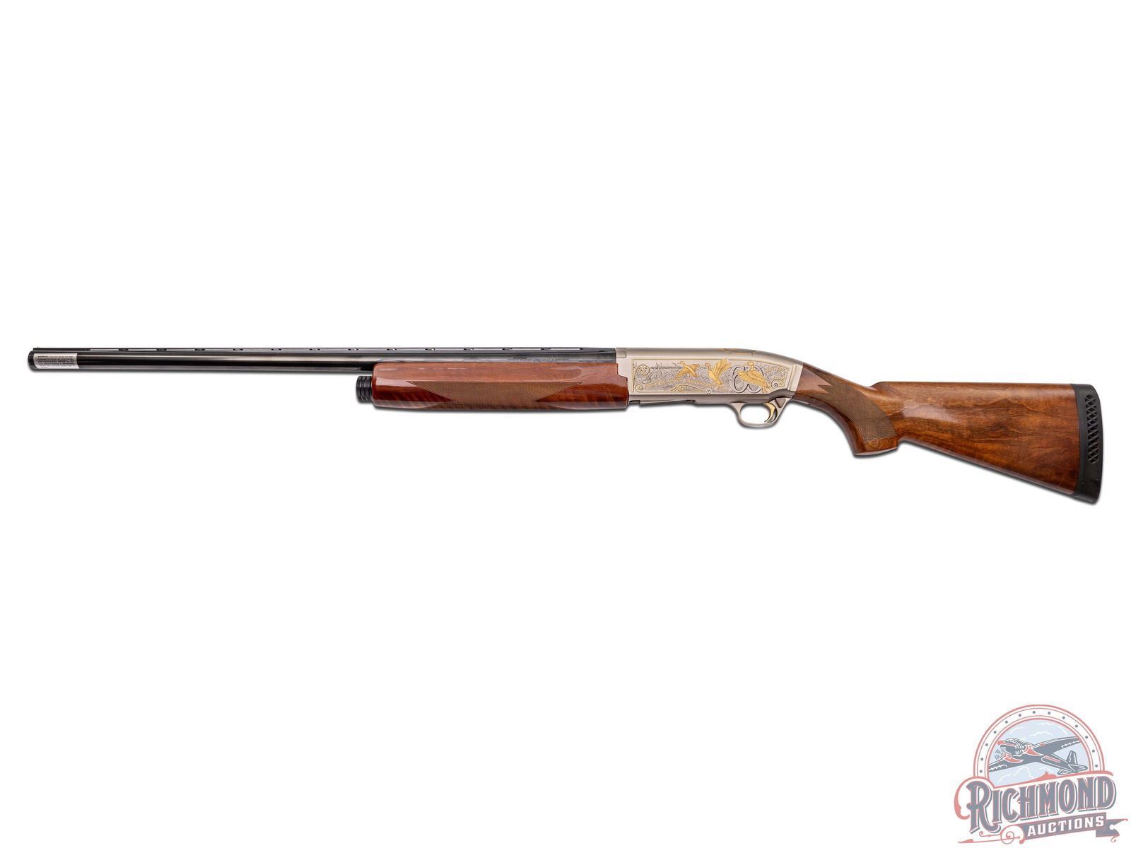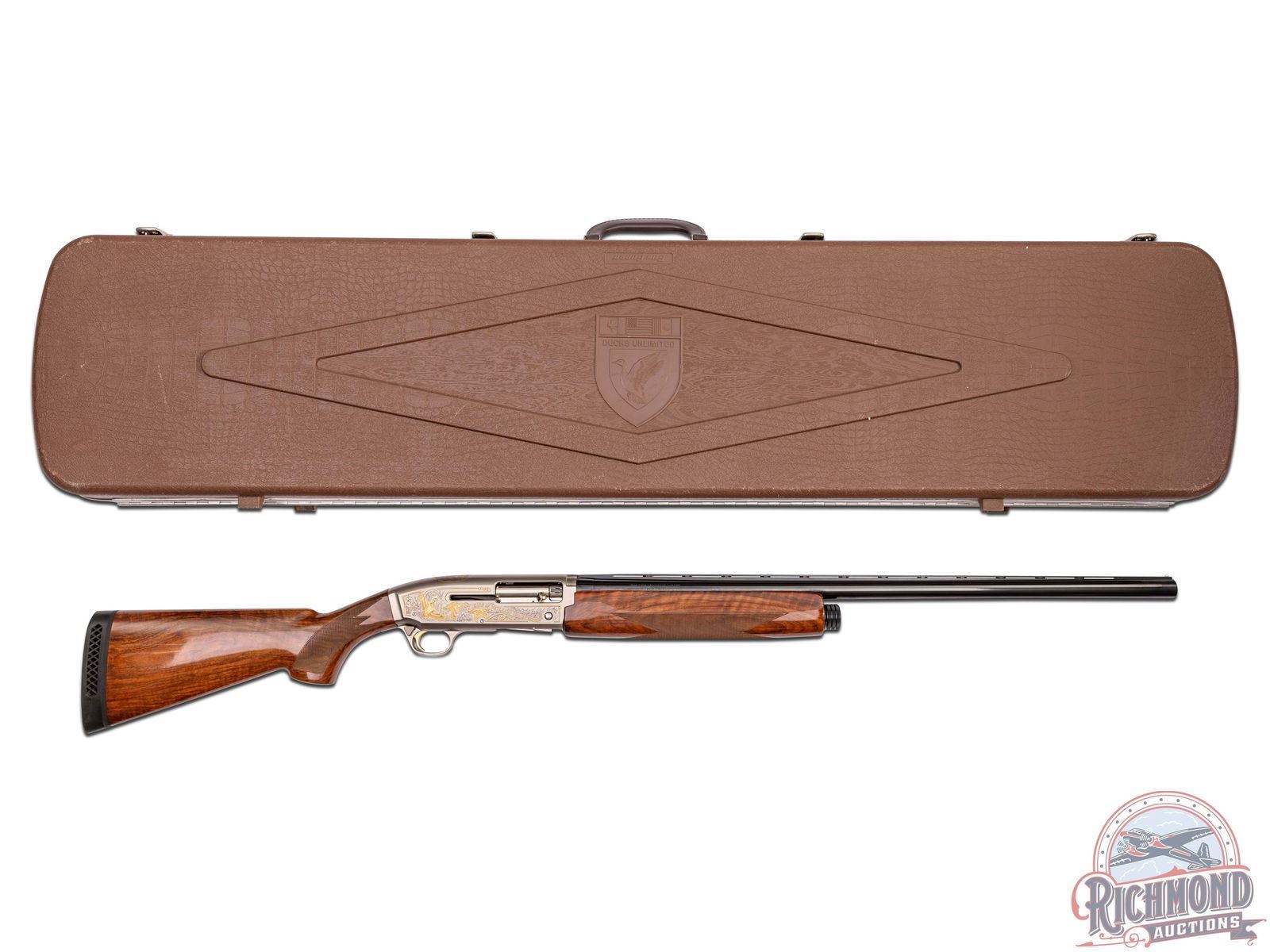 Made in Belgium and assembled in Portugal by Browning in 1997 for the 60th Anniversary of Ducks Unlimited. Fitted with removable blued 28" 12 gauge barrel with ventilated rib, bead front sight, Invector choke, and 3" chamber. Satin finished frame with gold trigger with gold washed duck scenes designed by artist Leon Burrows. Serial numbered in own range with gold washed Duck Head on trigger guard. Grade III walnut checkered pistol grip stock with Browning ventilated rubber recoil pad. Matching checkered walnut forearm with blued barrel fastening knob. Comes in brown plastic "Ducks Unlimited" marked case. LOP: 14-1/2". DAC: 1-1/2". DAH: 2". CALIBER: 12 GA. S/N: 060DU00557. FFL STATUS: Modern.
