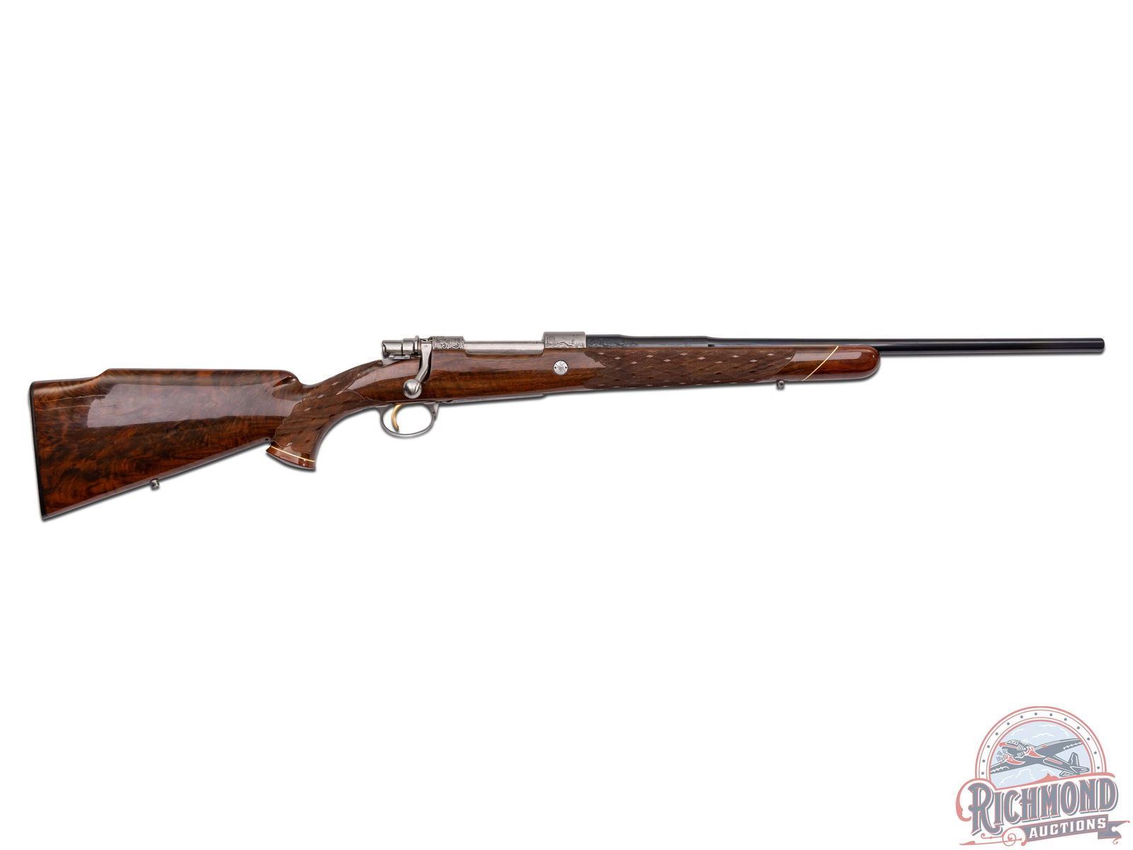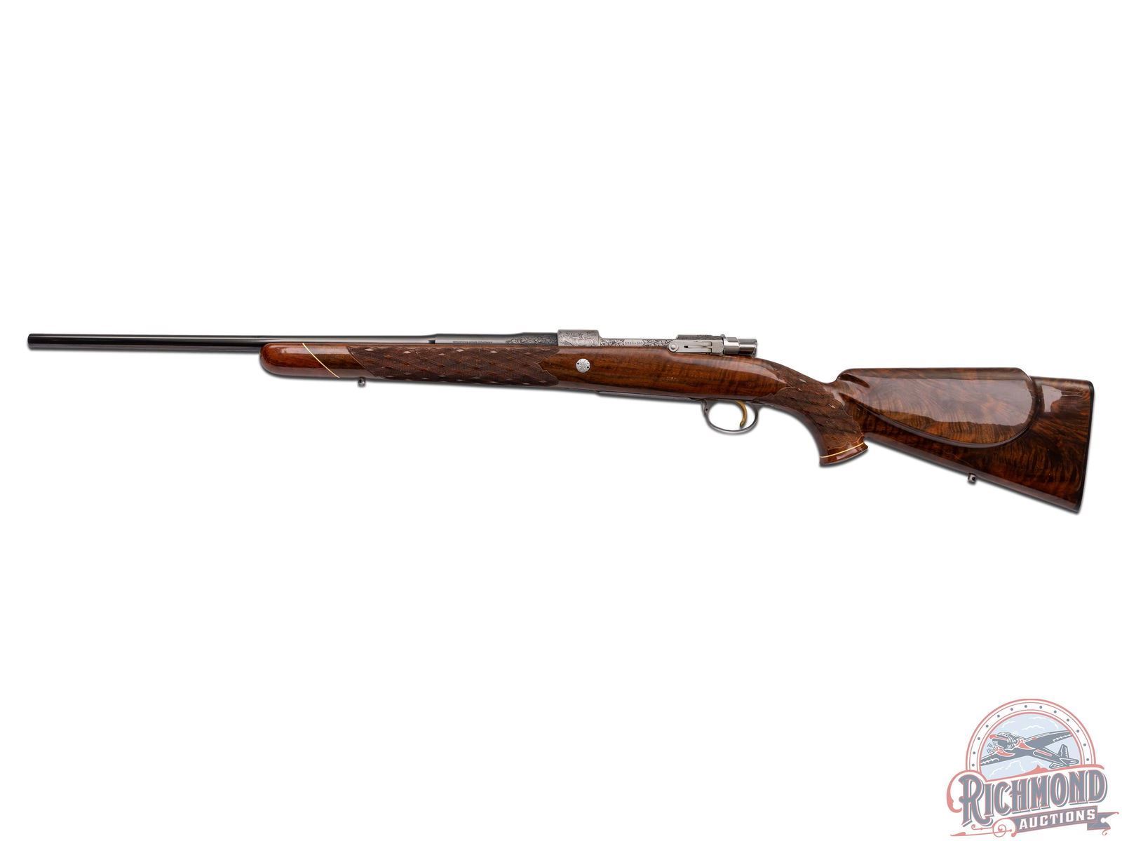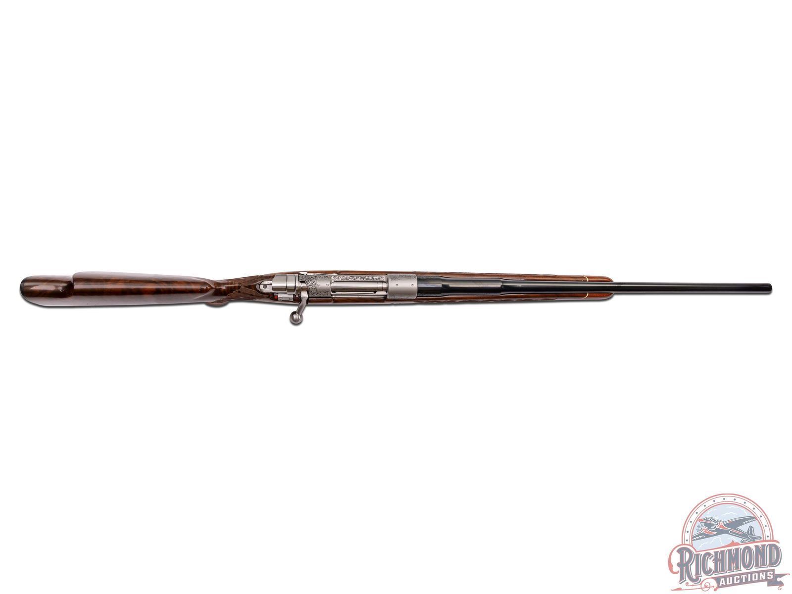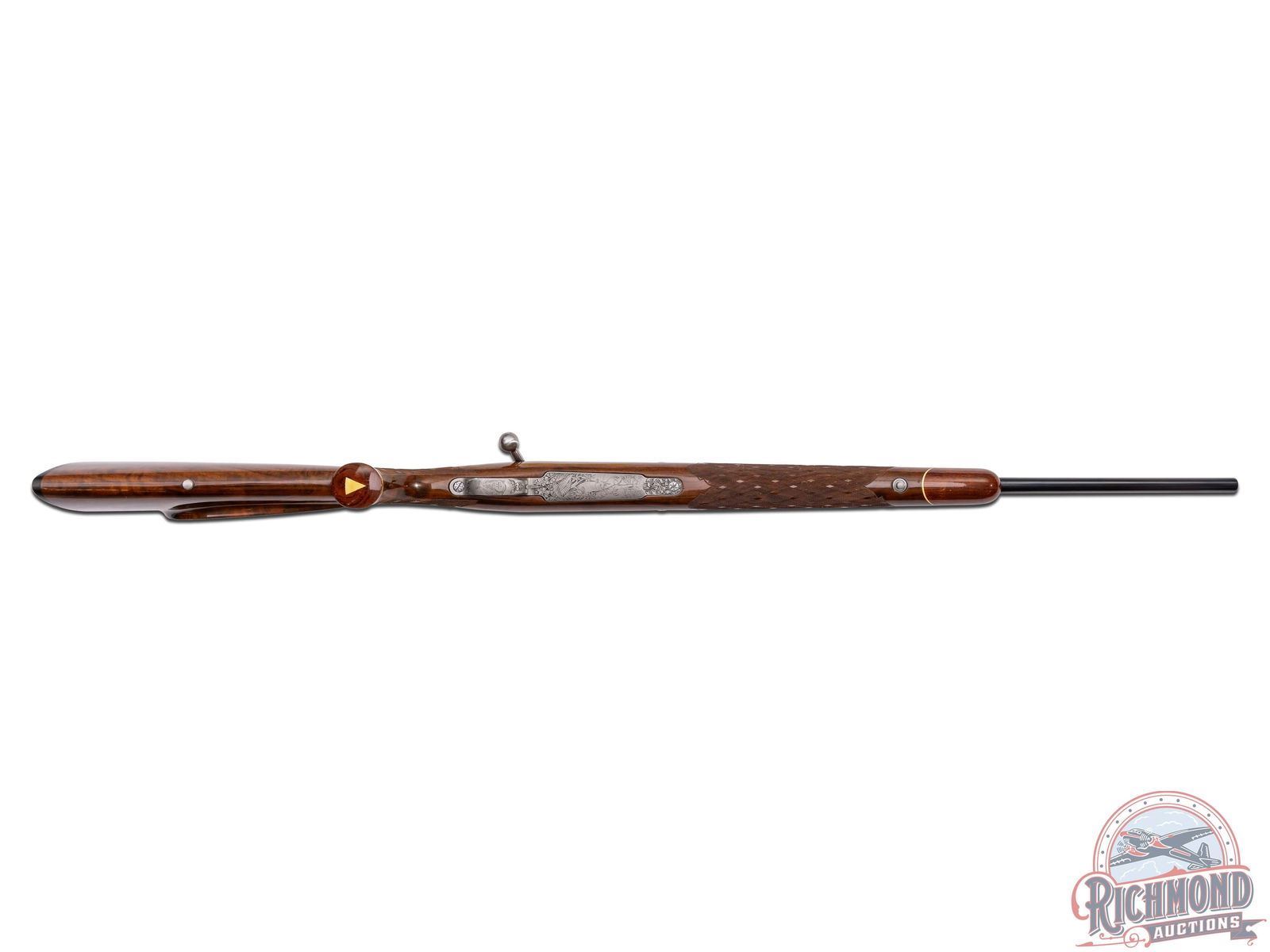 Made in Belgium by Browning in 1969. This rifle features a 22" blued steel sightless barrel in 30-06 caliber with Browning address and caliber markings and a floral engraved breech. Satin finished FN action with floral chisel engraving and elk scene on left receiver face and antelope on right. Two position side safety with gold washed trigger, satin finished chisel engraved detachable trigger guard with whitetail deer scene signed "AM" for Alfonse Marachal. Top-of-the-line walnut Monte Carlo stock with skip-line checkering. Contrasting Rosewood forearm tip and grip cap with right handed cheekpiece and Browning hard rubber butt plate. LOP: 13-3/4". DAC: 1-1/4". DAH: 1-1/4". CALIBER: 30-06. S/N: 52254L69. FFL STATUS: Curio & Relic.