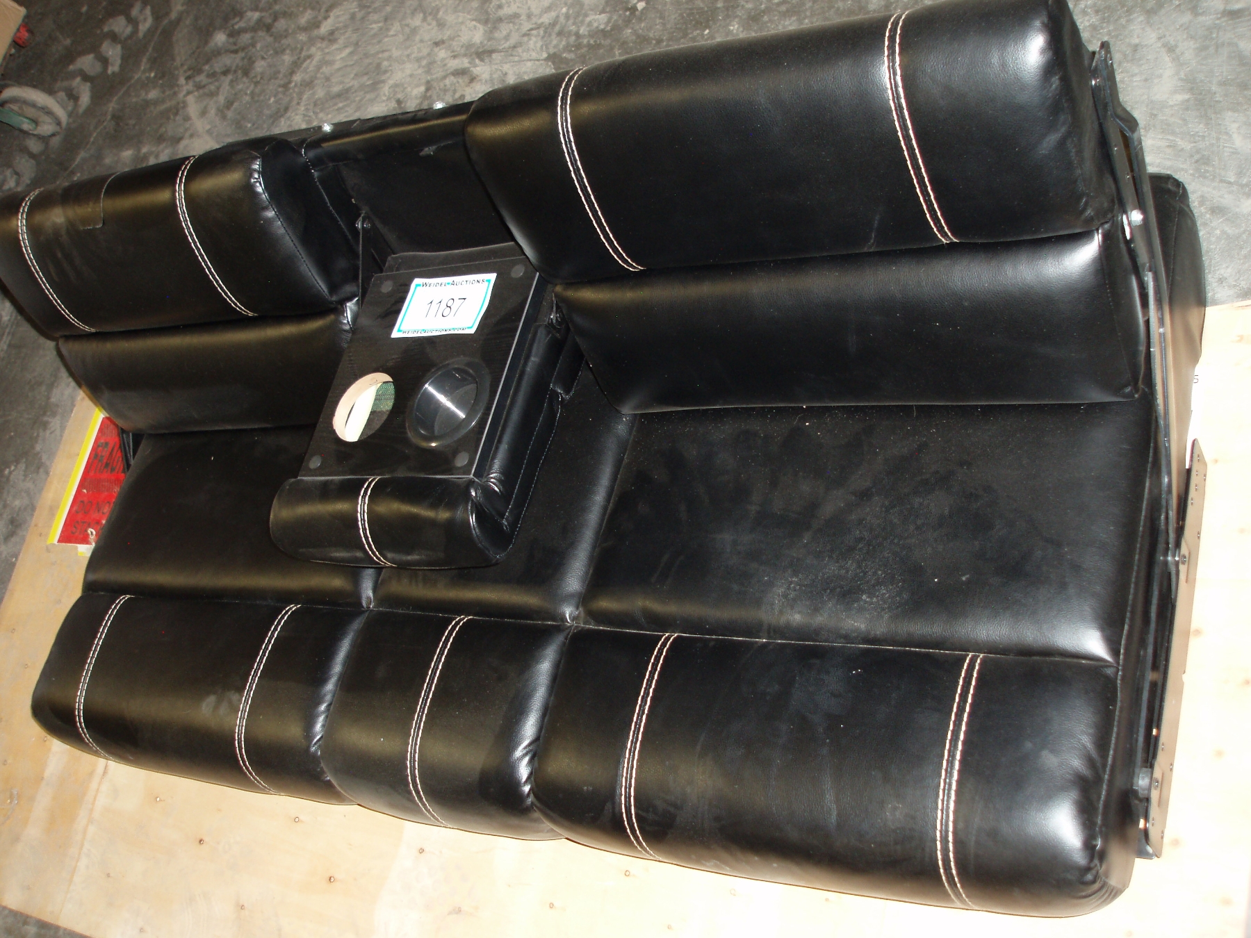 Black Leather Toy Hauler Rollover Sofa with Cup Holders, has feet