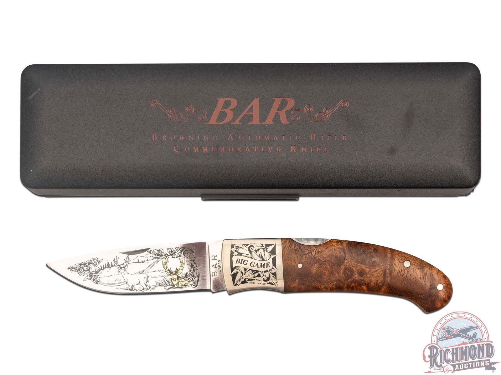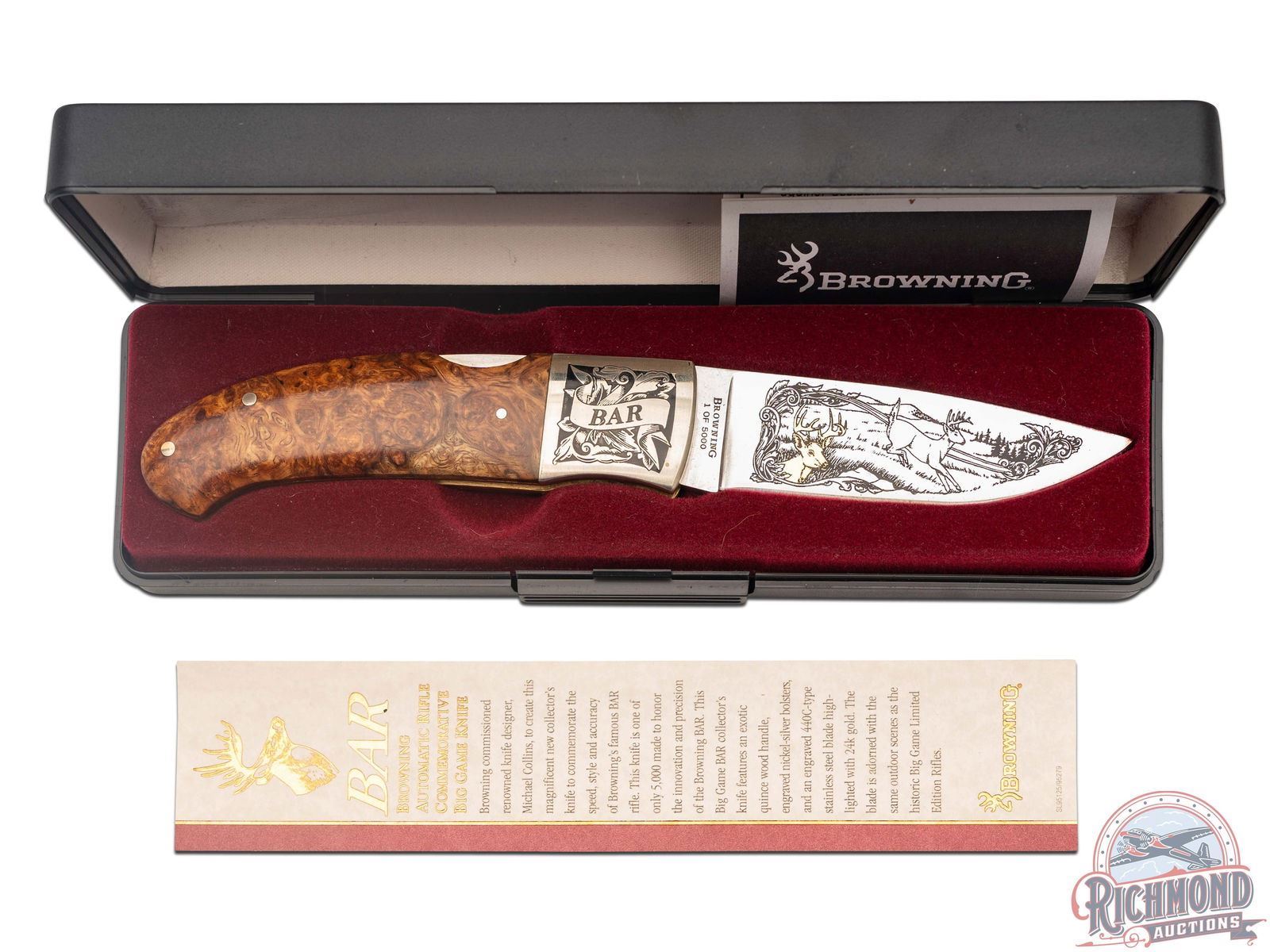 This is Limited Edition knife comes in the original box with factory paperwork. Commissioned by renowned knife designer, Michael Collins to create a magnificent collector's knife to commemorate the speed, style and accuracy of Browning's' famous BAR rifle. This knife is one of only 5,000 made to honor the innovation and precision of the BAR rifle. Features an exotic quince wood handle, engraved nickel-silver bolsters, and engraved 440C-type stainless steel blade highlighted with 24K gold. The blade is adorned with the same outdoor scenes as the historic Big Game Limited Edition Rifles.