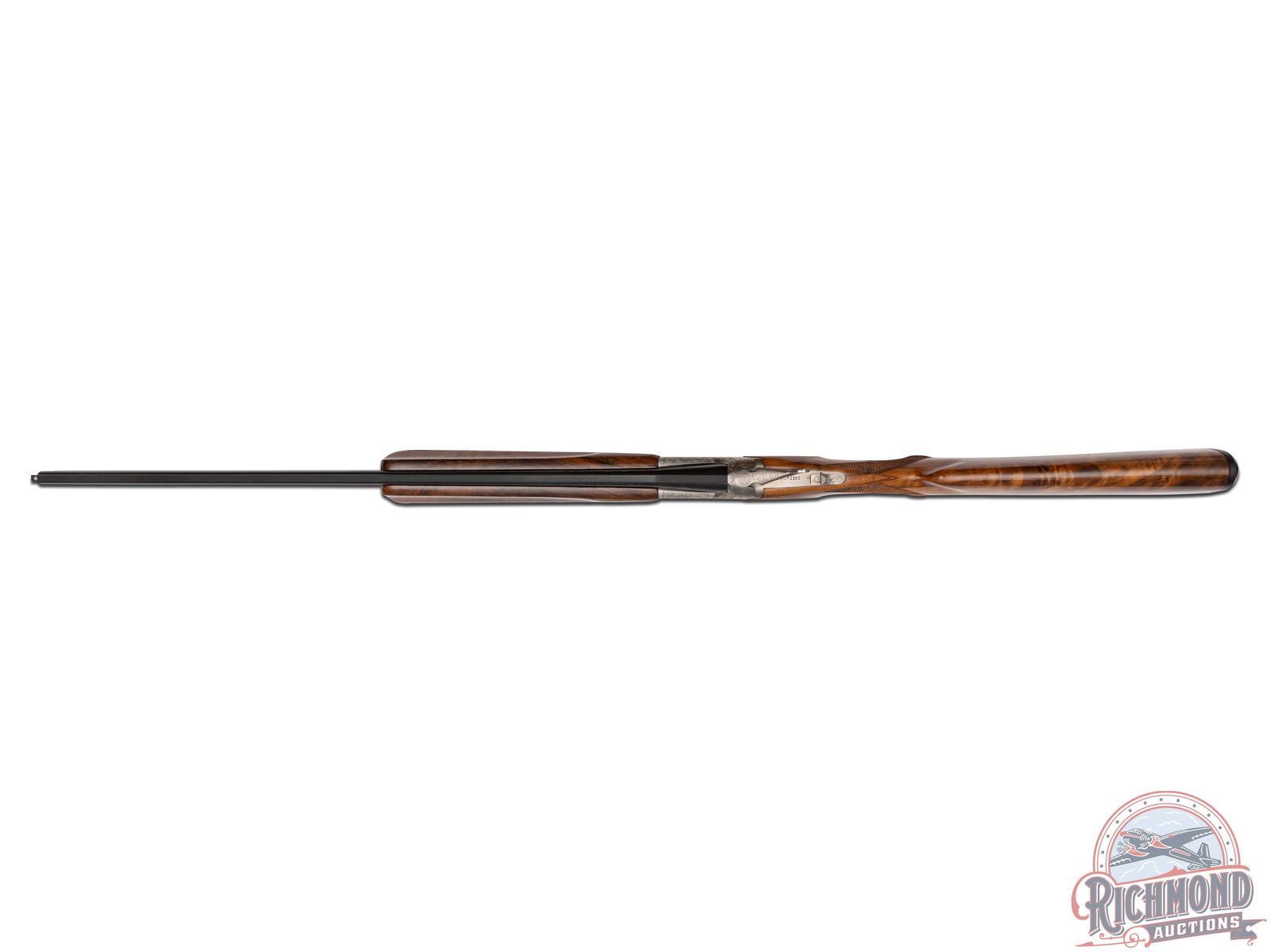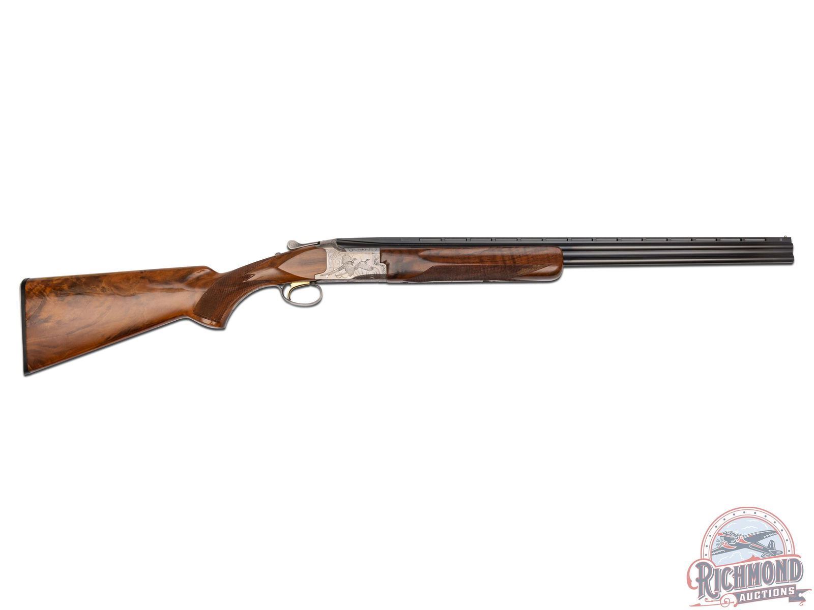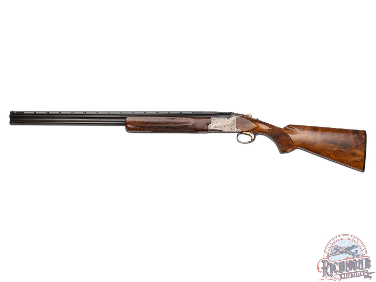 Made by Browning in 1981. 26" blued Special Steel barrels with ventilated rib, bead front sight, ejectors, 3" chambers, and Modified and Improved cylinder chokes in desirable 410 caliber. Barrel is marked with Browning Utah and Montreal addresses with steel and caliber markings. Satin finished engraved action with flying ducks, quail, and pheasant scene. Action has gold washed trigger, top tang safety, and satin finished engraved trigger guard. Walnut checkered pistol grip stock with "Browning" butt plate with walnut checkered competition style attached forearm with latch release. Comes in canvas Browning trunk case. LOP: 14-1/4". DAC: 1-1/2". DAH: 2". CALIBER: 410. S/N: 07000PZ183. FFL STATUS: Modern.