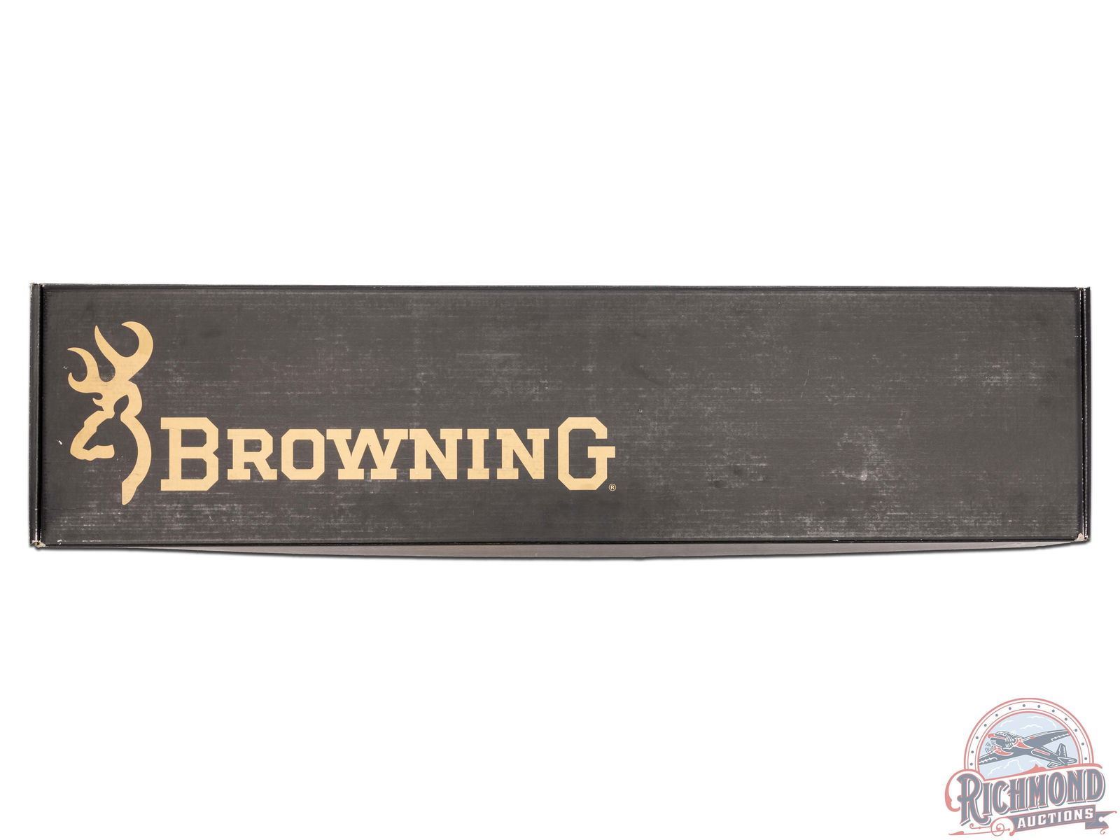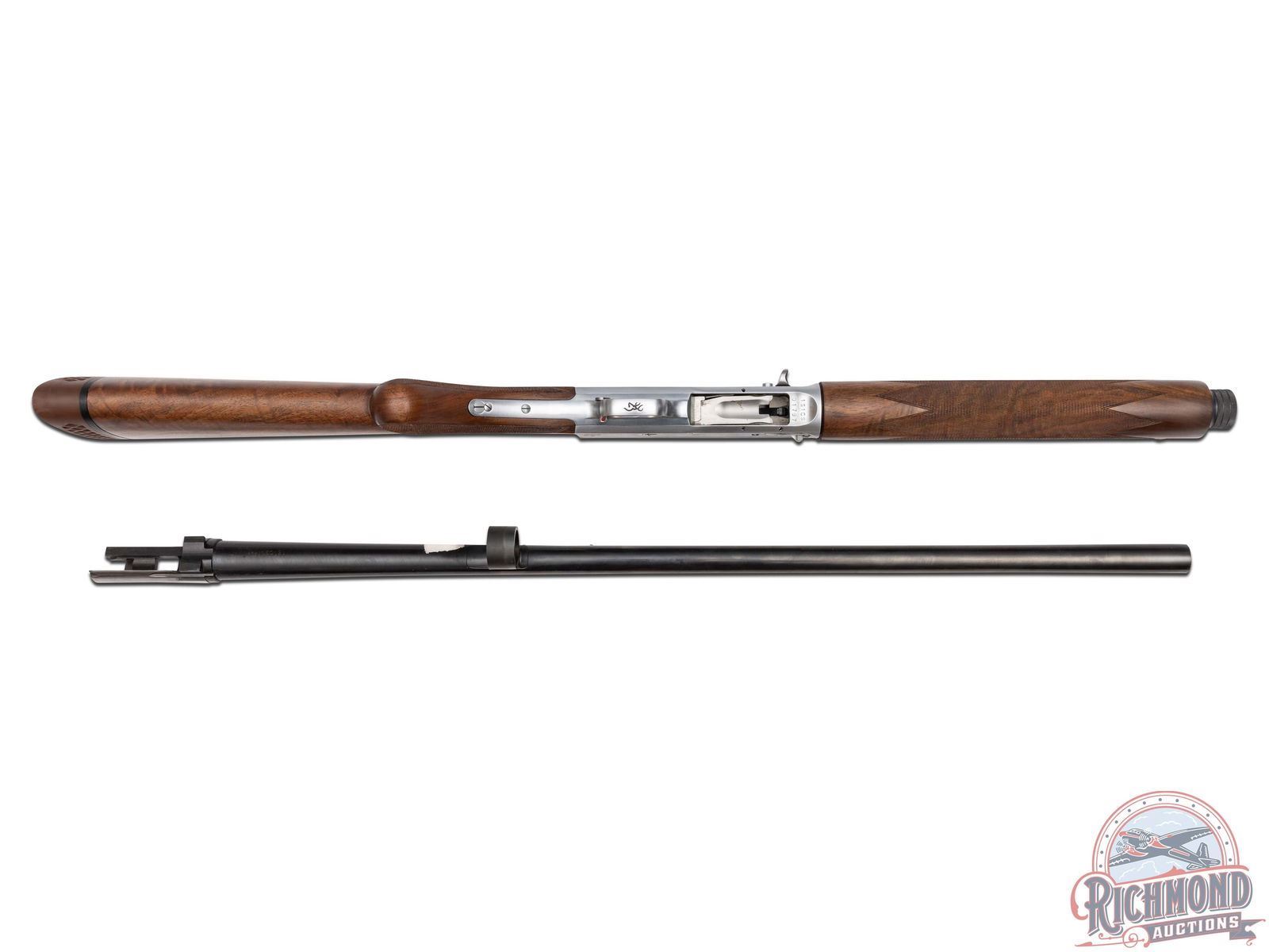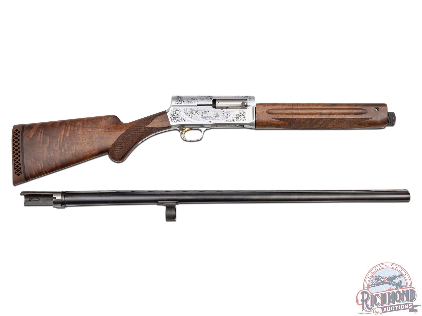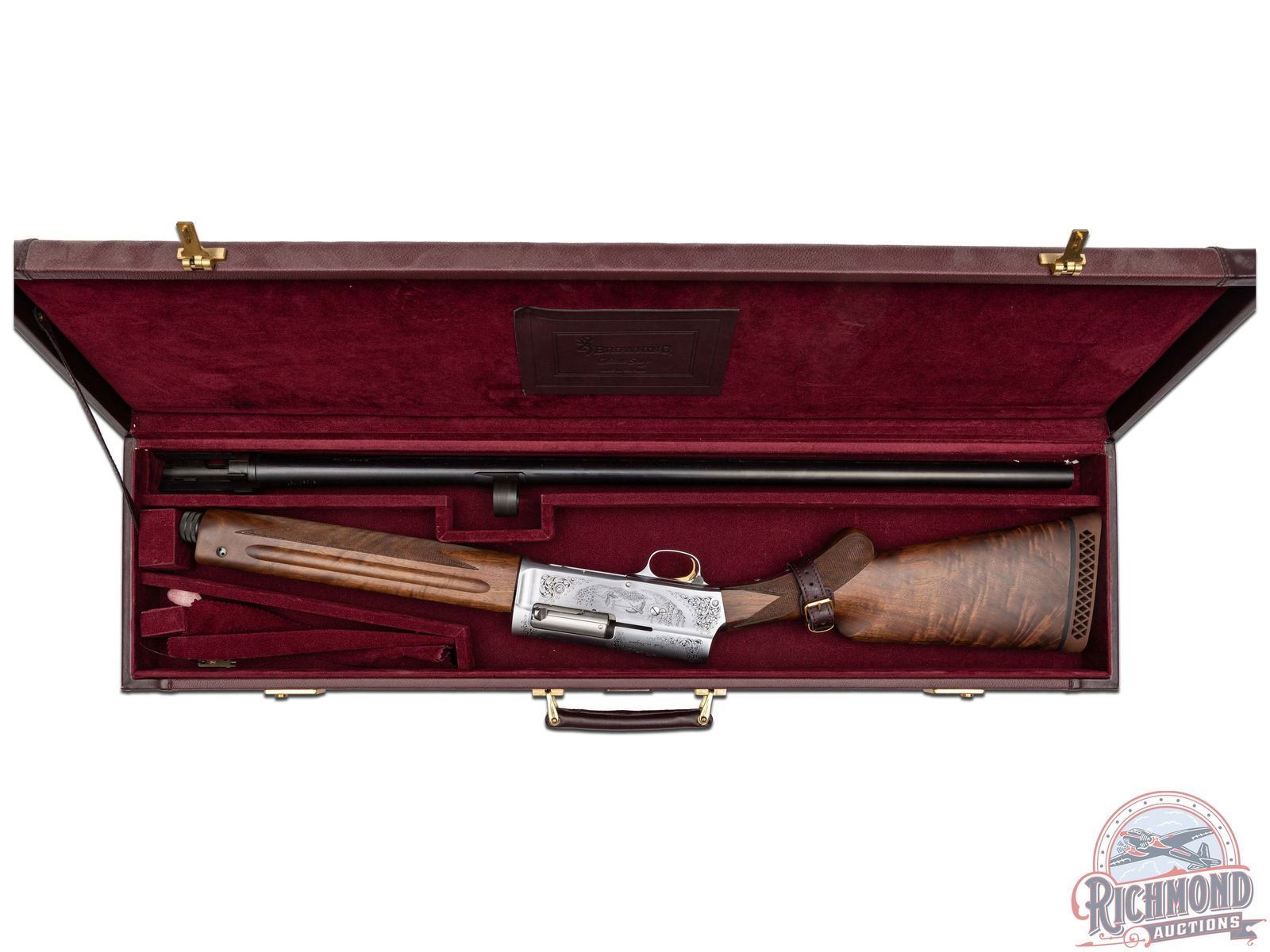 Manufactured in Belgium FN Custom Shop for Browning. Features a 30" blued ventilated rib barrel chambered for 3" magnum shells with Improved choke and nickel bead front sight. Coin finished receiver with Browning Custom Shop engraving. Top of the receiver features floral scroll designs with the left stamped "ORIGINAL AUTO 5" and right "MADE IN BELGIUM". Left side features several grouse in a field scene with a floral scroll design on each side and signed by engraver at the bottom "ROMAINVILLE B.". Right side features two woodcocks in flight in a woodland scene with a floral scroll design on each side. Crossbolt safety and gold washed trigger with Browning Buck logo stamped on the bottom of the guard. Grade IV walnut round knob, long tang stock with checkered pistol grip and matching skeet style forearm with checkering, all in a satin oil finish. Fitted with a factory brown ventilated recoil pad. Comes in a nice Emmebi burgundy velvet lined leather Browning Custom Shop take-down case. Includes original Browning paperwork, box and shipping box as well. LOP: 14". DAC: 1-5/8". DAH: 2-1/2". CALIBER: 12 GA. S/N: 151CS01797. FFL STATUS: Modern.