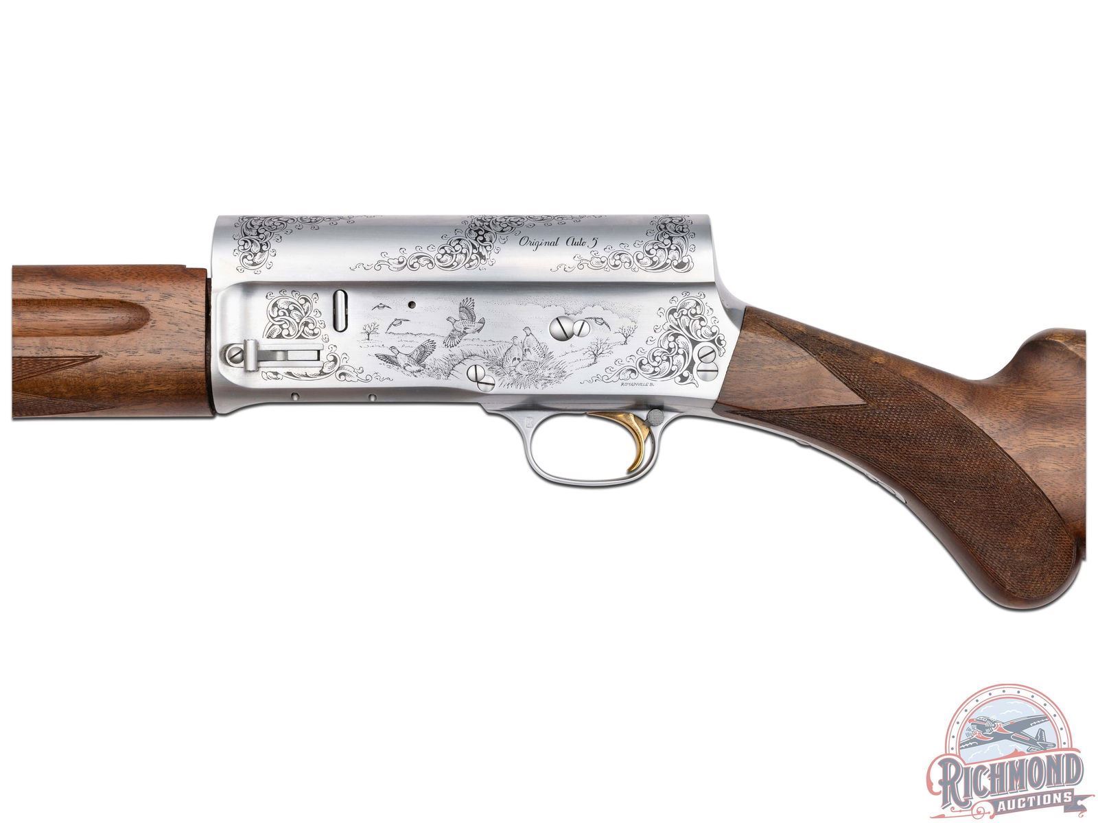 Lots 590 through 596 are scarce and mysterious examples of one of the company’s most legendary shotguns, the Auto-5, which John Browning even called his greatest achievement. After A5 production ended in 1998, it is believed that some spare parts were uncovered, leading Browning’s Custom Shop to create a very limited quantity of these A5 models. The only known examples are in 20 Gauge and 12 Gauge, each available in a Light and Magnum variation. To add more mystery, these variations were engraved with B3 and B4 patterns. While exact production numbers remain uncertain and are a topic of discussion among serious collectors, it is rumored that some of the gauge and engraving patterns featured here may have fewer than five known existing examples. If only eight total gauge and engraving patterns were produced, this offering of seven presents the most complete collection to hit the market at one time.