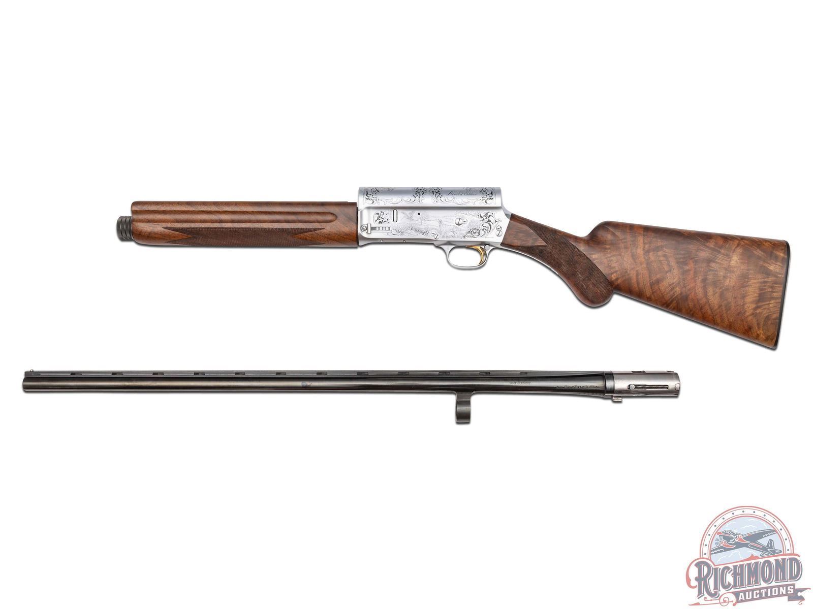Manufactured in Belgium FN Custom Shop for Browning. Features a 28" blued ventilated rib barrel chambered for 3" shells with Improved Cylinder choke and nickel bead front sight. Coin finished receiver with Browning Custom Shop engraving. Top of the receiver features floral scroll designs with the left stamped "LIMITED EDITION" and the right stamped "ORIGINAL AUTO 5 / MADE IN BELGIUM". Left side features a woodcock in flight and setter in a field scene with floral scroll design on each side and signed by engraver at the bottom "ROMAINVILLE B.". Right side features a woodcock in flight and setter in a field scene with floral scroll design on each side along with a large FN logo. Crossbolt safety and gold washed trigger. Grade IV walnut round knob, long tang stock with checkered pistol grip and matching skeet style forearm with checkering. Fitted with a factory butt plate. Comes in a nice Emmebi burgundy velvet lined leather Browning Custom Shop take-down case with factory paperwork. Includes original Browning box as well. LOP: 14". DAC: 1-1/2". DAH: 2-1/4". CALIBER: 20 GA. S/N: 161CS01643. FFL STATUS: Modern.