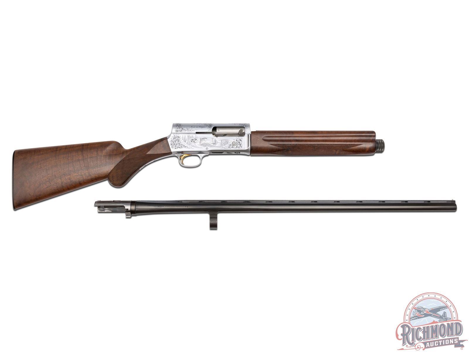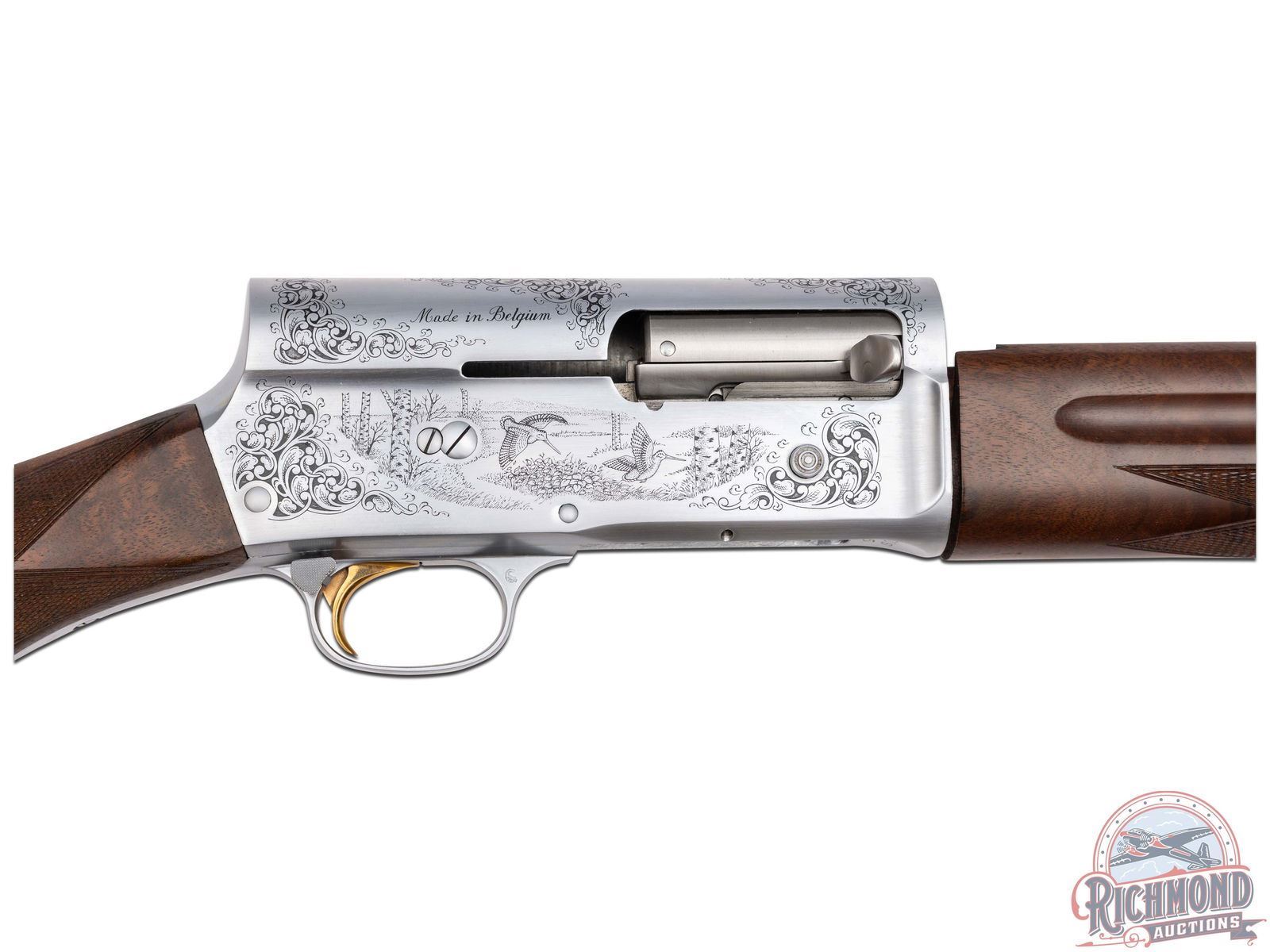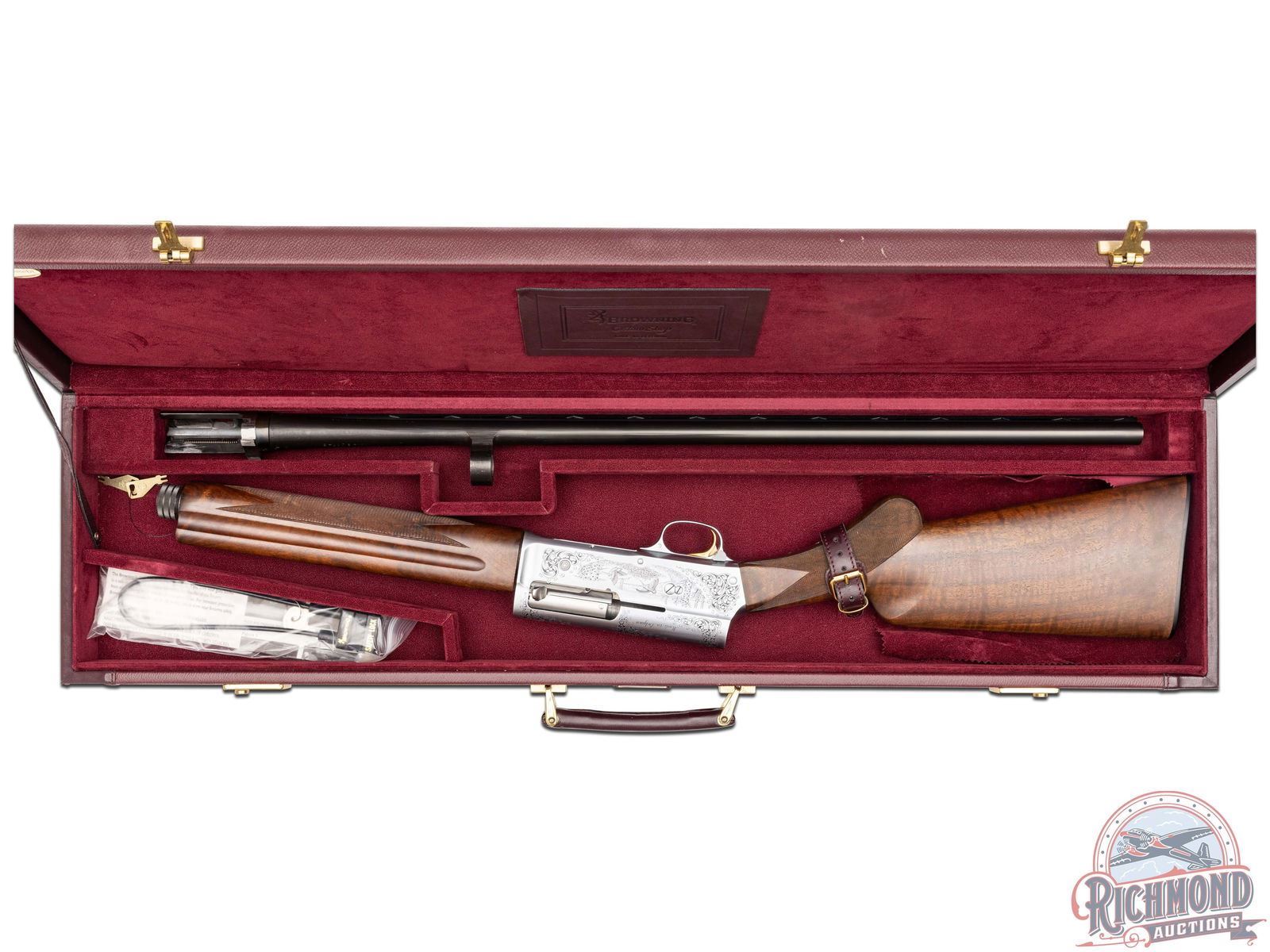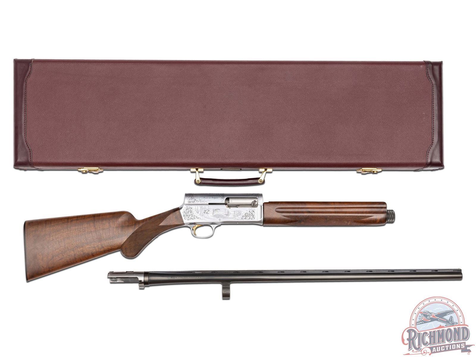 Lots 590 through 596 are scarce and mysterious examples of one of the company’s most legendary shotguns, the Auto-5, which John Browning even called his greatest achievement. After A5 production ended in 1998, it is believed that some spare parts were uncovered, leading Browning’s Custom Shop to create a very limited quantity of these A5 models. The only known examples are in 20 Gauge and 12 Gauge, each available in a Light and Magnum variation. To add more mystery, these variations were engraved with B3 and B4 patterns. While exact production numbers remain uncertain and are a topic of discussion among serious collectors, it is rumored that some of the gauge and engraving patterns featured here may have fewer than five known existing examples. If only eight total gauge and engraving patterns were produced, this offering of seven presents the most complete collection to hit the market at one time.