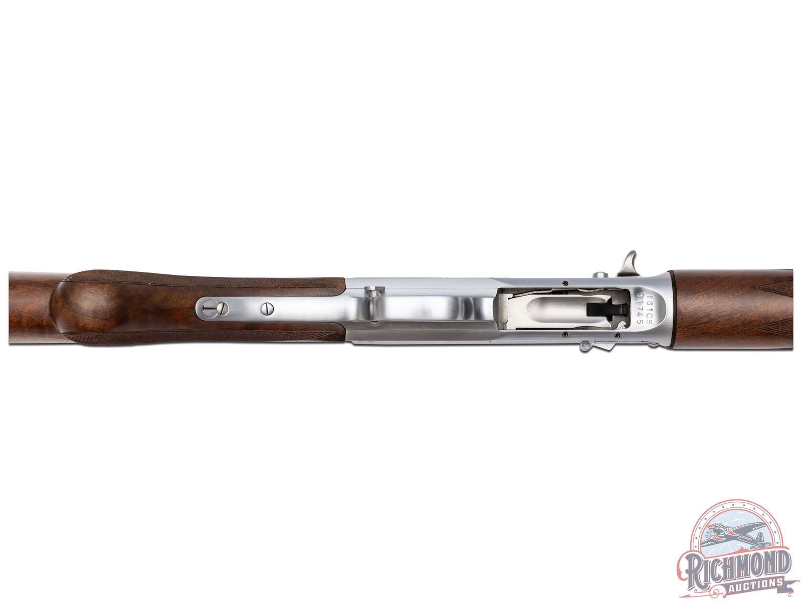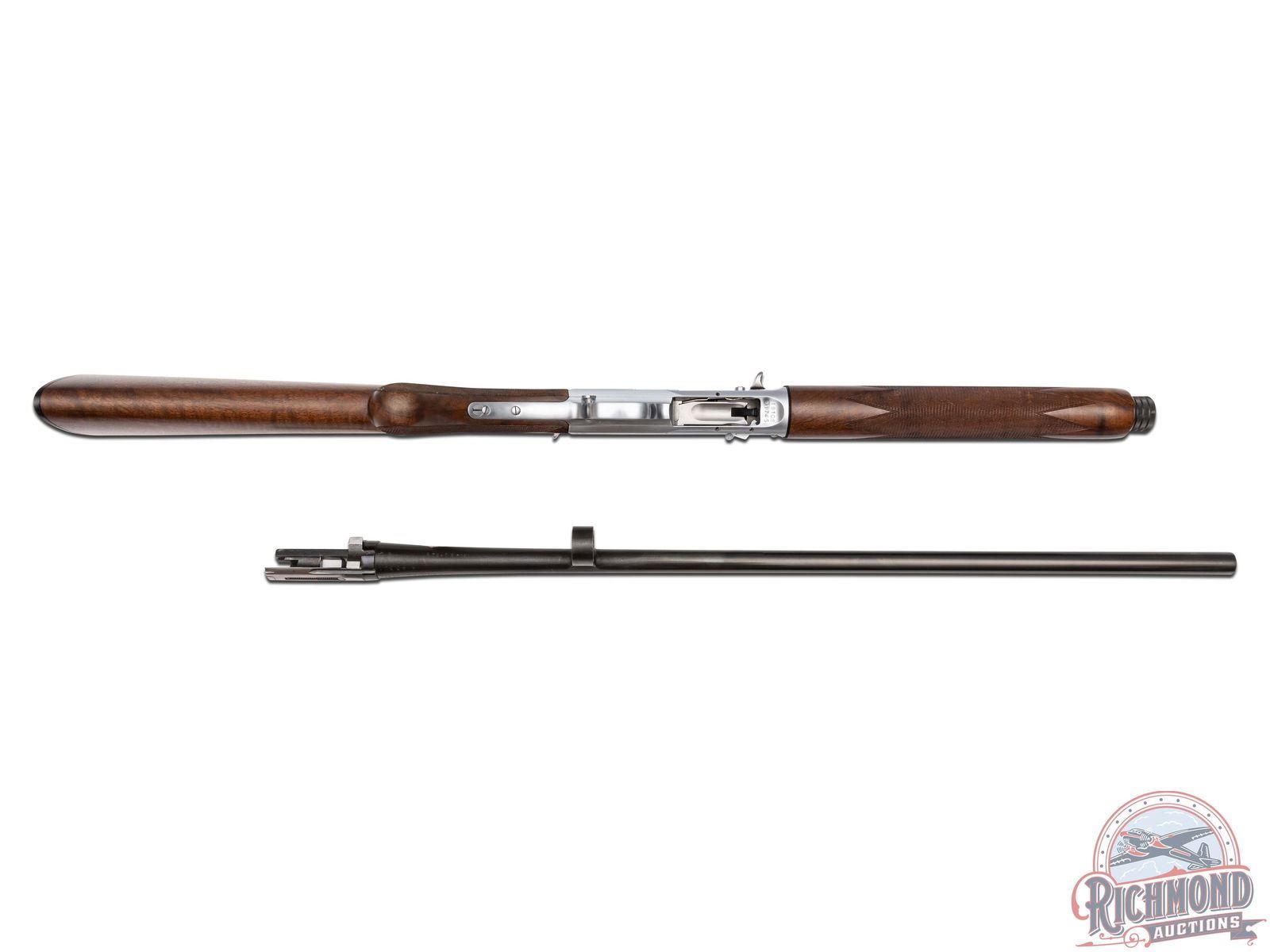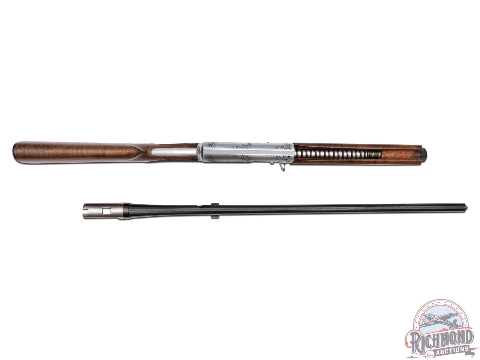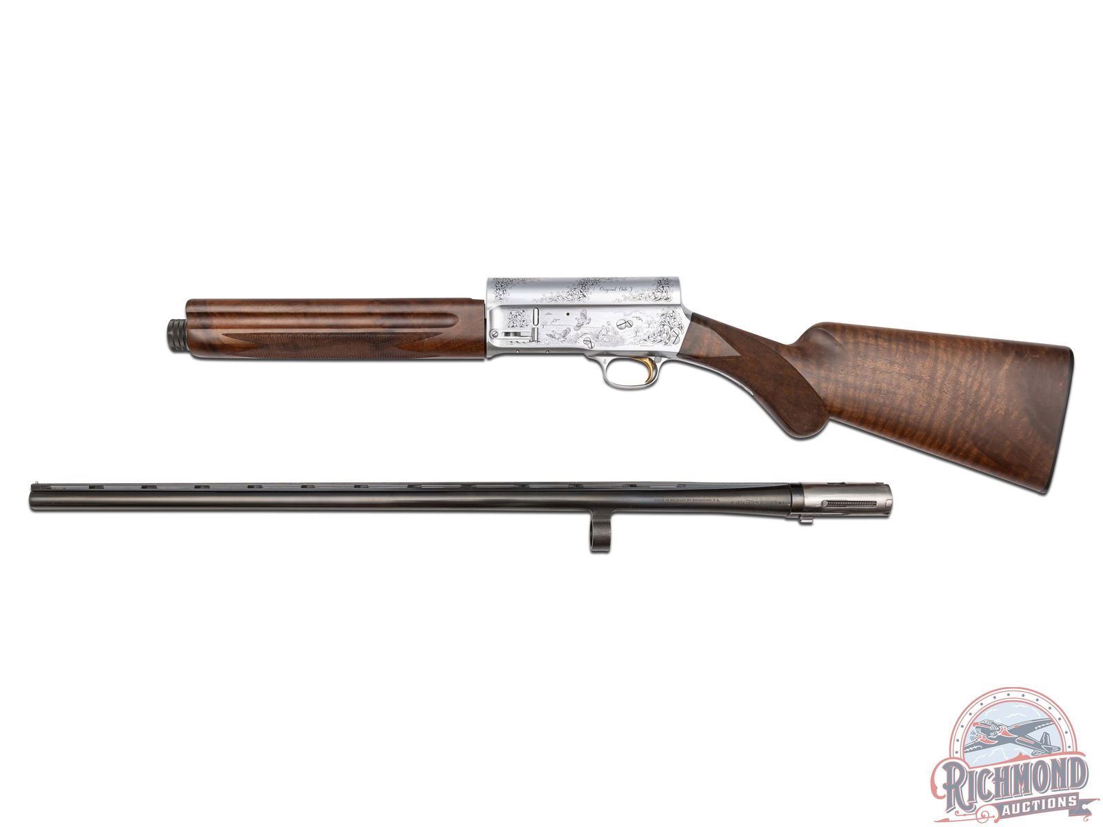 Lots 590 through 596 are scarce and mysterious examples of one of the company’s most legendary shotguns, the Auto-5, which John Browning even called his greatest achievement. After A5 production ended in 1998, it is believed that some spare parts were uncovered, leading Browning’s Custom Shop to create a very limited quantity of these A5 models. The only known examples are in 20 Gauge and 12 Gauge, each available in a Light and Magnum variation. To add more mystery, these variations were engraved with B3 and B4 patterns. While exact production numbers remain uncertain and are a topic of discussion among serious collectors, it is rumored that some of the gauge and engraving patterns featured here may have fewer than five known existing examples. If only eight total gauge and engraving patterns were produced, this offering of seven presents the most complete collection to hit the market at one time.