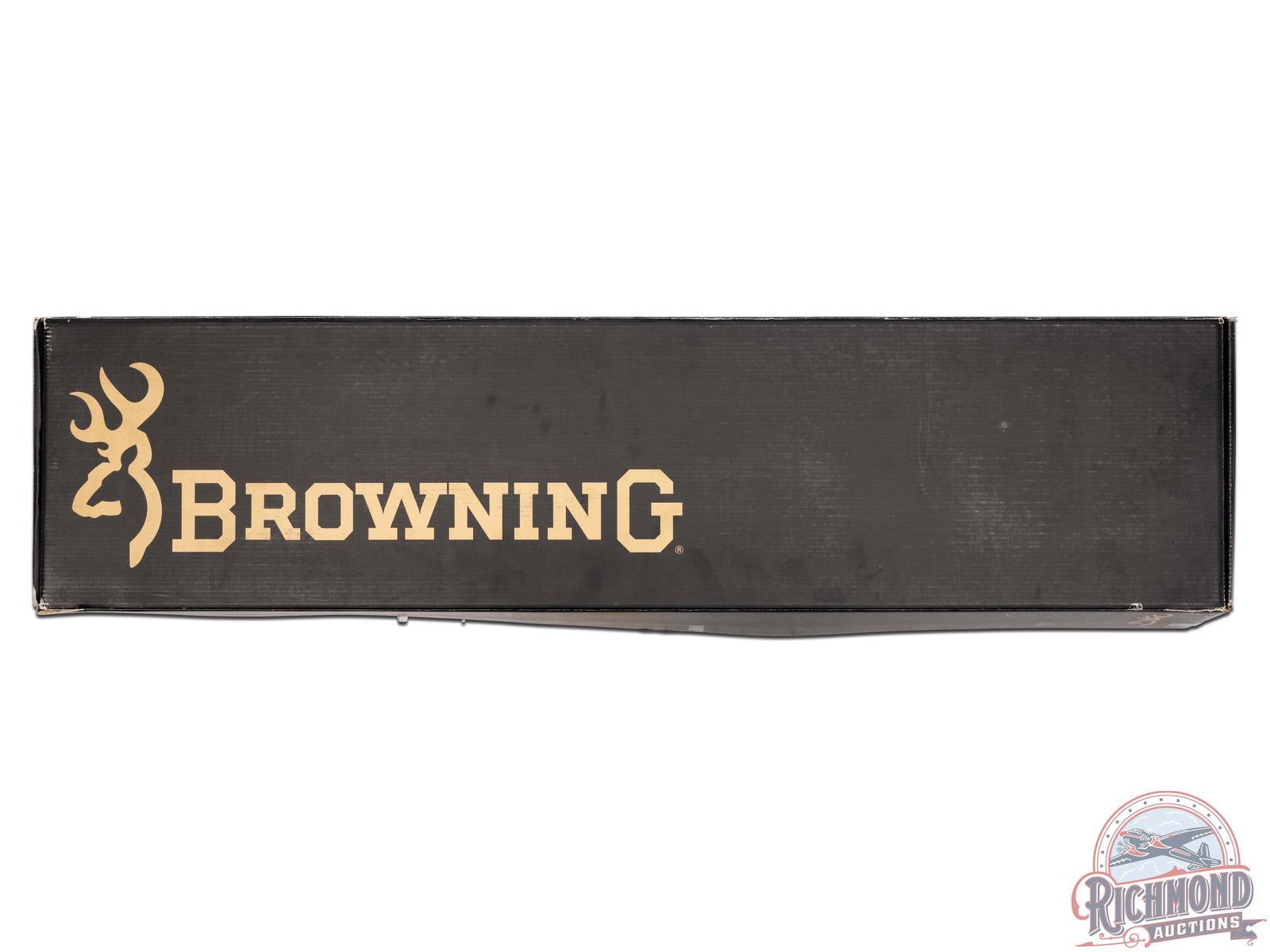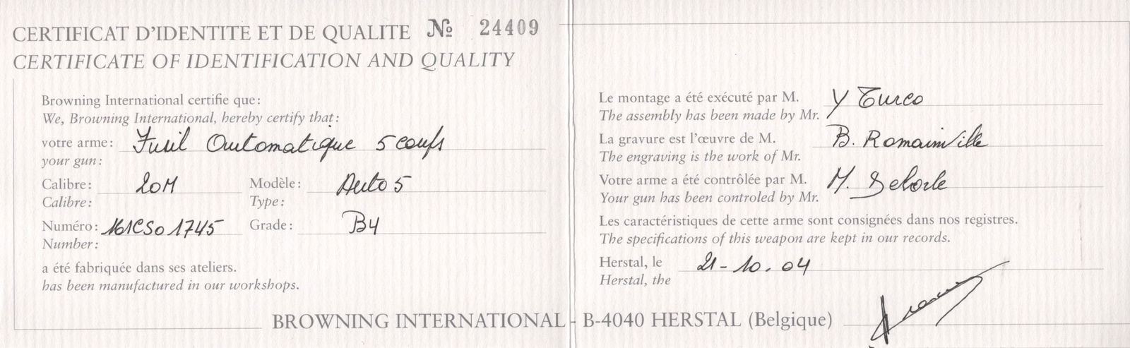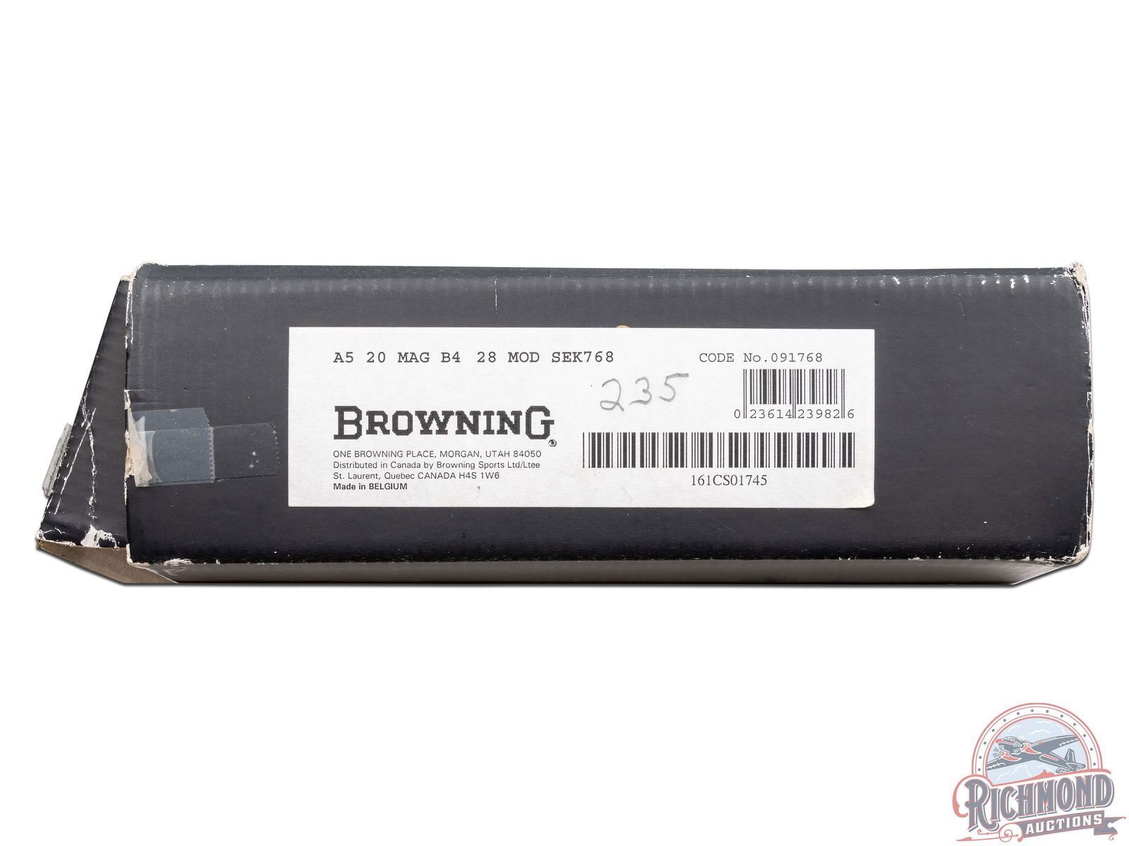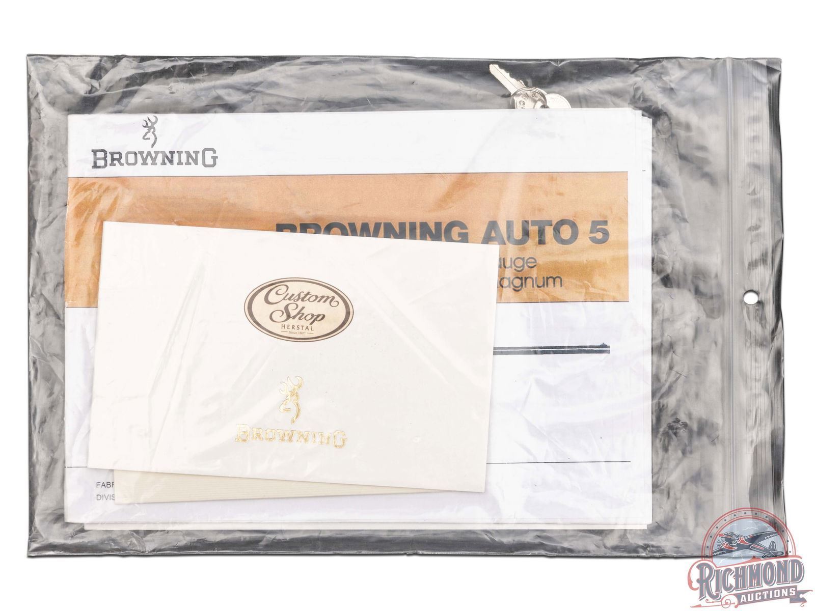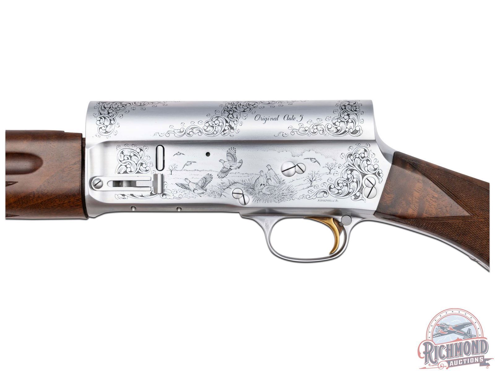 Manufactured in Belgium FN Custom Shop for Browning. Features a 28" blued ventilated rib barrel chambered for 3" shells with Cylinder choke and nickel bead front sight. Coin finished receiver with Browning Custom Shop engraving. Top of the receiver features floral scroll designs with the left stamped "ORIGINAL AUTO 5" and right "MADE IN BELGIUM". Left side features several grouse in a field scene with floral scroll design on each side and signed by engraver at the bottom "ROMAINVILLE B.". Right side features two woodcocks in flight in a woodland scene with floral scroll design on each side. Crossbolt safety and gold washed trigger. Grade IV walnut round knob, long tang stock with checkered pistol grip and matching skeet style forearm with checkering. Fitted with a factory butt plate. Comes in a nice Emmebi burgundy velvet lined leather Browning Custom Shop take-down case with factory paperwork and cable lock. Includes original Browning box as well. LOP: 14". DAC: 1-1/2". DAH: 2-1/4". CALIBER: 20 GA. S/N: 161CS01745. FFL STATUS: Modern.