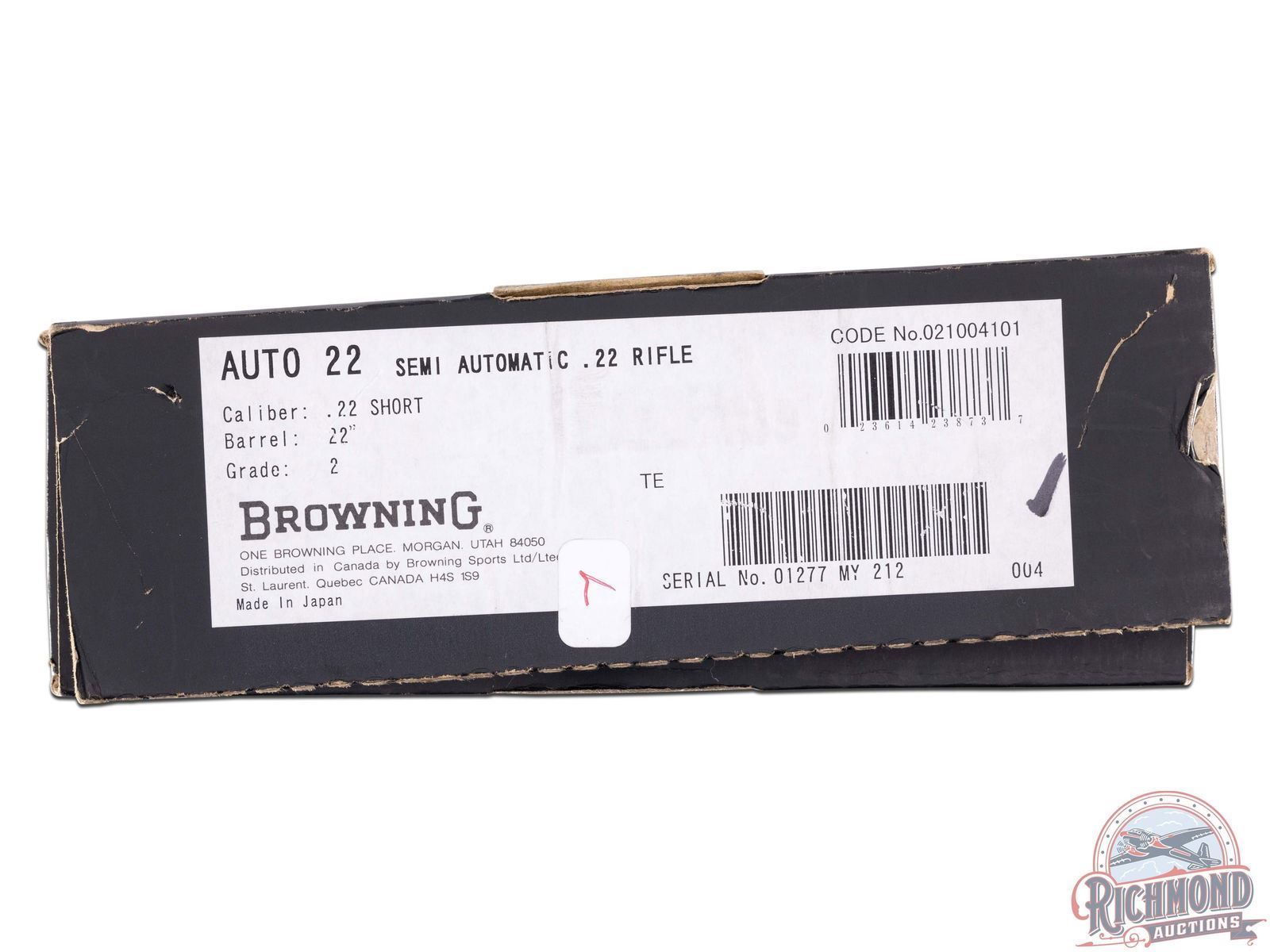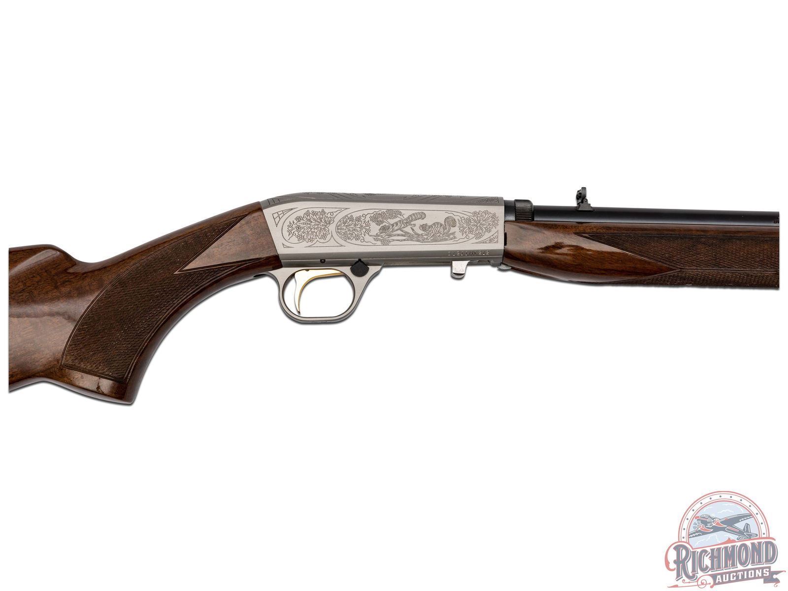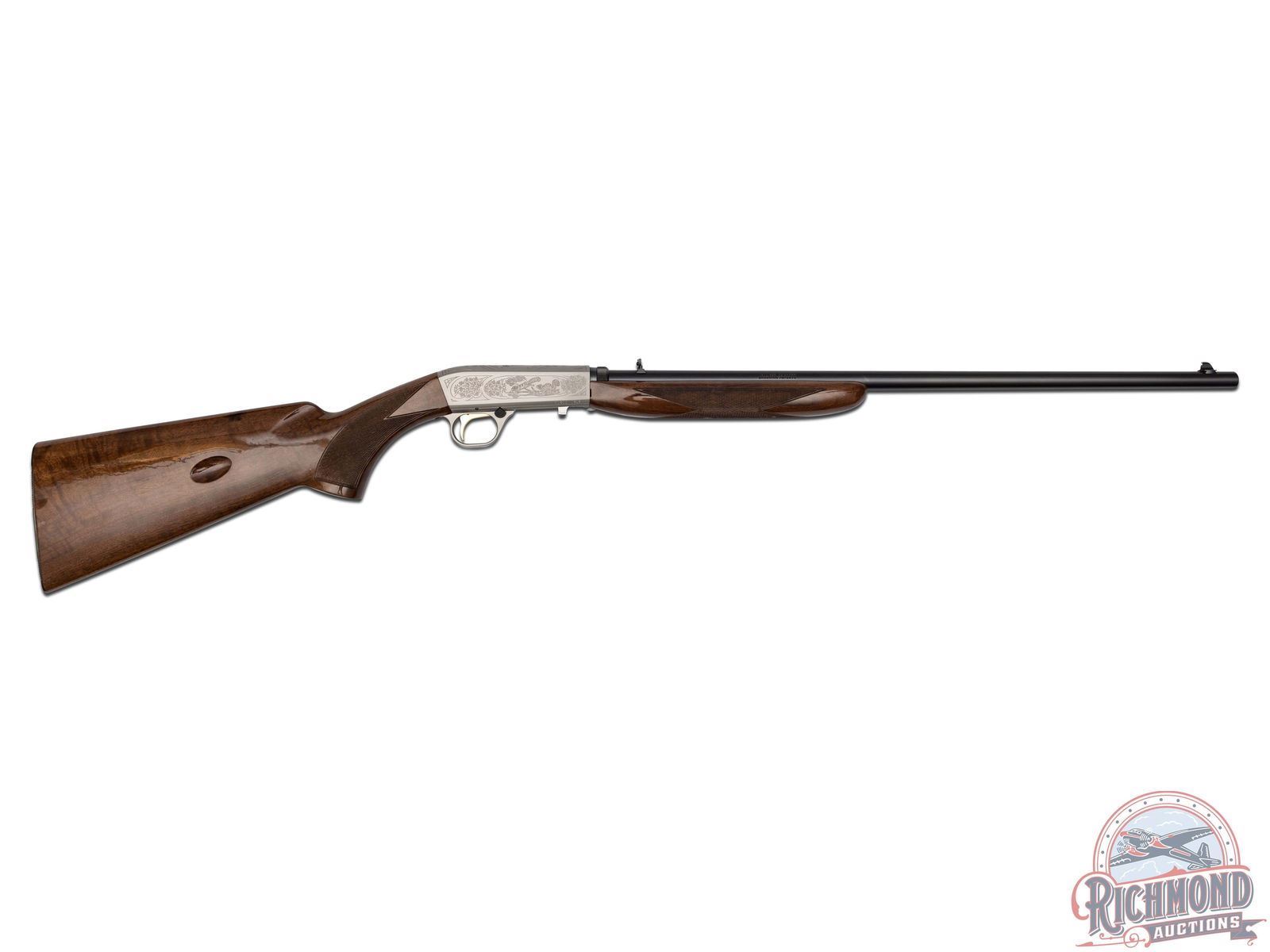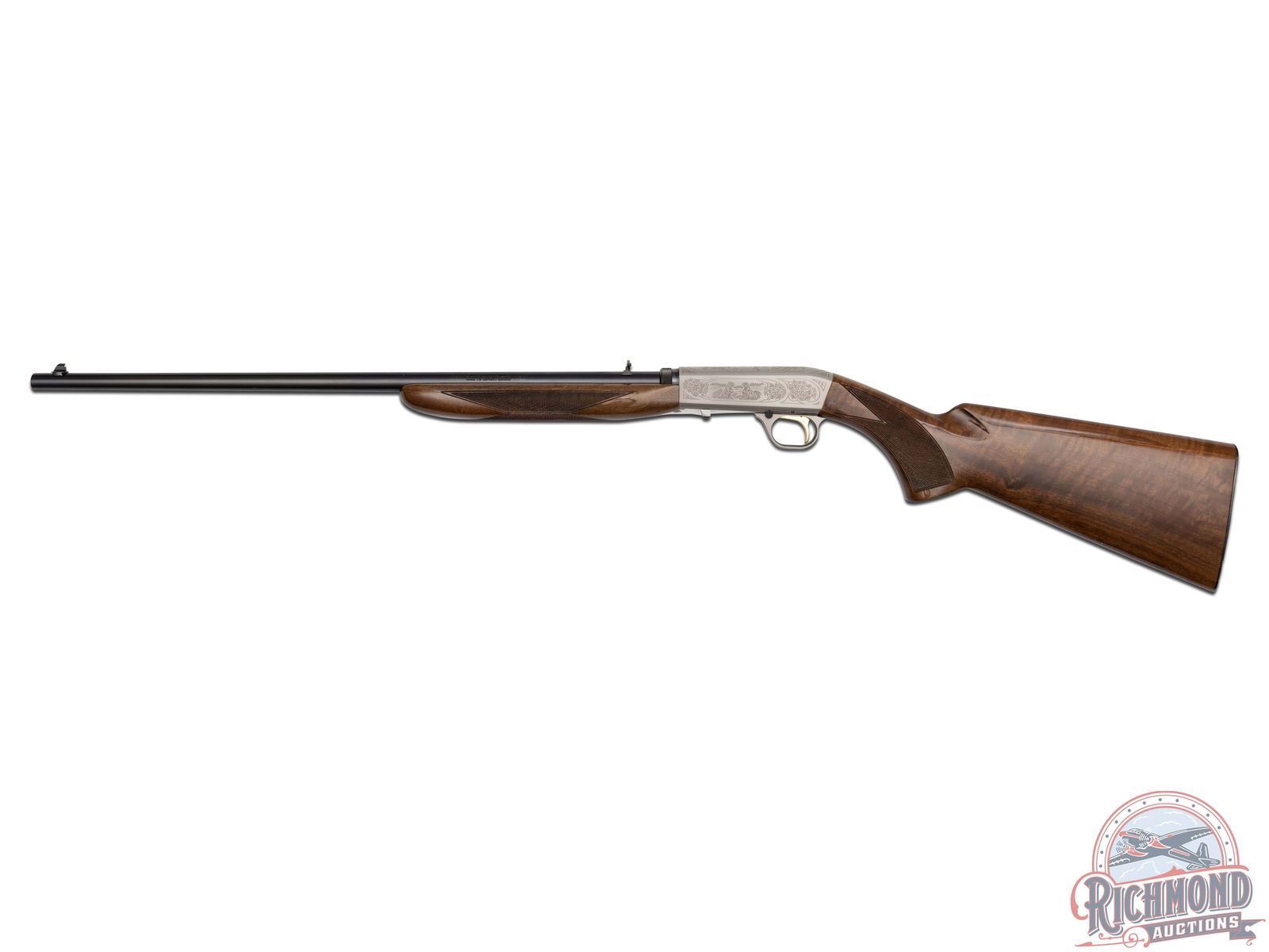 Manufactured in 2002. Blued 22" barrel with hunting sights and factory drilled for scope. Grayed takedown receiver with engraved squirrel and prairie dog scenes. Gold plate trigger with push button safety and tubular magazine. Walnut checkered factory stocks with blued serrated butt plate. Includes the original factory box. CALIBER: 22 SHORT. S/N: 01277MY212. FFL STATUS: Modern.