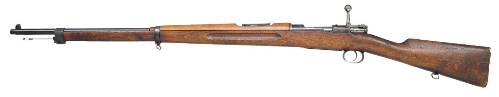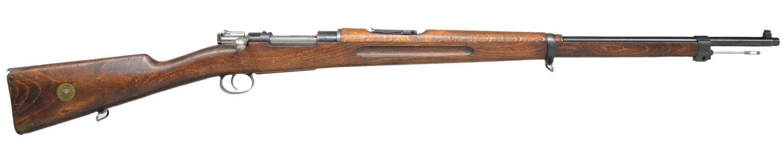 Cal. 6.5 x 55. S# 473044. S#’s match on receiver, bolt & buttplate. Bbl. 29 1/4", import marked on right side. Muzzle has not been threaded for blank adapter. Rear sight graduated to 2000m. Blade front sight receiver marked w/ Swedish crown, crest & “CARL GUSTAFS STANDS GEVARSFAKTORI 1905". Straight bolt handle. Cleaning rod is present. Non matching hardwood stock set. Buttstock has brass condition disk in right side. CONDITION: stock set has moderate wear, staining & handling marks. Buttstock has four tiny holes in right side due to removal of ballistic tag. Metal has 75% original finish w/ thinning & light wear. Very good shiny bore. CURIO. (21-410/RW). CURIO. $700-900.