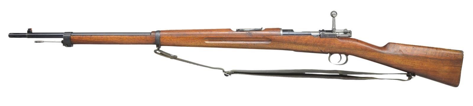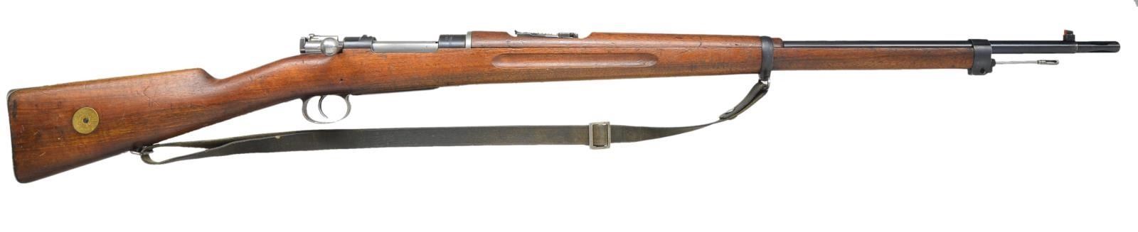 Cal. 6.5 x 55. S# 200207. S#’s match on receiver, bolt, bolt stock, buttplate & rear sight. Bbl. 30 3/4" including aftermarket screw on flash suppressor. Import marked on right side of bbl. Ladder rear sight graduated to 2000m. Blade front sight has added red paint. Receiver marked on top w/ Swedish crown & crest & “CARL GUSTAFS STADS GEVARSFAKTORI 1905”. Straight bolt handle. Cleaning rod is present. 7/8 Military style leather carrying strap. Walnut stock & handguard. Buttstock has brass condition disk on right side. CONDITION: stock set has moderate wear. Thinning finish, dents & scratches. Buttstock has 4 tiny holes due to removal of ballistic tag. 2 1" cracks behind receiver tang. Metal retains 70% original finish w/ thinning light wear & scratches. Good, shiny bore w/ light wear to lands. (21-563/RW). CURIO. $300-500.