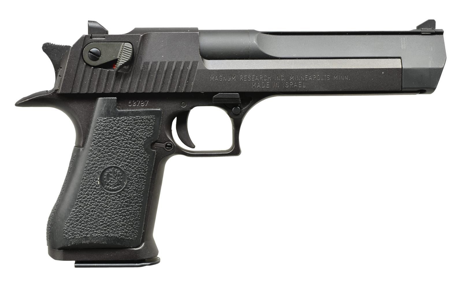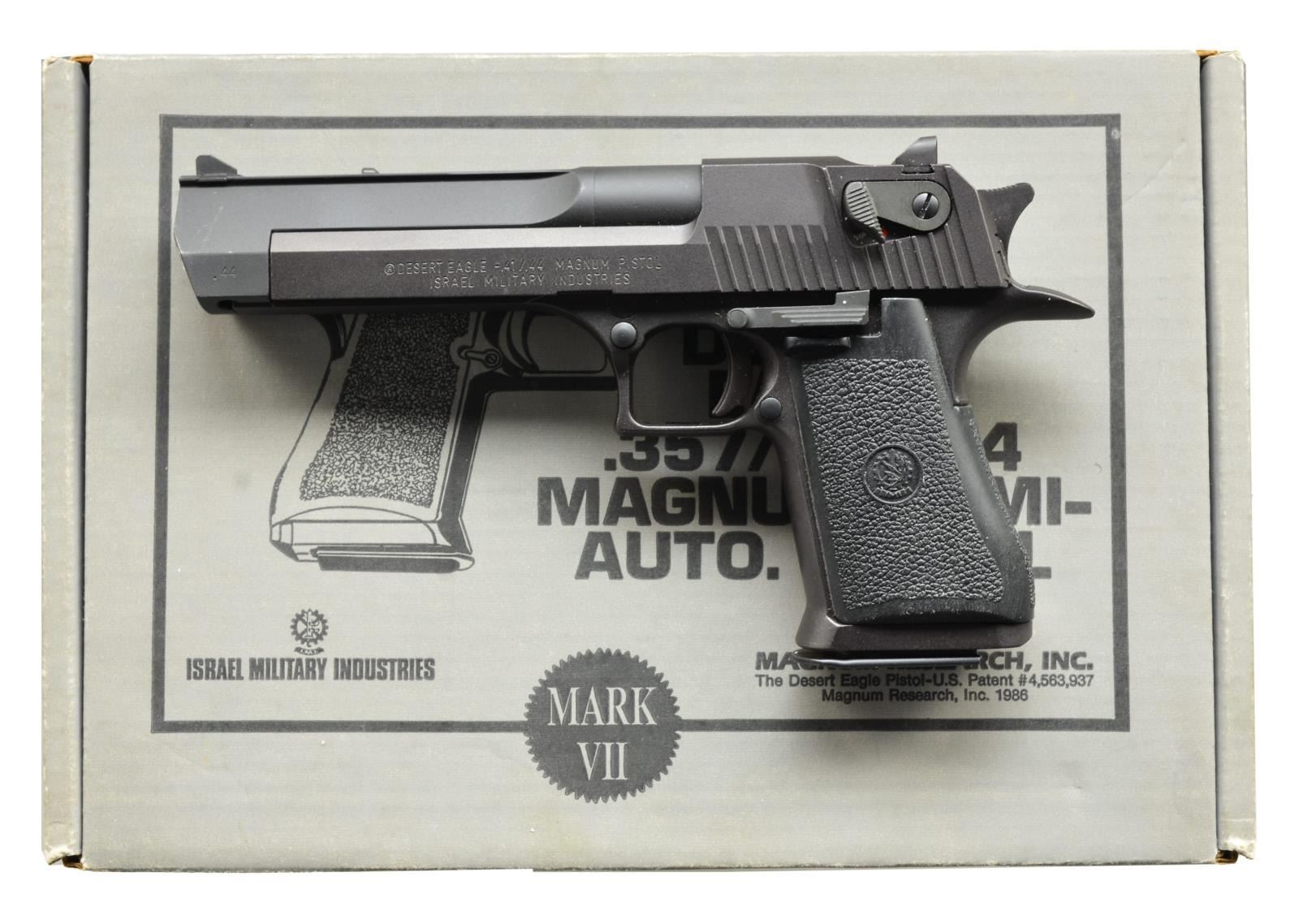 Cal. 41/44. S# 53787. Bbl. 6 1/4". The classic Desert Eagle branded long ago by Hollywood & the alternative music community as the "Deagle", chambered in the powerful & icon 44 Mag. This matte black frame is convertible between 41 & 44 Mag. w/ the proper bbl. Fixed blade front sight. Drift adj. rear sight. Traditional single action, gas operated mechanism w/ rotating bolt to tame the otherwise uncomfortable recoil. Ambidextrous safety on rear serrated slide. Factory plastic wrap around pistol grips. Beveled mag. well. MAGS: 1-8 rd. factory. UNATTACHED ACCESSORIES: Magnum Research factory box, paperwork. CONDITION: finish coverage is correct & complete w/ gentle thinning at some high spots, primarily around muzzle. It doesn’t appear to have been utilized a great amount. Bore is shiny w/ polygonal rifling as it should be. Fire control mechanism appears to function correctly when cycled by hand. (21-644/JZ). MODERN. $700-1,100.