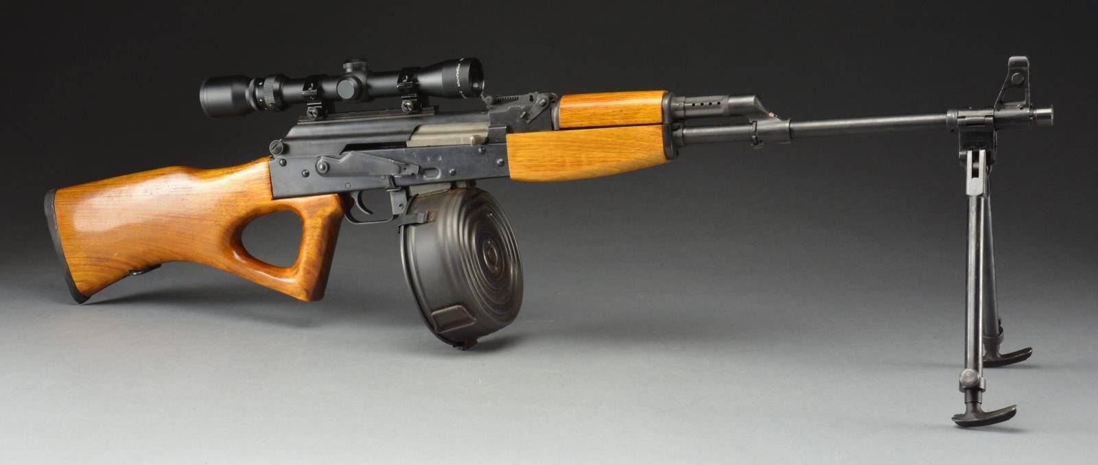 Cal. 7.62x39. S# 9304969. Bbl. 21". The NHM 91 was an early politically correct RPK variant that became known in the early 1990's. The first Bush Administration over saw changes to the import laws which restricted guns coming in to the United Sates to meet a "sporting" criteria. This would eventually be adopted to pertain to domestic Mfg. in 1994 & better known as the Clinton Assault Weapon Ban before sun setting 10 years later. Specific physical characteristics had to be addressed & modified prior to import & one of the earliest configurations to meet these requirements was the NHM 91. Identical in function to the original RPK but altered in aesthetics, imports continued. These changes included no threaded muzzle which was often addressed by blind pinning a thread protector over the muzzle & no pistol grip which brought us the earliest generations of thumb hole stocks. Bayonet lugs were also forbidden so the ears were typically clipped or the entire lug was milled off. This specific example was Mfg. in China by Norinco & imported through CSI in ONT, CA. still resides in its 1990's legal import configuration. Pinned thread protector at muzzle in front of protected post front sight. Folding bipod w/ legs telescoping to13". Milled off bayonet lug. Rear tangent sight marked to 800m. Hardwood thumb hole shoulder stock in a matching yellowish stain to handguards w/ rubber recoil pad. Blued finish on exposed metal surfaces. Top cover has integral scope base & thumb screw which applies pressure to steady this typically loose part. Currently sporting a 2-7x32 Simmons Pro Hunter Scope w/ duplex cross hair. MAGS: Romanian 75 rd. rear loading drum. CONDITION: original blued finish still covers completely w/ thinning on receiver beneath safety selector. Normal associated w/ storage & light use. Wood furniture bares typical impressions but appears free of any noticeable structural damage. Rubber butt pad remains somewhat pliable but becoming brittle. Bore is shiny w/ decent rifling & fire control mechanism appears to function correctly when cycled by hand. (21-1455/JZ). MODERN. $800-1,200.