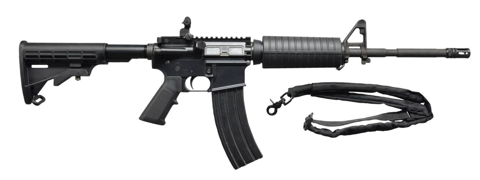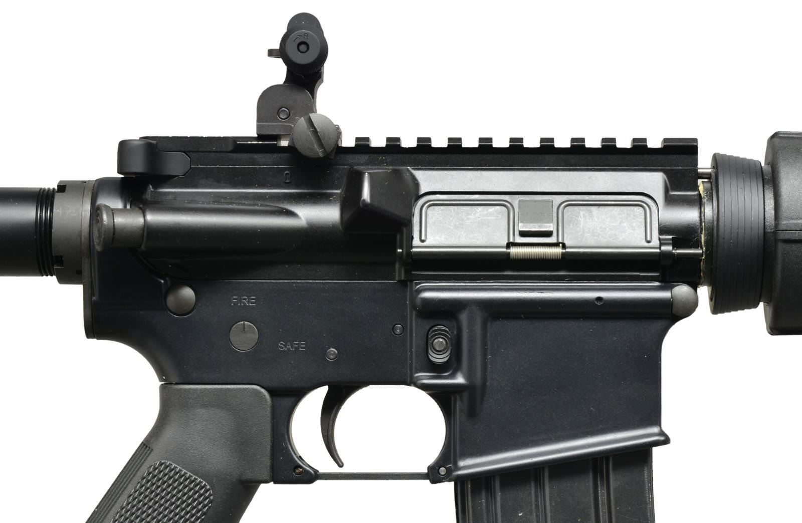 Cal. 223. S# A-1948. Bbl. 16". A black rifle carbine in its classic design, combines the M4 profile bbl. original rnd. handguards & a flat top upper receiver into an effective & lightweight package. Standard protected post front sight combined w/ the bayonet lug & gas block & an appropriate rear peep sight mfg. by YHM. Brass deflector & rnd. forward assist round out this keystone upper. Dark black anodized finish on upper w/ a slightly lighter shade on the lower. 6 Position Tapco collapsible shoulder stock w/ single point sling attached. MAGS: 1-40 rd. CONDITION: finish coverage is complete & consistent w/ no noticeable blemishing. By all appearances, this firearm seems to have spent most of its time in storage. Shiny bore w/ well pronounced rifling. Fire control mechanism appears to function correctly when cycled by hand. (21-433/JZ). MODERN. $600-900.