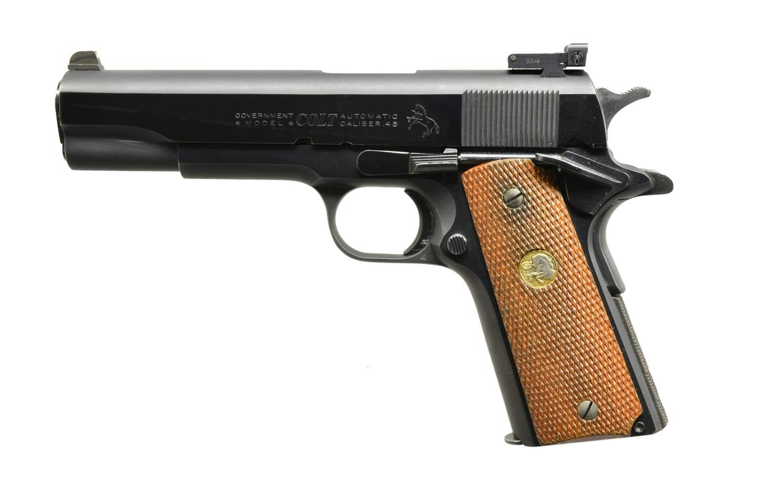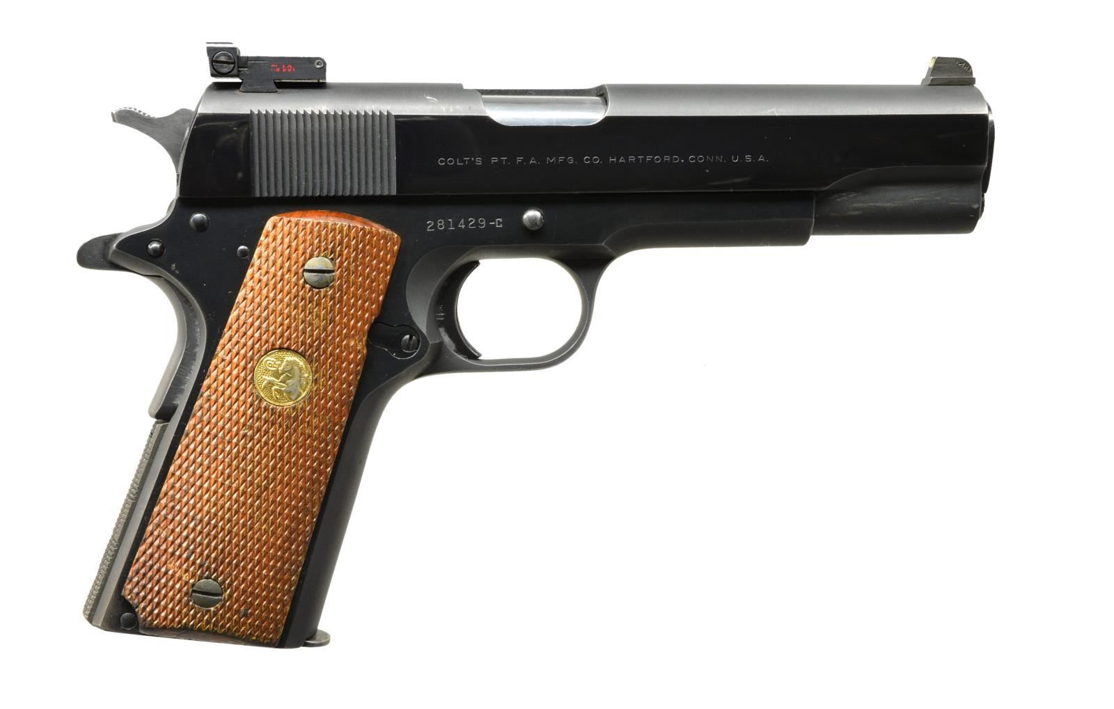 PISTOL. Cal. 45 ACP. S# 281429-C. Bbl. 5" replacement Mark IV Series 70. MH3 custom 3 dot night sights. Blued finish. Mainspring housing has added checkering. 2 Piece checkered walnut grips w/ Rampant Colt medallions. Mfg. 1957. MAGS: 1 detachable 7 rd. UNATTACHED ACCESSORIES: Protecta-gun box. CONDITION: 95% blue showing light carry wear & sm. marks. Grips show wear & spots of dark staining. Bright bore retains strong rifling. (21-972/DS). MODERN. $700-1,000.