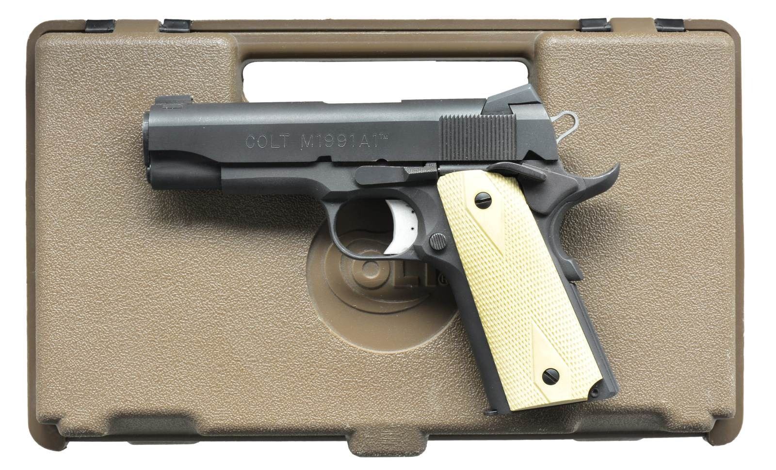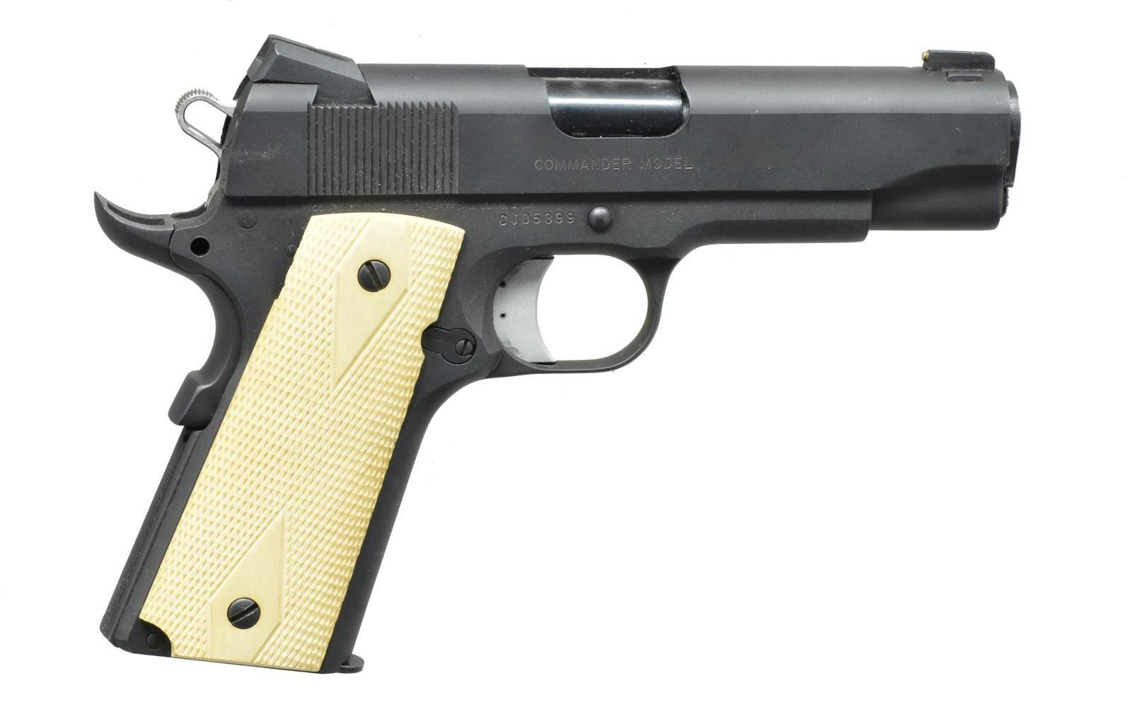 Cal. 45 ACP. S# CJ05399. Bbl. 4". A later Colt variation of the time honored Commander in their M1991 A1 model. Matte exterior finish. Serrated slide w/ drift adj. sights. Extended beaver tail & safety. Serrated slide release. Faux ivory diamond patterned checkered grips. Skeletonized hammer. MAGS: 2 factory 7 rd. UNATTACHED ACCESSORIES brown plastic Colt transport case. CONDITION: finish has light thinning most pronounced in areas of mechanical intervention & some gentle holster wear. Bright bore w/ good riffling & fire control mechanism appears to cycle correctly by hand. (21-1078/JZ). MODERN. $400-600.