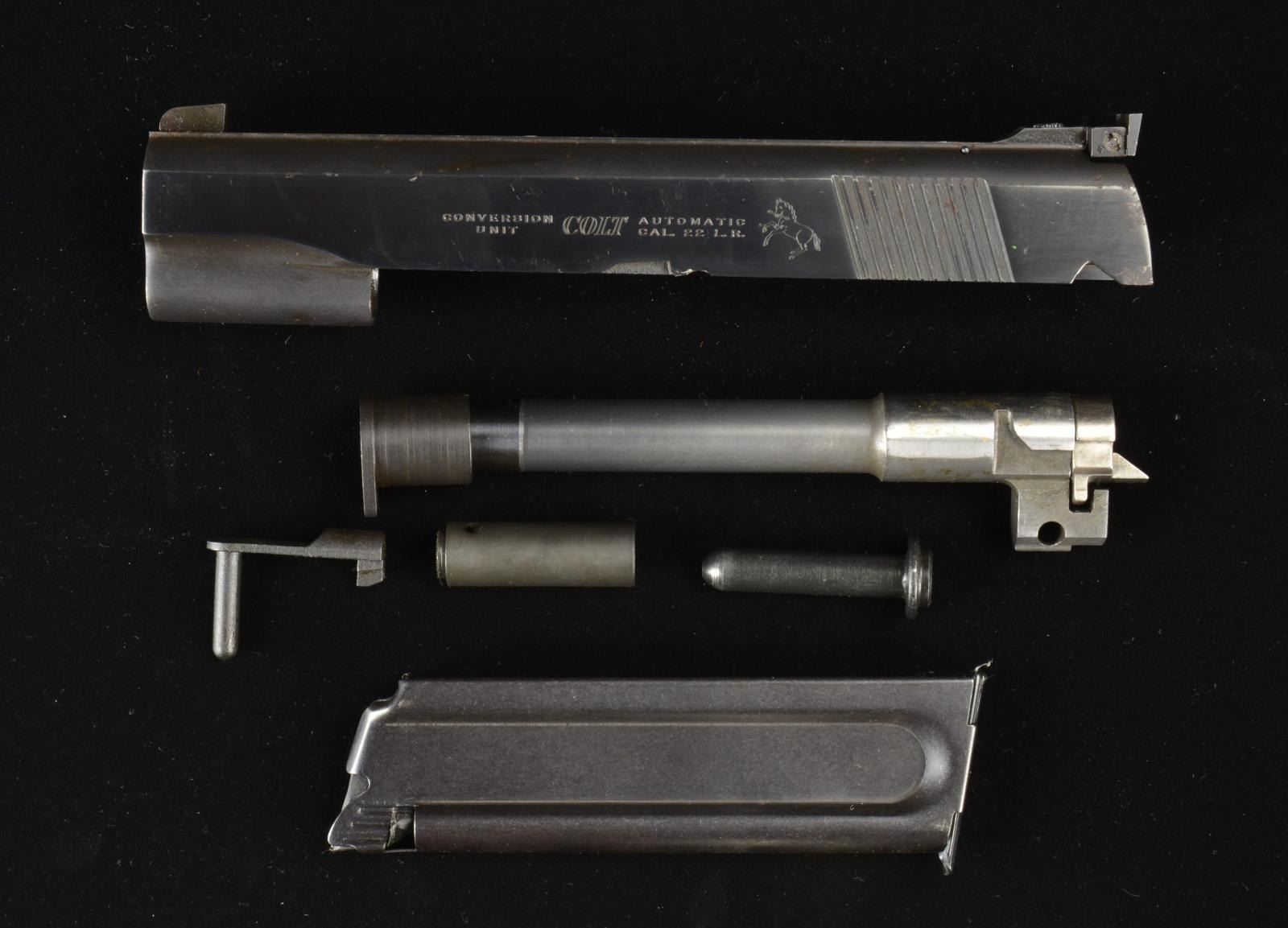 Cal. 22 LR. Bbl. 5" w/ floating chamber. Blued steel slide w/ Patridge front sight & Elliason square notch adj. rear sight. Also includes bbl. bushing, recoil spring guide, spring plug, & slide lock (recoil spring is missing). MAGS: 1-10 rd. No. "468M" new in package. Stored in glass front box. CONDITION: slide retains over 95% blue showing sm. spots of pitting along left side. Bright near excellent bore. (02-14512-1/DS). $250-350.