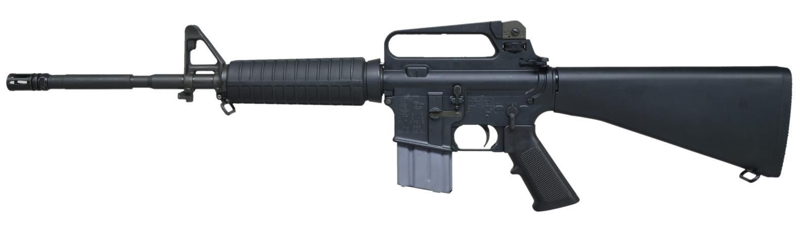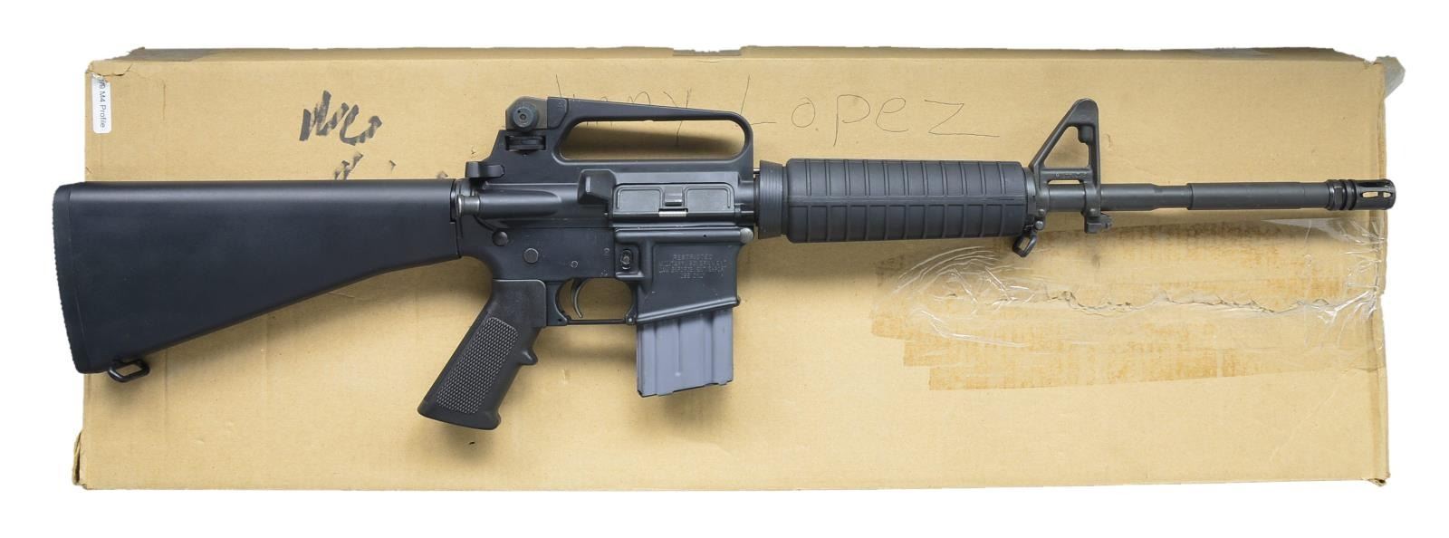 VERSION. Cal. 223. S# LGC022154. Bbl. 16". Between the years of 1994 & 2004, the legality of domestic firearms was determined largely by their aesthetics & attributes. For the first time, guns became classified as pre ban & transitional in regard to federal law. After the sunset of the 1994 AWB, firearms that were made w/ in that slot immediately became legal again & many were sold onto the hungry civilian market. This is one of those examples. The M4 profile bbl. w/ bayonet lug would have been problematic during that time, even though it was ordered w/ a full length A2 trapdoor buttstock. As Federal law required, the right side of mag. well was marked “RESTRICTED”, “MILITARY/GOVERNMENT”, “LAW ENFORCEMENT/EXPORT”, “USE ONLY”. Sights are traditional gas block/bayonet lug combo. Plastic rnd. handguards. Carry handle upper receiver & E2 sight w/ brass deflector & rnd. froward assist. MAGS: 2 aluminum 20 rd. Colt. UNATTACHED ACCESSORIES: factory box, nylon sling, Colt bayonet & scabbard. CONDITION: finish coverage is correct & complete w/ light scratches that are typically associated w/ storage. Furniture is free of any noticeable blemishing. Brass deflector shows only the faintest hint of contact typically illustrating a very low rd. count. Shiny bore w/ strong rifling. Fire control mechanism appears to function correctly when cycled by hand. (21-731/JZ). MODERN. $600-1,000.