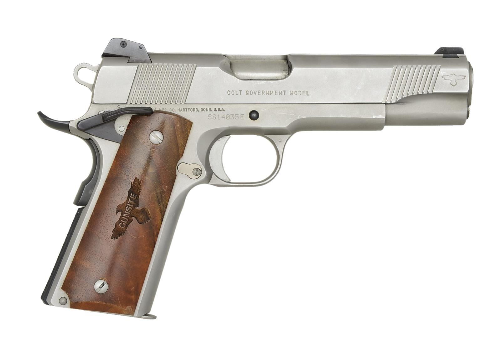 AUTO PISTOL. Cal. 45 ACP. S# SS14035E. Bbl. 5". Slide has raised rib, front & rear serrations w/ Gunsite open wing eagle mark on right side of muzzle. P-TH3 3 dot night sights. Stainless steel construction w/ blued slide lock, ambidextrous safety, beavertail grip safety & grooved mainspring housing. Gunsite 2 Piece walnut grips w/ open wing eagle on both sides MAGS: 2 detachable 7 rd. UNATTACHED ACCESSORIES: blue molded box w/out label. CONDITION: exterior shows carry wear w/ scattered scratches & marks. Grips show scattered handling marks. Bright bore w/ sharp rifling. (21-884/DS). MODERN. $700-1,000.