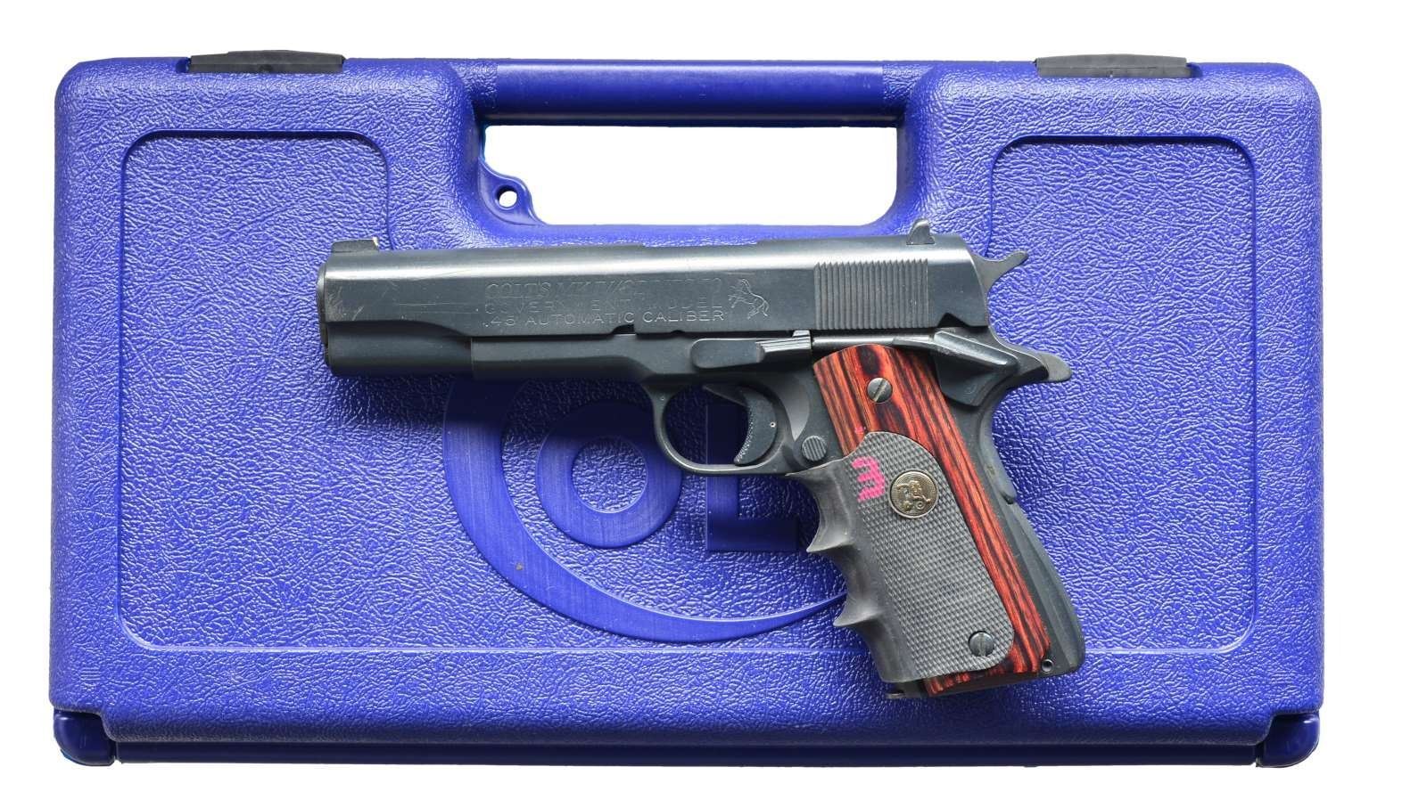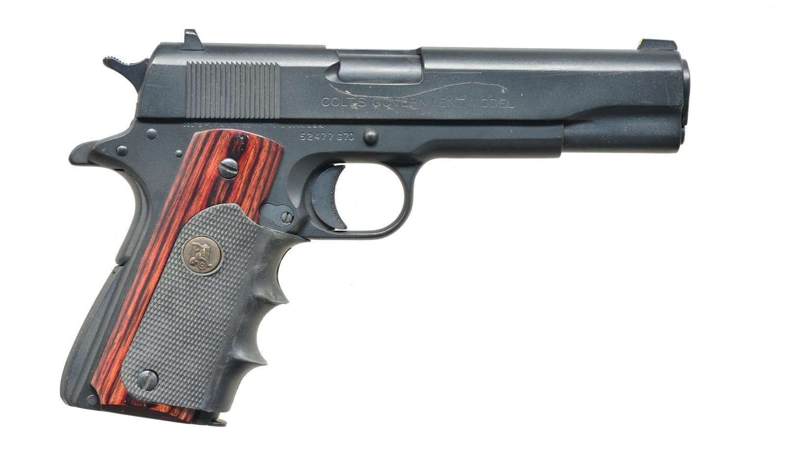 AUTO PISTOL. Cal. 45 ACP. S# 52477G70. Bbl. 5". White ramp blade front sight w/ fixed square notch rear sight. Custom matte black metal finish. Trigger has added checkered shoe. Custom laminated wood grips w/ Pachmayr checkered rubber Gripper insert. Right panel of grip insert has painted "3". Mfg. 1978. MAGS: 2 detachable 7 rd., 1 has added leather on floorplate marked w/ initials "WDF". UNATTACHED ACCESSORIES: blue molded box w/out label. CONDITION: 95% custom metal finish showing scratches on right side of slide w/ weakened markings on left side. Bore shows some darkness in grooves. (21-886/DS). MODERN. $600-900.