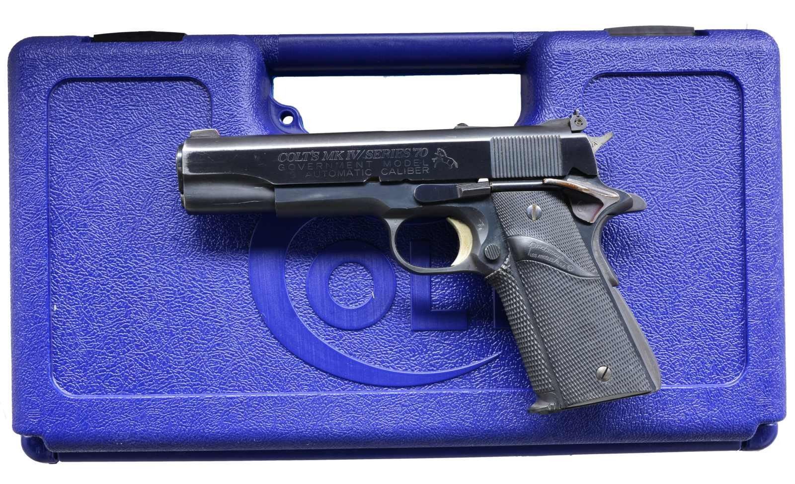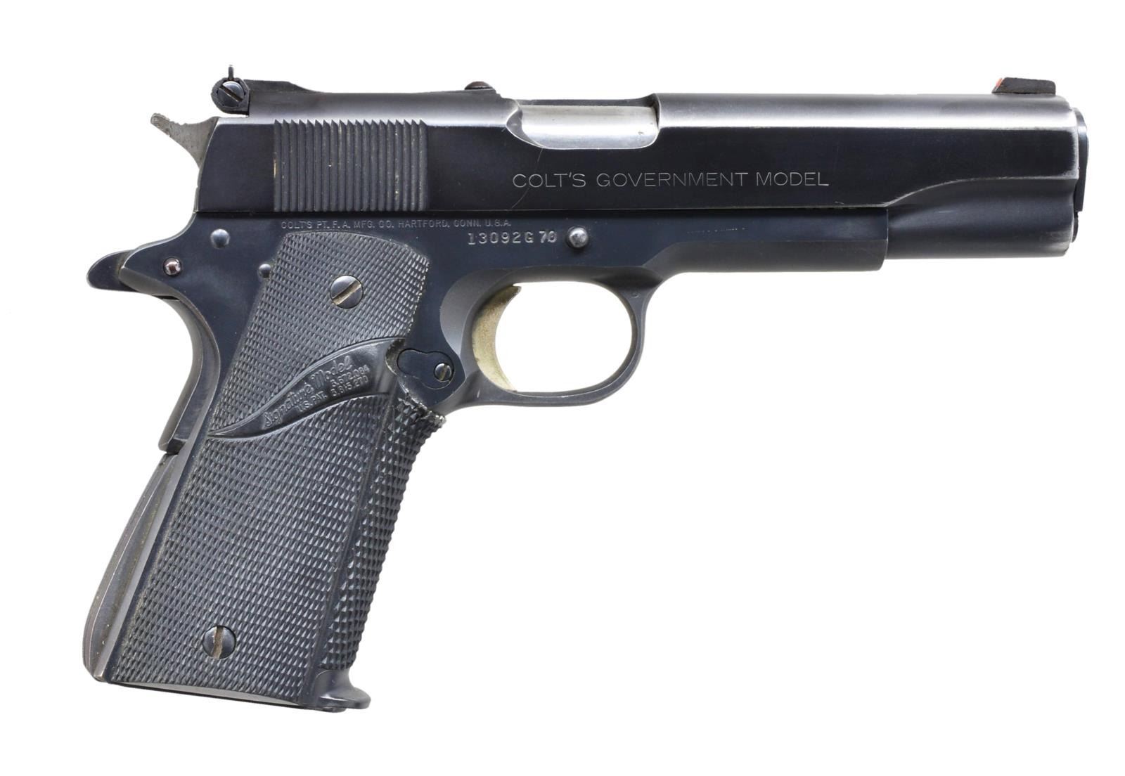 AUTO PISTOL. Cal. 45 ACP. S# 13092G70. Bbl. 5". Red dot front sight w/ white outline adj. rear sight. Left side of hammer marked "SILVA". Pachmayr 1 Piece checkered rubber grips. Mfg. 1976. MAGS: 2 detachable 7 rd. UNATTACHED ACCESSORIES: blue molded box w/out label. CONDITION: slide retains 70% brightly polished reblued finish showing carry wear. Matte finished frame shows 90% w/ light carry wear & handling marks. Very good grips. Bright bore w/ sharp rifling. (21-887/DS). MODERN. $600-900.
