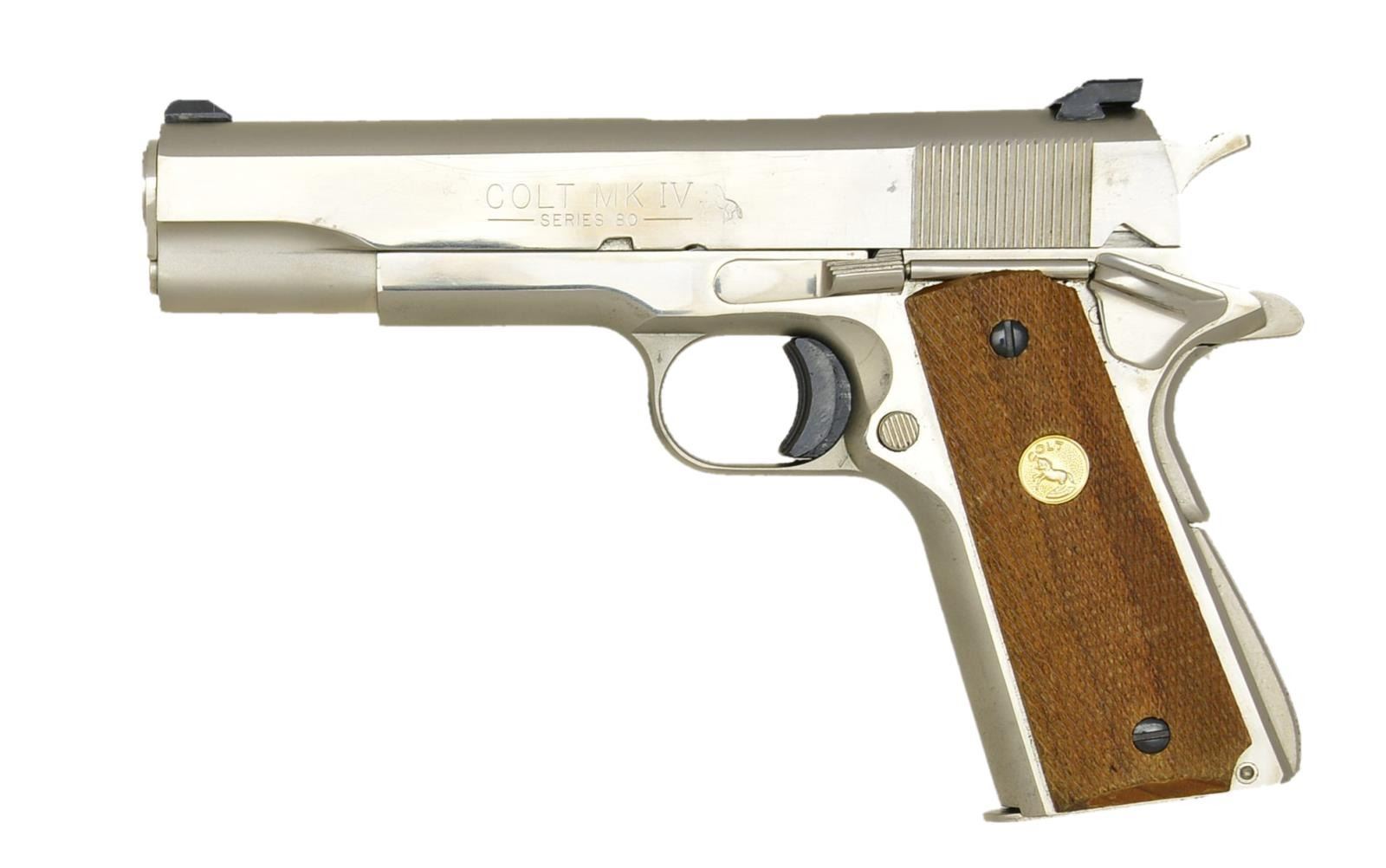 PISTOL. Cal. 45 ACP. S# FG14595. Bbl. 5". White line ramp front sight w/ white outline square notch rear sight. Full nickel finish. Trigger has added wide shoe. 2 Piece checkered walnut grips w/ gold Rampant Colt medallions. Mfg. 1983. MAGS: 1 detachable 7 rd. UNATTACHED ACCESSORIES: Protecta-gun box. CONDITION: over 97% nickel finish showing light wear w/ scattered scratches. Very good grips. Bright bore retains strong rifling. (21-971/DS). MODERN. $800-1,200.