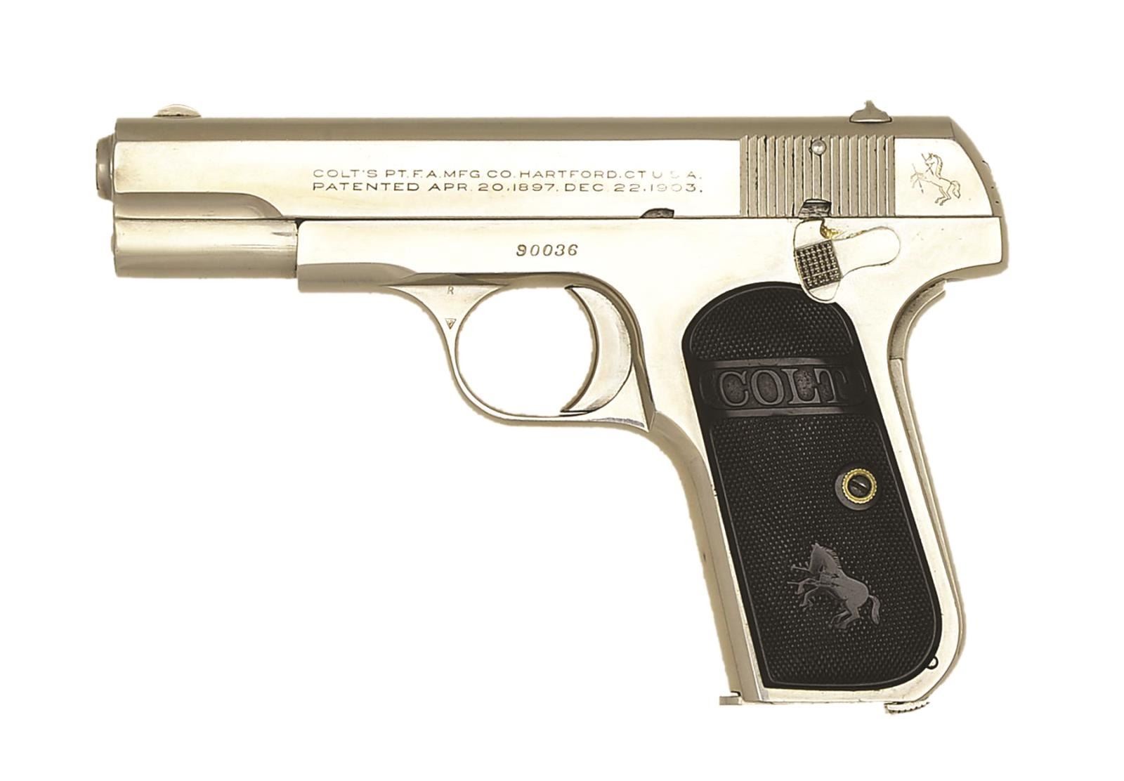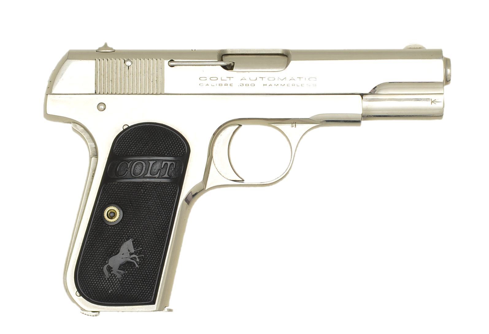 Cal. 380 ACP. S# 90036. Bbl. 3 3/4". Semi circular front sight w/ U-notch rear sight. Full nickel finish w/ 2 piece checkered hard rubber grips w/ Rampant Colt motifs. 1916 Mfg. MAGS: 1 detachable 7 rd. CONDITION: over 95% nickel finish showing scattered light scratches & marks. Very good grips. Bore retains strong rifling. (21-1345/DS). CURIO. $600-900.