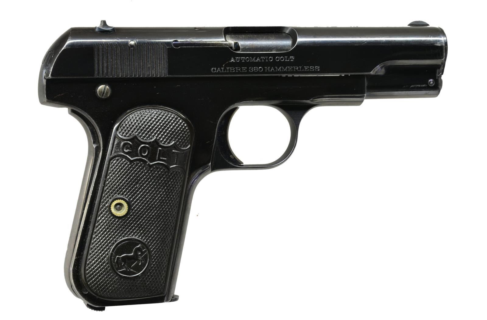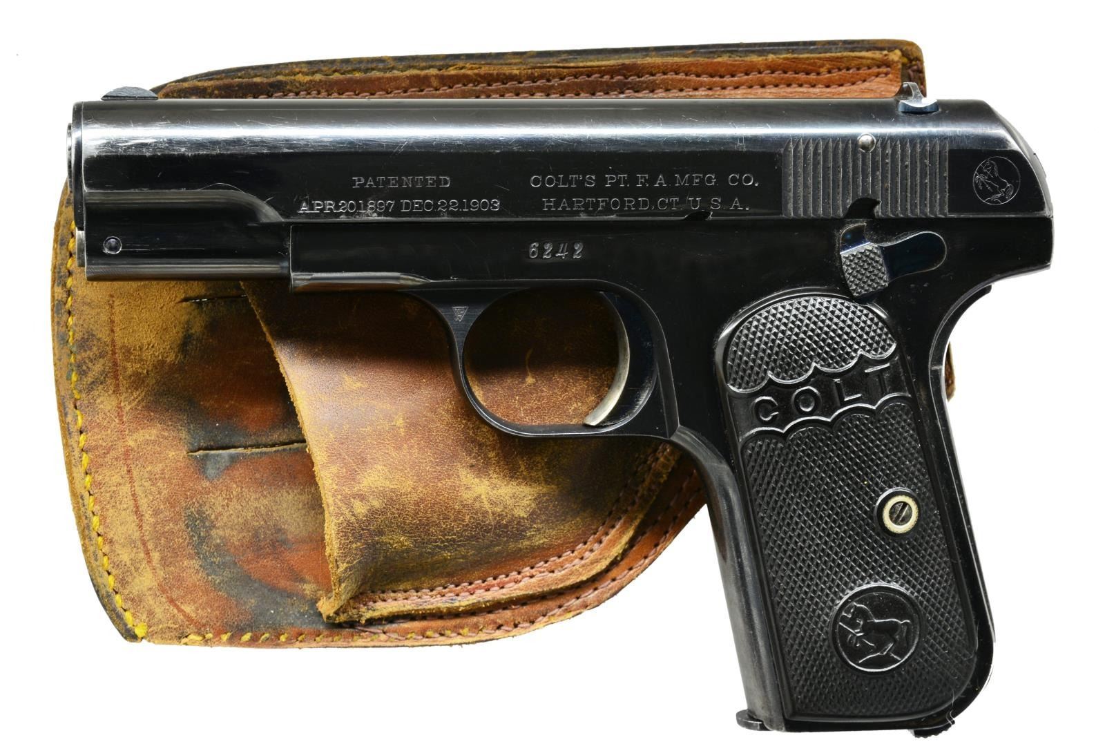 Cal. 380 ACP. S# 6242. Bbl. 3 3/4". Semi circular front sight w/ U notch rear sight. Blue finish w/ case colored trigger & slide lock. 2 Piece checkered hard rubber Rampant Colt grips. MAGS: 1 detachable 7 rd. UNATTACHED ACCESSORIES: leather marked "283/4". CONDITION: 90% blue showing edge & carry wear. Trigger & slide lock retain 75% case colors. Grips show light wear. Rifling shows light wear. (21-317/DS). CURIO. $600-900.