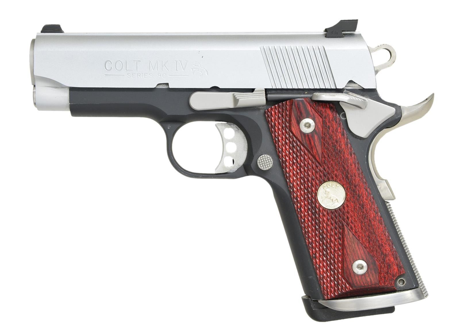 Cal. 45 ACP. S# LF04218E. Colt Custom Shop Mark IV Series 80. Bbl. 4 1/2" w/ tapered contour. Matte stainless finished slide w/ Tru-Dot 3 dot night sights. Matte black finished alloy frame. Features include rnd. Combat Commander hammer, skeletonized trigger, beavertail grip safety, beveled mag. well extension & checkered mainspring housing. 2 Piece checkered laminate grips w/ silver Rampant Colt medallions & hex head screws. MAGS: 1 detachable 7 rd. w/ rubber padded floorplate. CONDITION: over 97% finish showing slight edge wear & sm. marks. Bright bore retains strong rifling. (21-612/DS). MODERN. $800-1,200.
