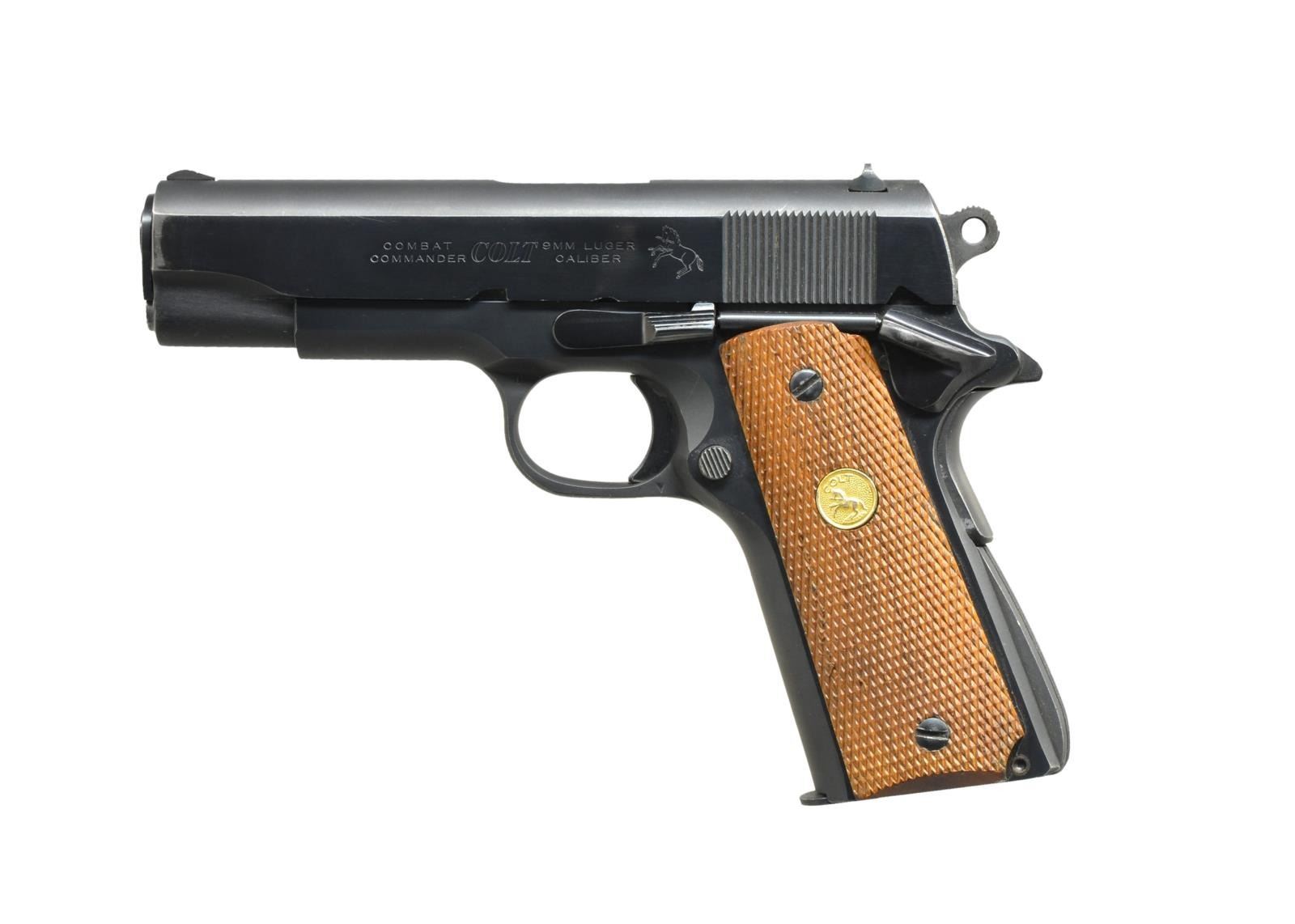 Cal. 9mm Luger. S# 70BS51845. Bbl. 4 1/2". Serrated ramp front sight w/ square notch rear sight. Blue finish. 2 Piece checkered walnut grips w/ Rampant Colt medallions. 1976 Mfg. MAGS: 3 Colt marked 8 rd.: 1 blue & 2 stainless steel. UNATTACHED ACCESSORIES: Military leather dbl. mag. pouch. CONDITION: over 90% blue showing muzzle & edge wear. Very good grips. Bright bore w/ sharp rifling. (21-1426/DS). MODERN. $800-1,200.