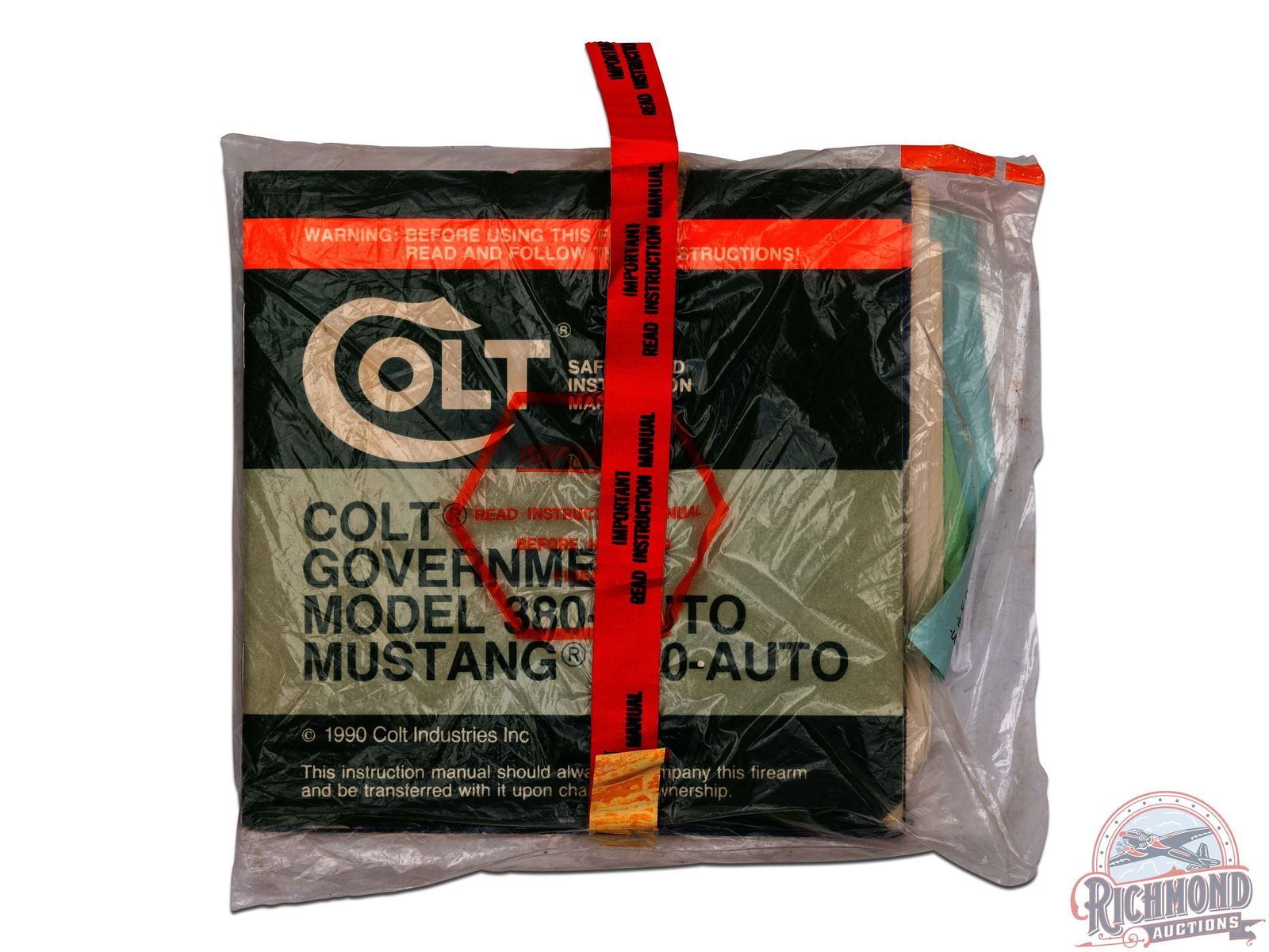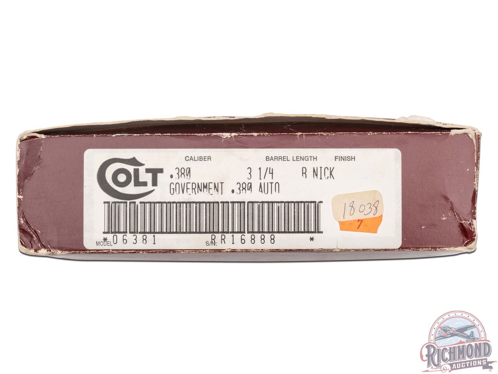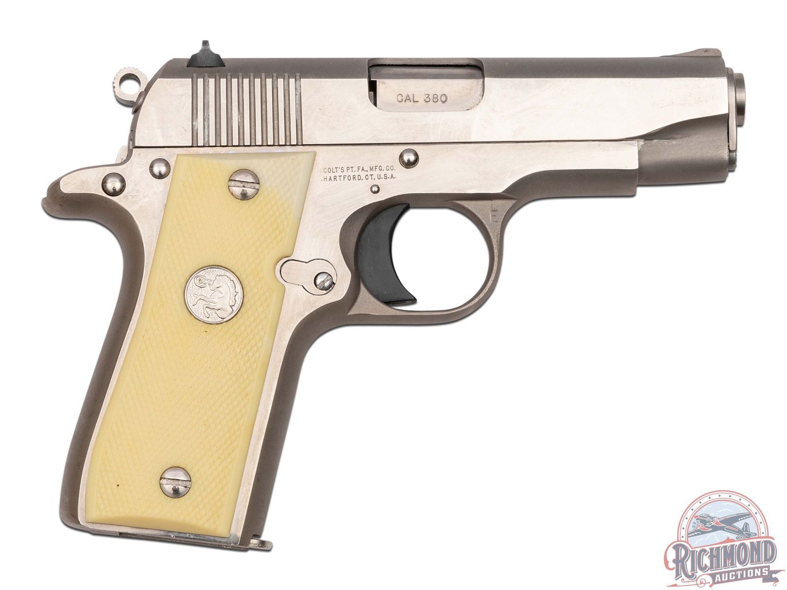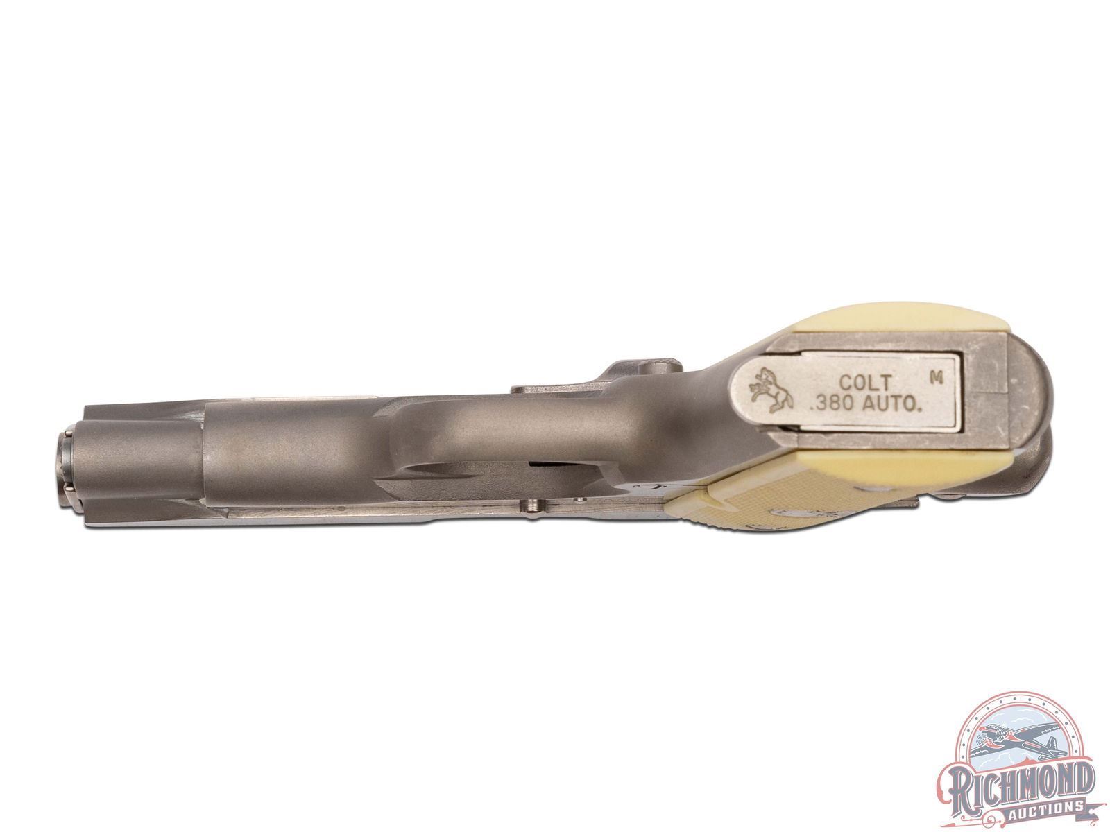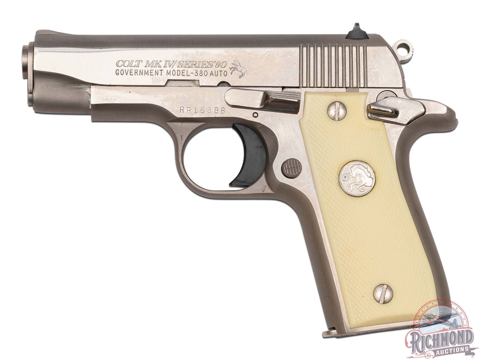 Manufactured in 1990 by Colt. This rare finished pistol features a 3-1/4" barrel, rear notch and front ramp sights. Bright nickel finish with satin top and undersides. Left side of the slide is stamped "COLT MK IV/ SERIES '80 / GOVERNMENT MODEL 380 AUTO" with the Rampant Colt logo and serial number stamped on the frame below. Left side of the frame has the two-line Colt address. Manual left side thumb safety, black serrated trigger and Commander style hammer. Fitted with factory Colt ivory tone checkered synthetic grip panels with silver Colt medallions. Includes two Colt stamped 7-round nickel magazines. Comes in the original factory box with factory paperwork. CALIBER: 380 ACP. S/N: RR16888. FFL STATUS: Modern.