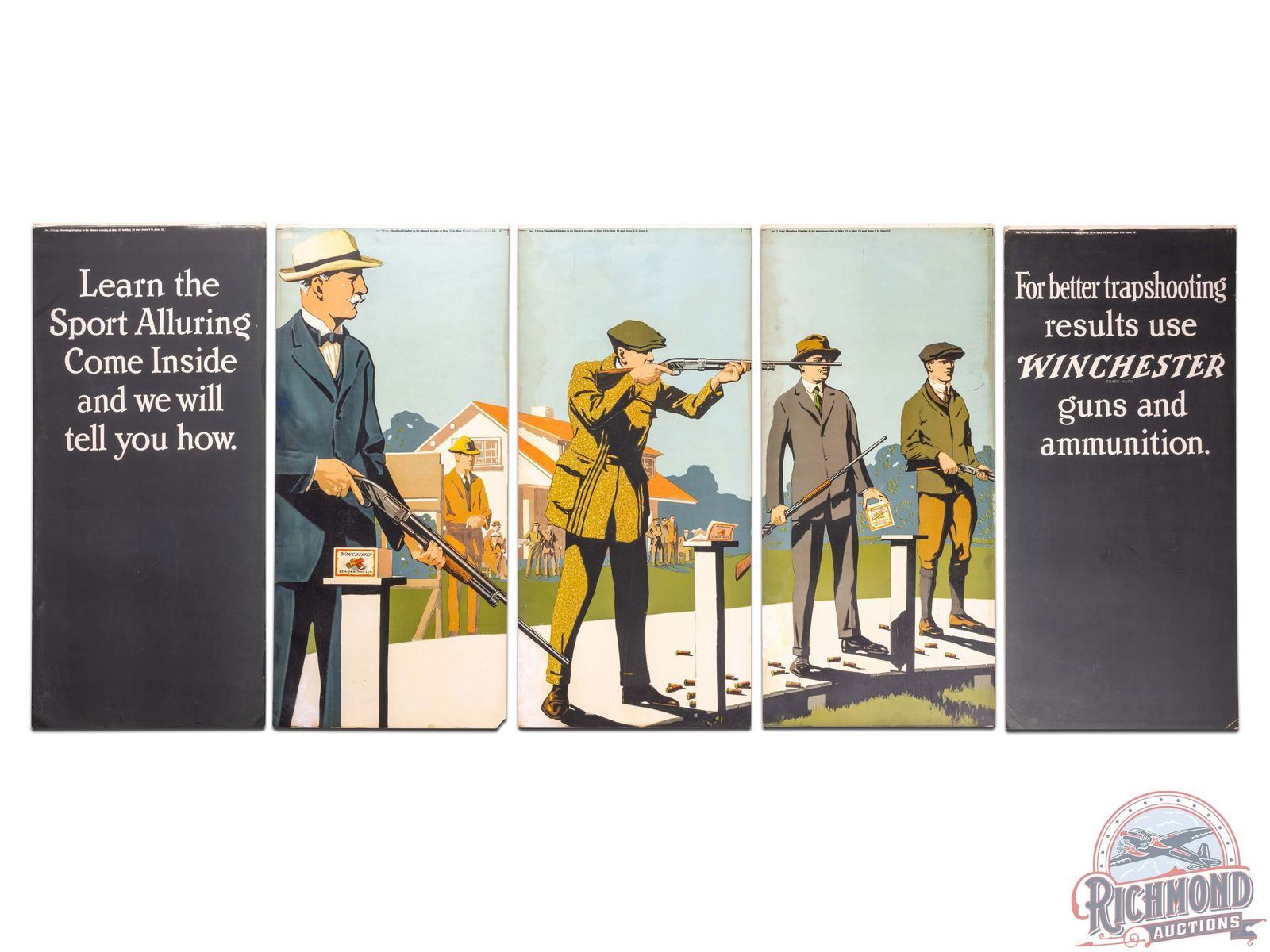Complete double sided Winchester five panel display. Front side features the "Better Trapshooting" scene with multiple shotguns/shotshell boxes and was displayed from May 12-18, 1921 and used again from June 9-15, 1921. The reverse graphic features the "A Handy Light" scene with flashlights/batteries and was displayed May 26 to June 1, July 7-13 and October 6-12, 1921. Panels have very good color with creases, areas of loss around the edges/corners, a few touch ups and areas of discoloration. This is an earlier example of a tough to fine complete five panel display. 39.5" H x 92.5" W.