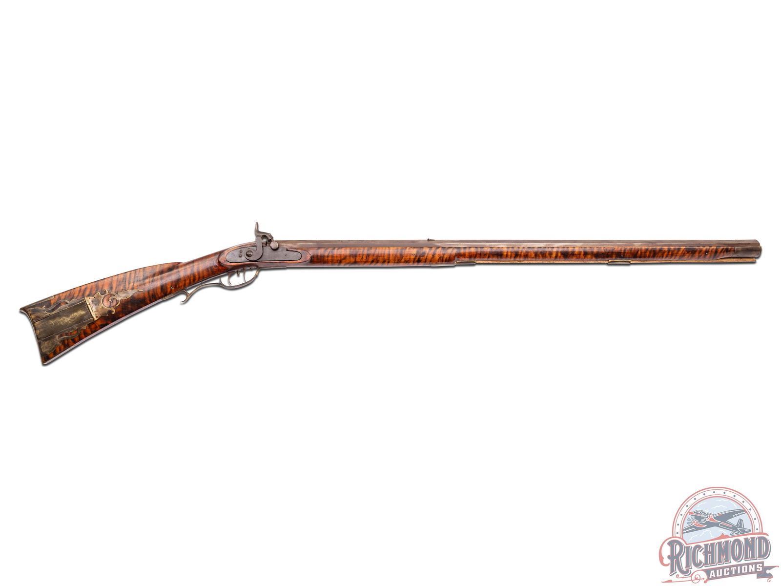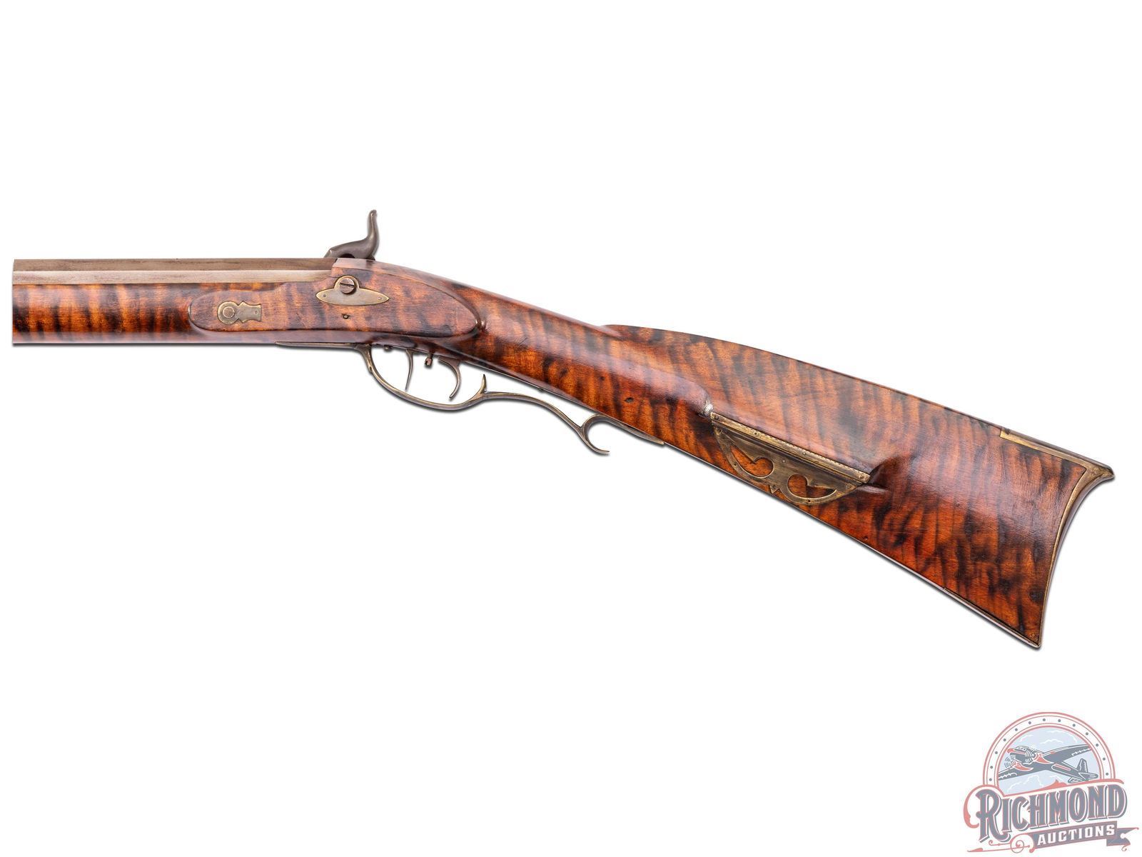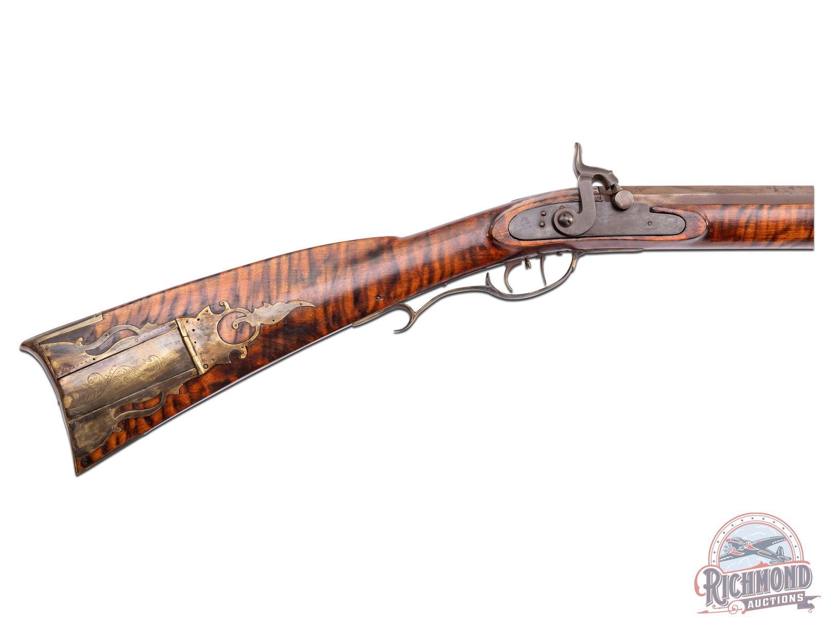 Kentucky percussion rifle made in Hazelton, Pennsylvania, circa 1850. Rifle measures 48" overall with 32-1/4" octagon smoothbore barrel in 45 caliber with hunting sights (missing front) and signed in script "C.H." Unmarked percussion lock with double set trigger control. Full curly maple stock with brass hardware including pierced brass cheek inlay, an engraved four piece patchbox with three piercings, floral engraved lid and trademark "Face" finial. Replaced hardwood ramrod. CALIBER: 45. FFL STATUS: Antique.