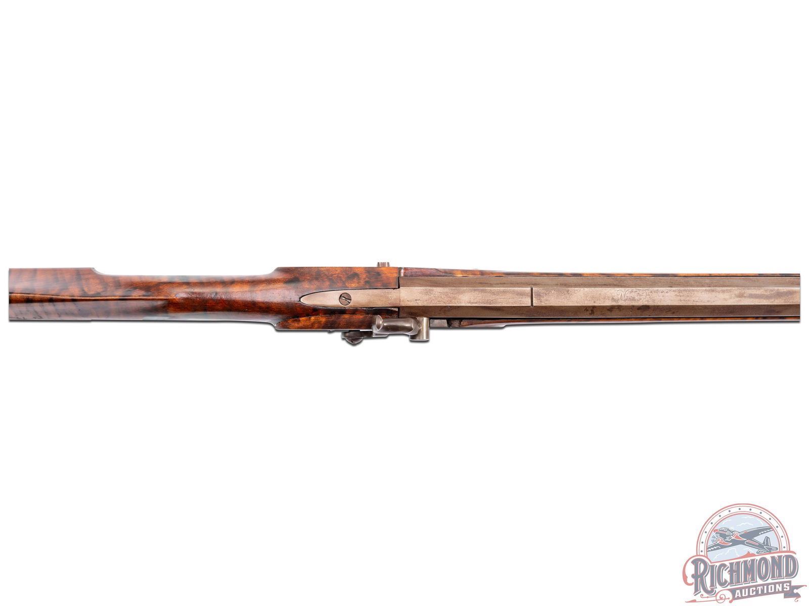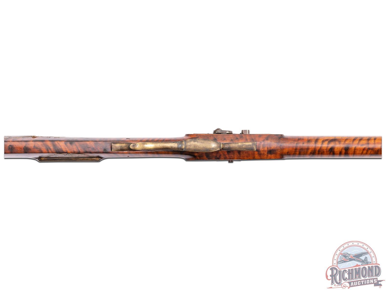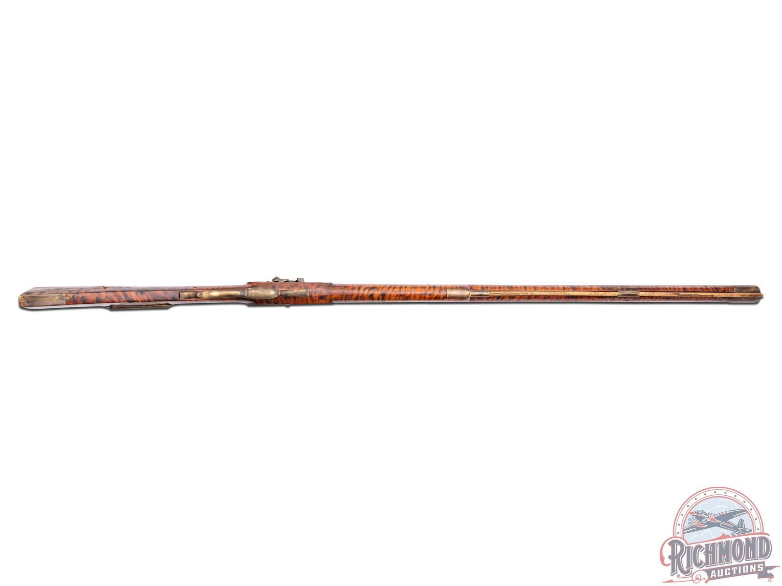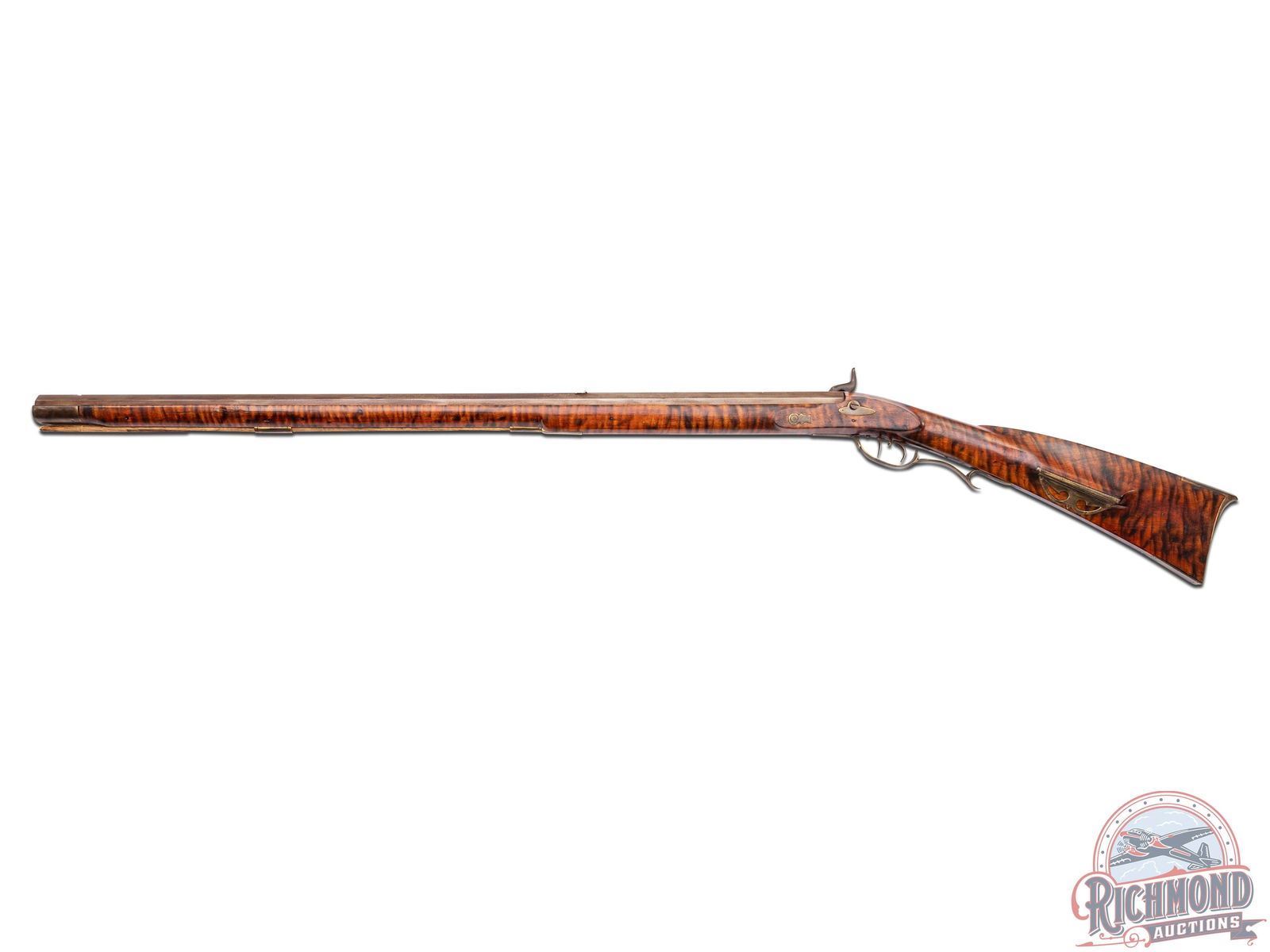 Kentucky percussion rifle made in Hazelton, Pennsylvania, circa 1850. Rifle measures 48" overall with 32-1/4" octagon smoothbore barrel in 45 caliber with hunting sights (missing front) and signed in script "C.H." Unmarked percussion lock with double set trigger control. Full curly maple stock with brass hardware including pierced brass cheek inlay, an engraved four piece patchbox with three piercings, floral engraved lid and trademark "Face" finial. Replaced hardwood ramrod. CALIBER: 45. FFL STATUS: Antique.