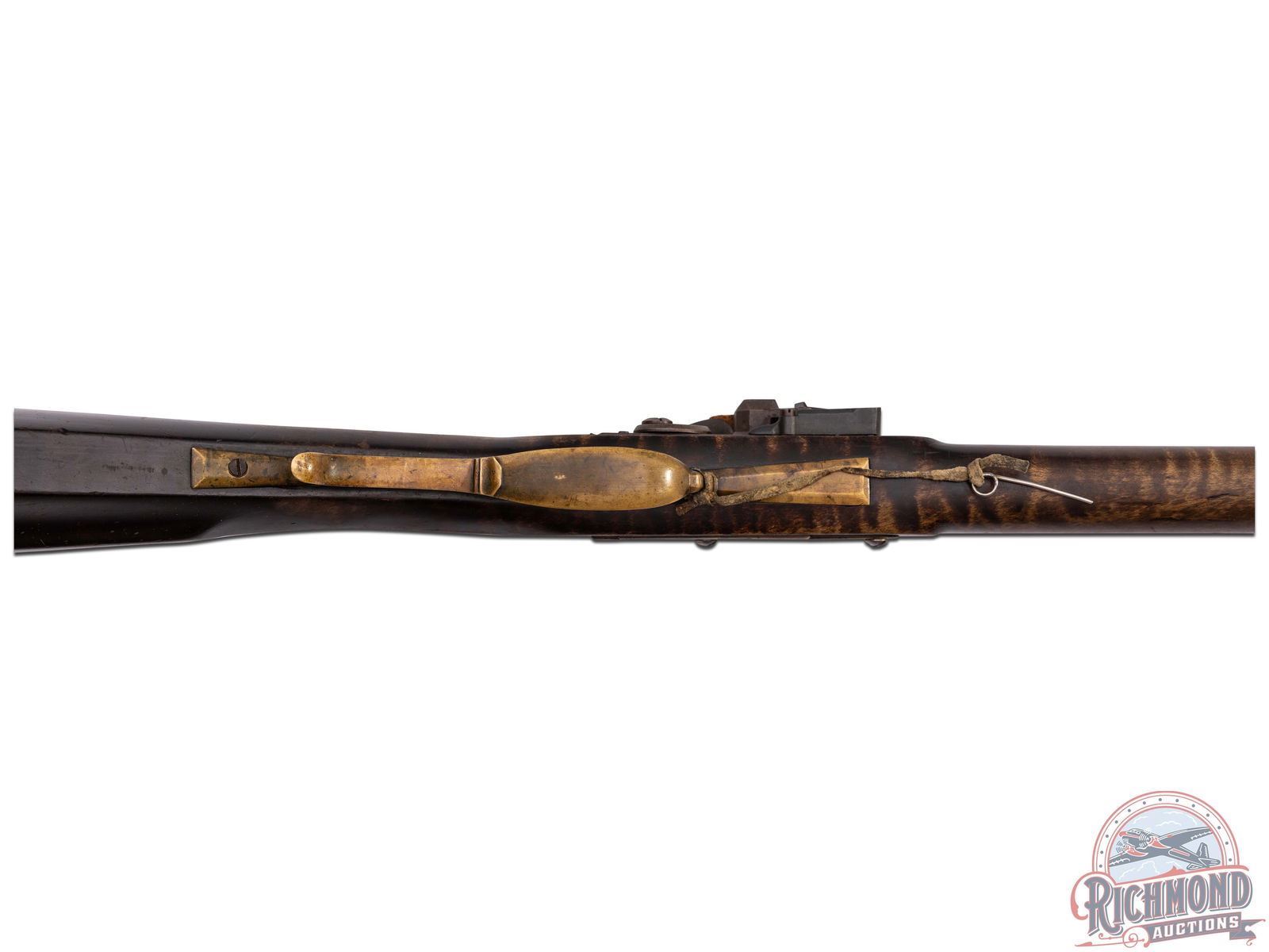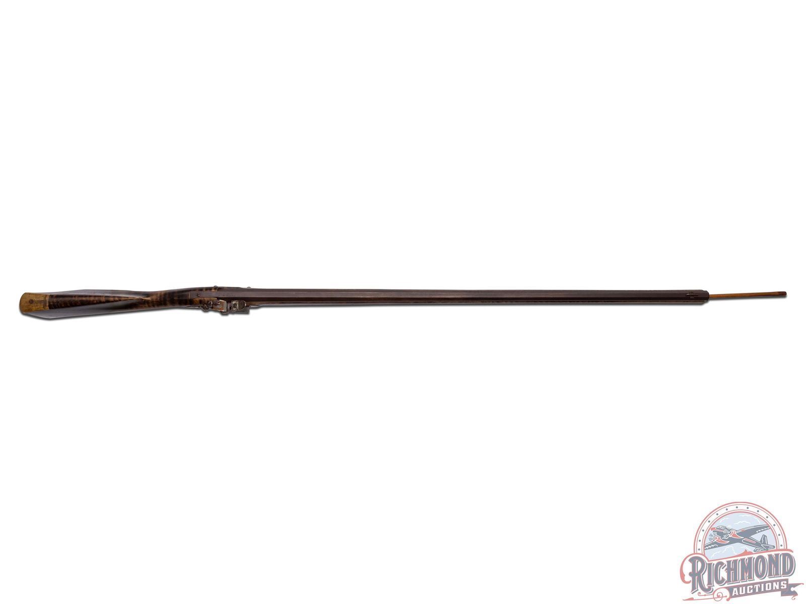 Contemporary flintlock rifle built in J.P. Beck style by an unknown gunsmith, circa 1980. Rifle measures 58" overall with a 41-3/4" octagon 69 caliber smoothbore barrel with single blade front sight. Siler style flintlock with single turned tail trigger. Full curly maple stock with 2" wide butt stock done in Beck style architecture with brass hardware. Rifle comes with touch hole pic and hardwood ramrod. CALIBER: 69. FFL STATUS: Antique.